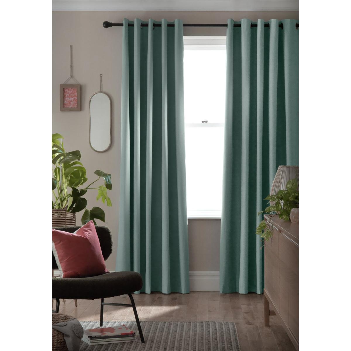 Need a nice dark room to get a good night's sleep? Yep, so do we. That's why we love this pair of blackout curtains. They're help keep the light out, making sure you get a decent rest all year round. We've chosen an eyelet header to give them soft, wide folds and for ease of installation. There's no fiddling required with eyelets, simply slot them onto the curtain pole and you're done. Soft handfeel. Duck egg Plain Design. Silver Stainless Steel Eyelets. Features Blackout. Made from 52% polyester and 48% cotton. Unlined. Dimensions Size 117cm (46 inches) wide by 137cm (54 inches) drop. Width refers to one curtain panel before hanging. Eyelet diameter: 4cm. General information Contains one pair of curtains. Suitable for curtain poles. Curtain pole not included. Machine washable. General Information: We are excited to be welcoming some of our favourite HOME products into the Habitat range. Your product may arrive in Habitat or HOME packaging.