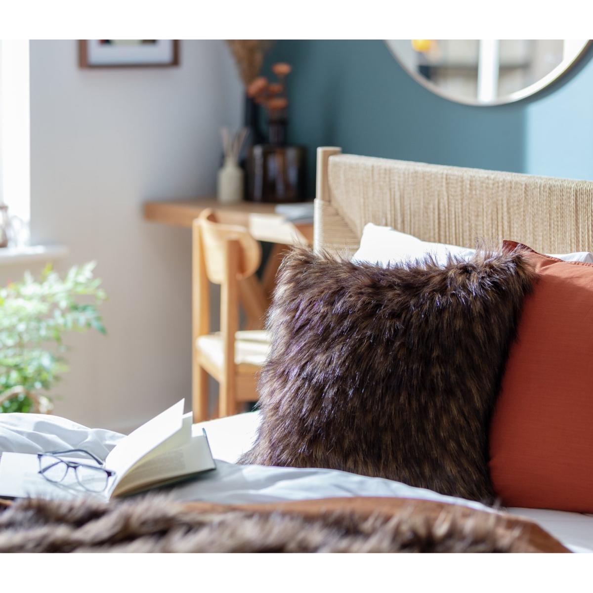 This faux fur cushion adds instant cosy appeal to any living space, thanks to its rich, plush texture and warm brown tones. I love how versatile it is-perfect for both modern and traditional interiors, especially when layered with other cushions in similar earthy hues or textured fabrics. It works well in neutral schemes but can also bring warmth to more colourful or patterned sofas. For styling, try pairing it with a smooth linen or cotton cushion for contrast, and keep it as a statement piece on your sofa or armchair to add both comfort and visual interest. Its size makes it a great detail to refresh smaller seating areas or bed accents, offering a quick way to elevate the overall ambiance.
