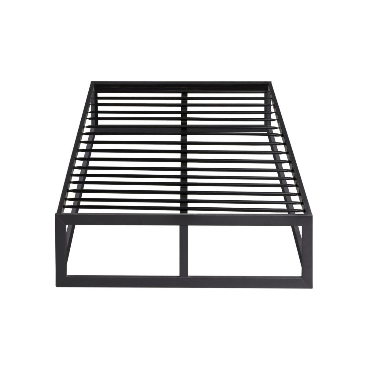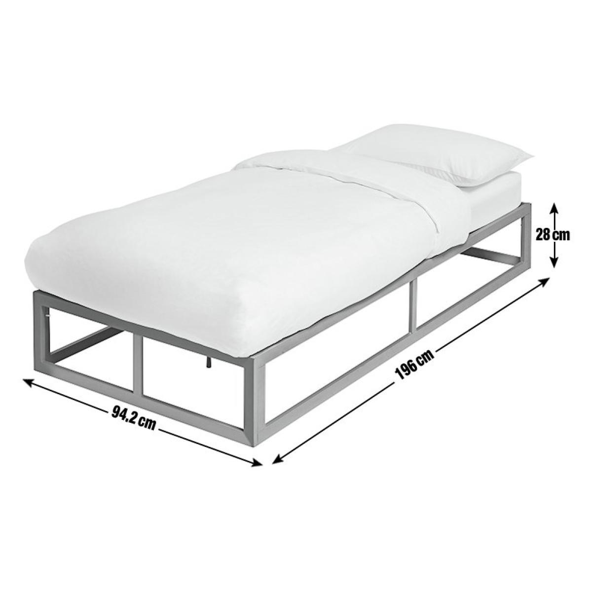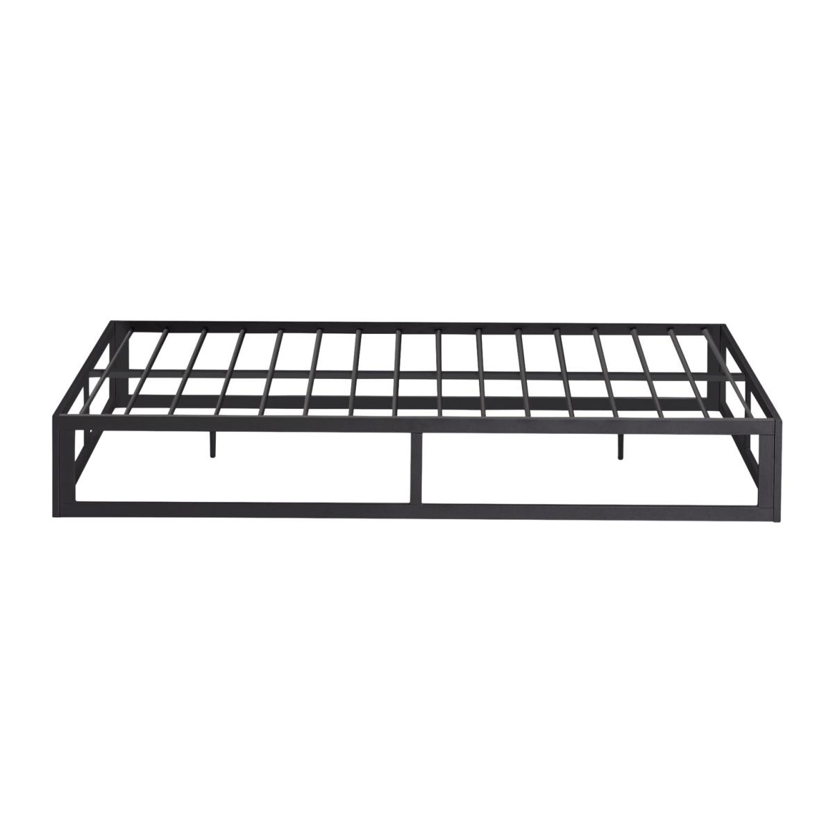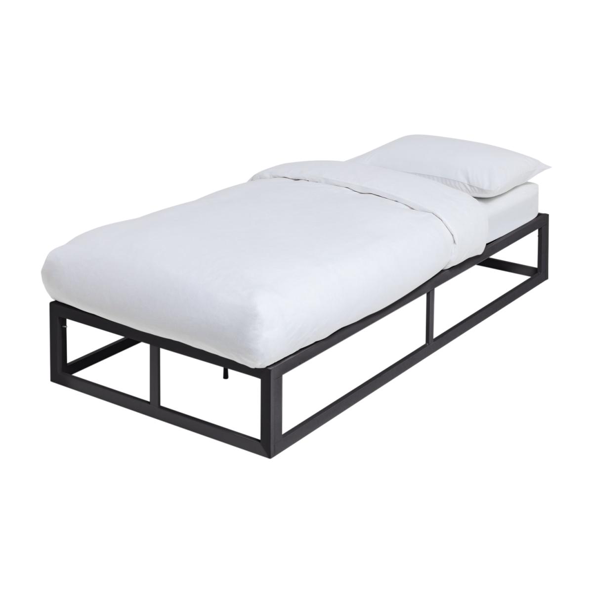 A simple black metal bedframe is all you need to create your own bedroom style. Its unfussy linear design gives it a contemporary look. Metal slats provide firm support for a single mattress and allows air to circulate for a healthier sleep. Part of the Platform collection. Metal frame. Base with metal slats. Size W94.2, L196, H28cm. Height to top of siderail 268cm. Weight 14.5kg. Total maximum user weight 110kg. Self-assembly - 2 people recommended. Package Dimensions: Package 1 dimensions: H10.5, W31.5, D205cm. General Information: We are excited to be welcoming some of our favourite HOME products into the Habitat range. Your product may arrive in Habitat or HOME packaging. Manufacturer's 2 year guarantee.