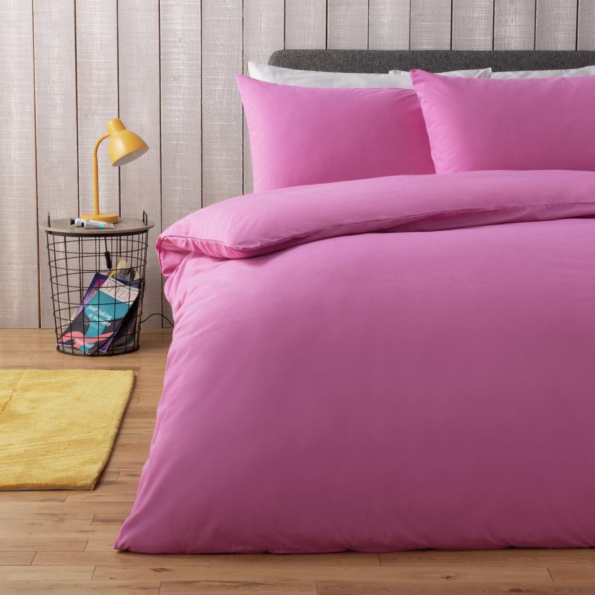 A great way to refresh your bedding, this bedding cover set offers exceptional value for money. In a bold shade of pink, its plain, minimalist design provides a calming effect for your bedroom. Easy to care for, it can be machine washed and tumble dried when it needs freshening up. This item carries the STANDARD 100 by OEKO-TEX logo, which means you can be certain that every component has been tested for harmful substances and is therefore harmless to human health. Finish: woven. 52% polyester , 48% cotton, 1006619% cotton and polyester. 1006619% cotton and polyester, 1006619%cotton and polyester, 1006619%cotton and polyester. 144 thread count. Set includes 1 duvet cover and 1 pillowcase. Bed size: toddler. Length 150cm, Width 120cm. Reversible. Buttons for fastening. Standard pillowcase (s). Pillow case length 60cm, Width 40cm. Machine washable at 40 C. Suitable for tumble drying.