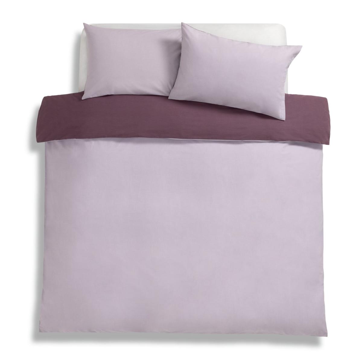 You'll love our woven purple bedding set. Including cotton recognised by the world sustainability programme, the Better Cotton Initiative. It is soft, smooth and designed for a comfortable night's sleep. And with a reverse palette, simply turn down the duvet for a little contrast. Or flip to instantly lighten or darken your colour dynamic. This item carries the STANDARD 100 by OEKO-TEX logo, which means you can be certain that every component has been tested for harmful substances and is therefore harmless to human health. Finish: woven. 52% polyester , 48% cotton. 144 thread count. Set includes 1 duvet cover and 1 pillowcase. Bed size: single. Length 200cm, Width 135cm. Reversible. Buttons for fastening. Standard pillowcase (s). Pillow case length 75cm, Width 50cm. Machine washable at 40 C. Suitable for tumble drying.