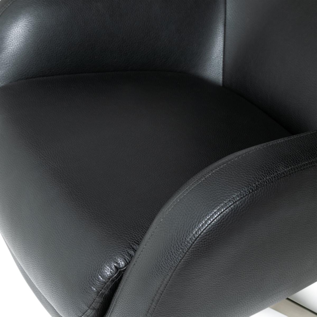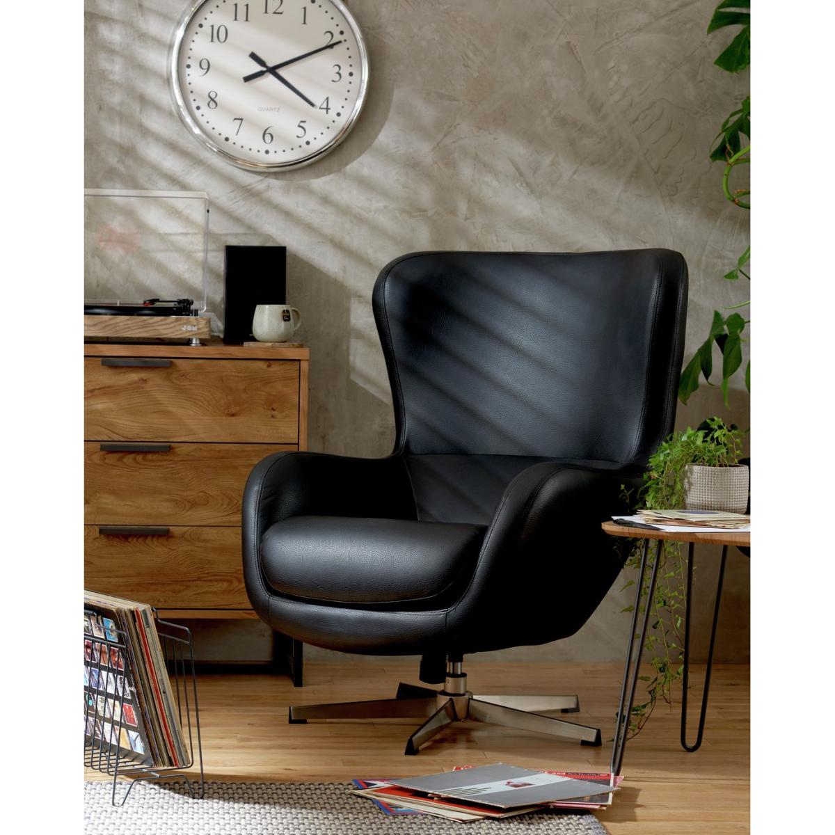 Take a twirl in handsome Habitat Porto. Enjoy a 360 degree view from this super stylish swivel chair without getting up or straining your neck. Sink into the soft foam filled seat and relax into the deep curved back. It's high enough to rest your head and support your neck. Perfect for your posture. Covered in smart, black polypropylene with chrome feet, this modern statement piece will settle nicely into most decors. Assembling this seat is easy, just fix on the feet and it's ready to swivel. Good looking and easy to live with, all this swivel chair needs is an occasional wipe clean. Part of the Porto collection. Material:PU. Made from 100% polyurethane. Metal feet. Fixed seat with foam filling. Fixed cushion(s) with foam filling. Dimensions: Size H105, W89, D80cm. Floor to seat height: 45cm. Depth of seat: 56cm. Height of seat back: 45cm. Width of seating area between arms: 56cm. Height of arm rest: 41cm. Weight 20.8kg. Wipe clean. Self-assembly. Maximum individual user weight 110kg. Packaged dimensions:Package size H86, W89, D80cm. General information:We are excited to be welcoming some of our favourite HOME products into the Habitat range. Your product may arrive in Habitat or HOME packaging. Manufacturer's 2 year guarantee.