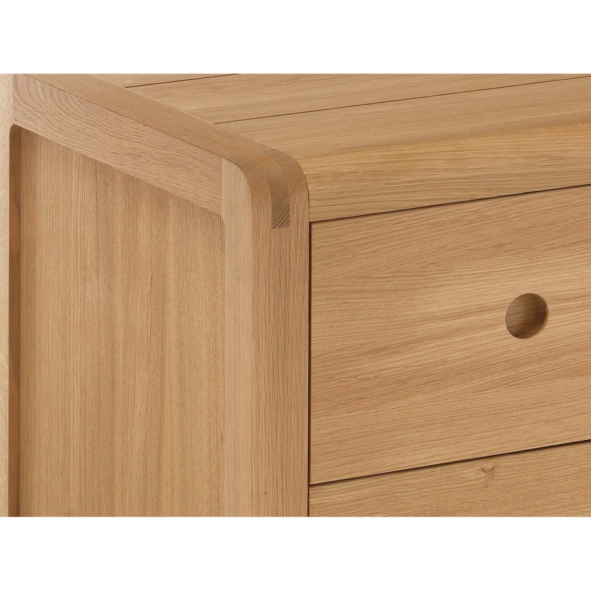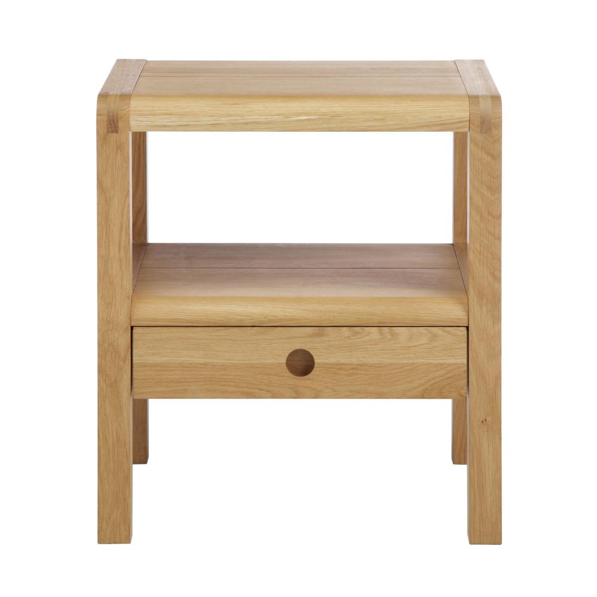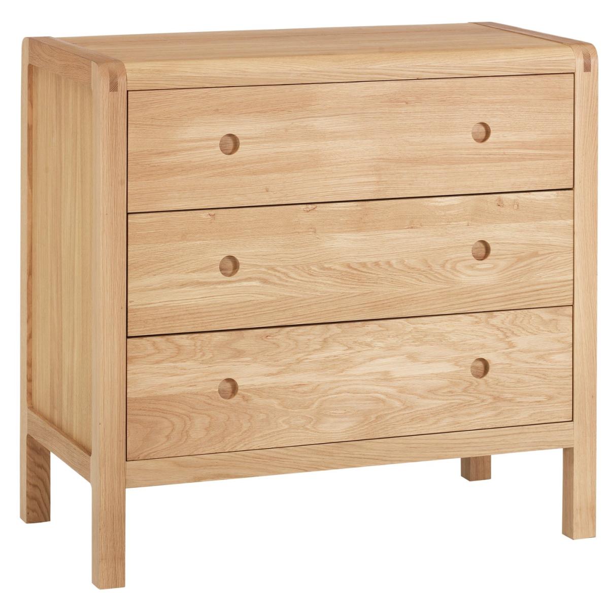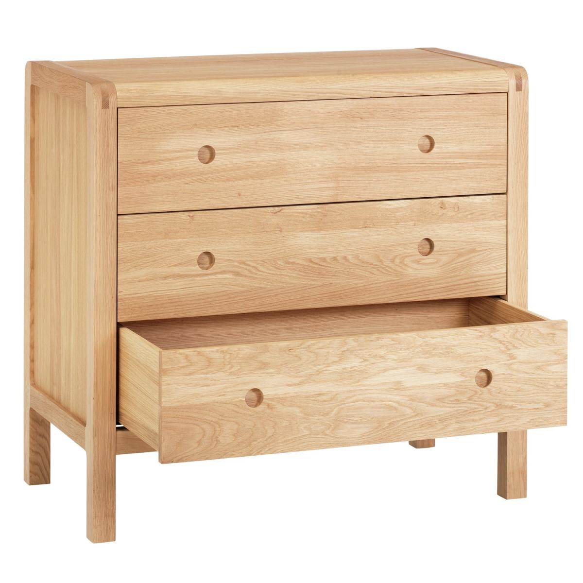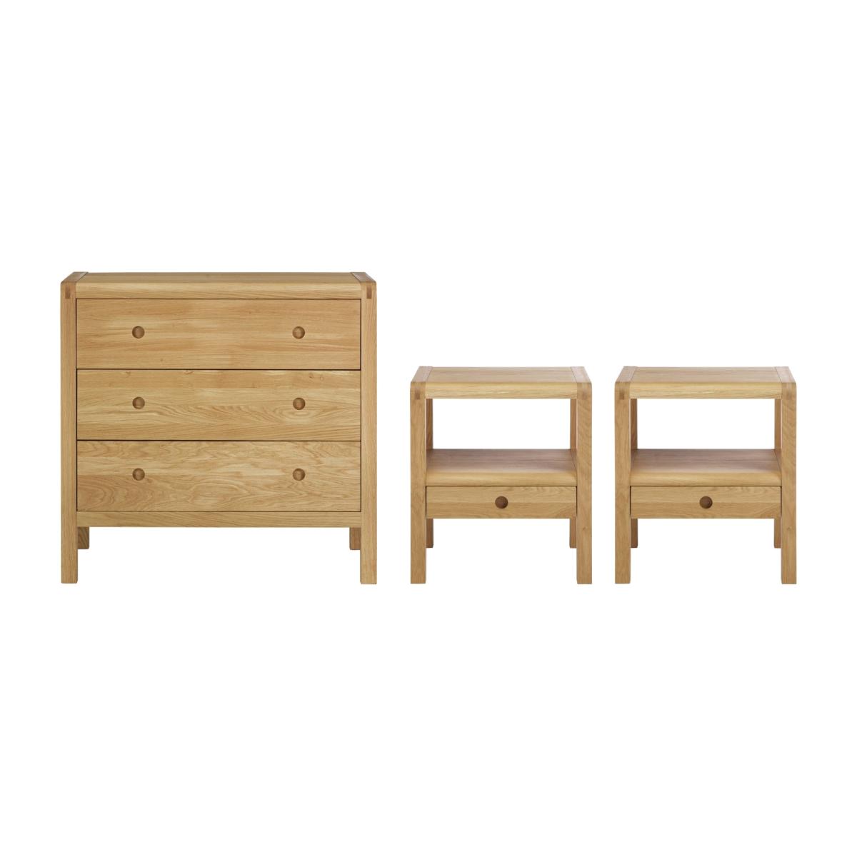 In 100% solid oak, with a lovely light oak veneer, our 3 piece set brings the beauty of natural wood grain to your bedroom. The chest and 2 bedside tables are bright and light in tone. Simply stunning. Great looks. Plus as a set they look great and function perfectly. Plenty of room for folding clothes and keeping bedside mess to a minimum. Designed to work with any of today's on trend styles, choose to blend Radius with a clean and fresh vibe or velvety luxe look. Your call entirely. With 3 roomy drawers the chest offers ample storage while 2 open-shelf bedside stands offer plenty of space for books and bits. Pop messy items like ear pods, glasses or phone into the neat under drawer, great to keep things tidy. Style the tops with lamps, vases and favourite pieces. Stunning solid oak bedroom furniture at its finest. Part of the Radius collection. Chest of drawers: Size H86, W90, D49cm. 3 drawers. Self-assembly - requires 2 people (wall fixings included). Weight 49kg. Bedside table: 2 bedside table(s). Size H55, W49, D37.6cm. Internal drawer size H4, W39, D31cm. 1 drawer. Fully assembled requires 1 person. Weight 12kg. General information: Made from oak and oak veneer. If this product is over 60cm high it must be securely attached to the wall to prevent overturning. Drawers in this unit have wooden runners. FSC certified meaning the materials used for this product are responsibly sourced. Manufacturer's 1 year guarantee.