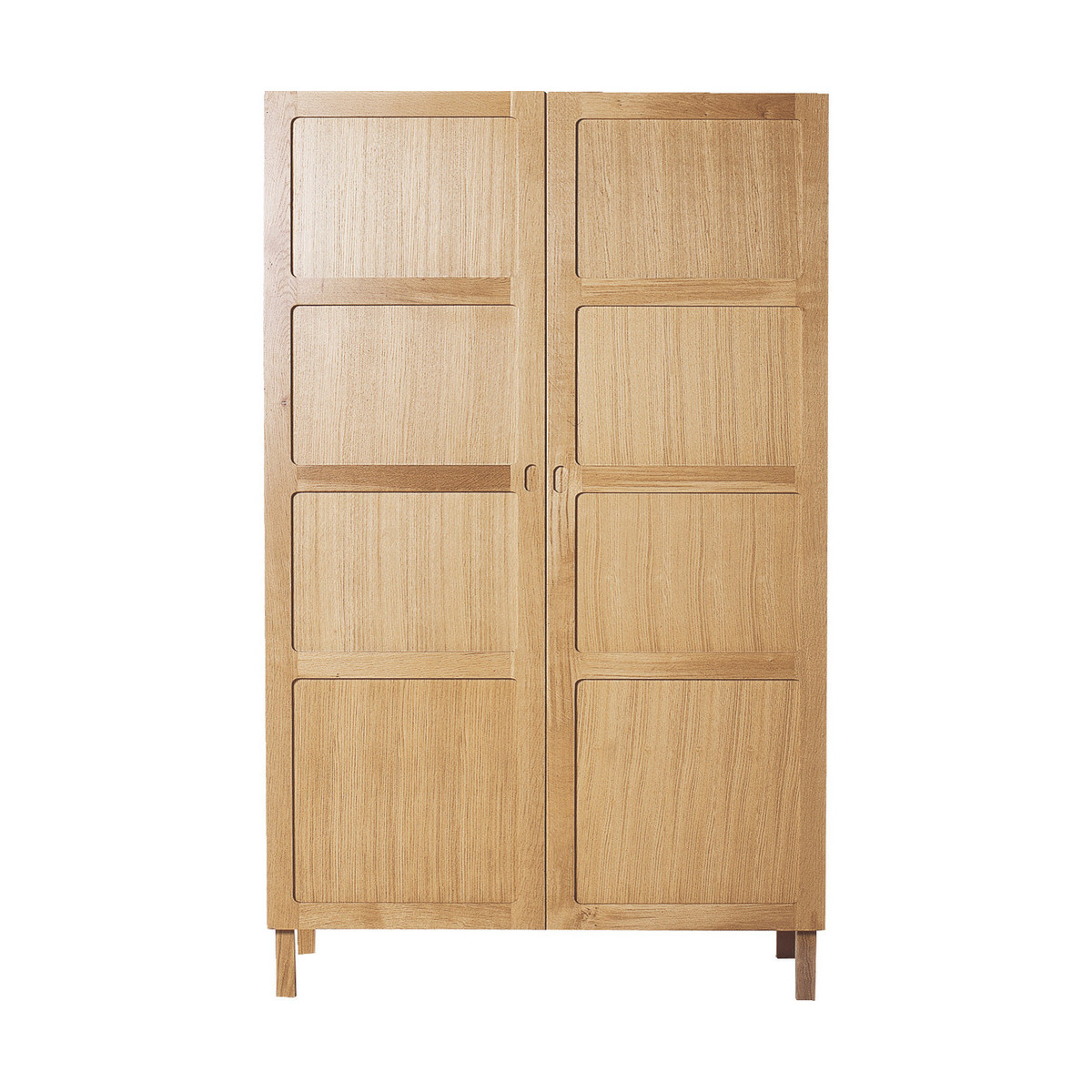 This understated and timeless Radius oak 2 door wardrobe with 1 hanging rail and 4 shelves is beautifully crafted from lacquered solid oak and oak veneer. It features recessed door handles and joined in traditional methods. The bridle joint construction is a carpenter's joint that allows for a corner connection that is very strong in all directions and needs no additional bracing. Part of the Radius collection. Made of oak and oak veneer. FSC certified wood. 2 doors. 1 fixed hanging rail. 5 fixed shelves. Self-assembly - 2 people recommended (includes wall fixings). If this product is over 60cm high it must be securely attached to the wall to prevent overturning. Dimensions: Size H200, W120, D59cm. Weight 136kg.