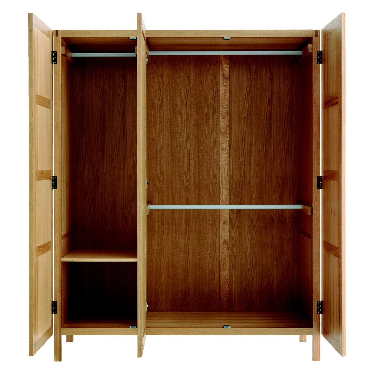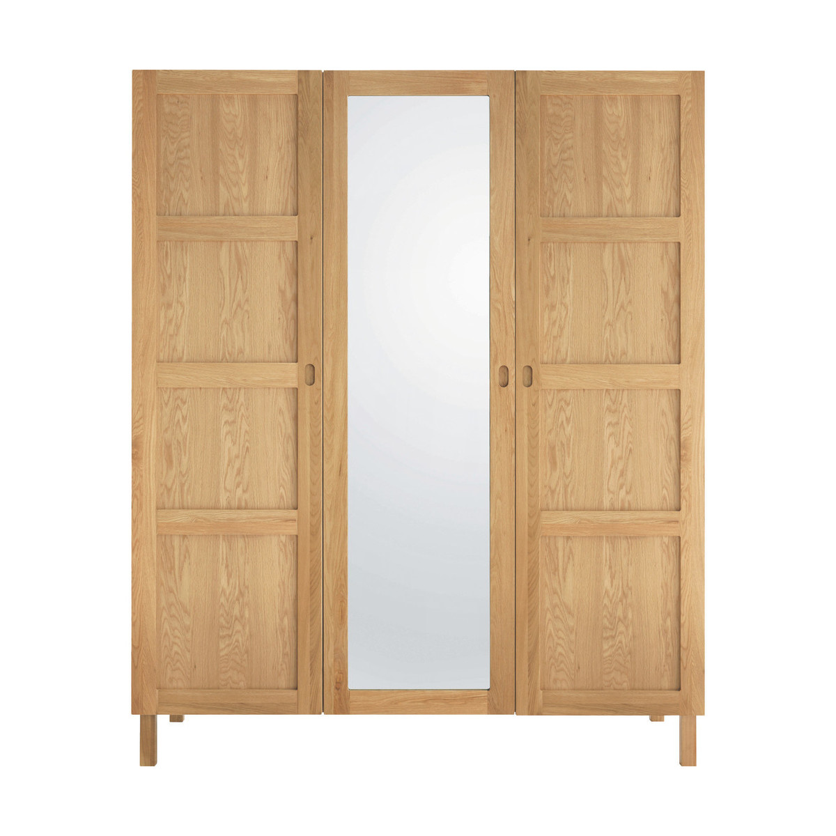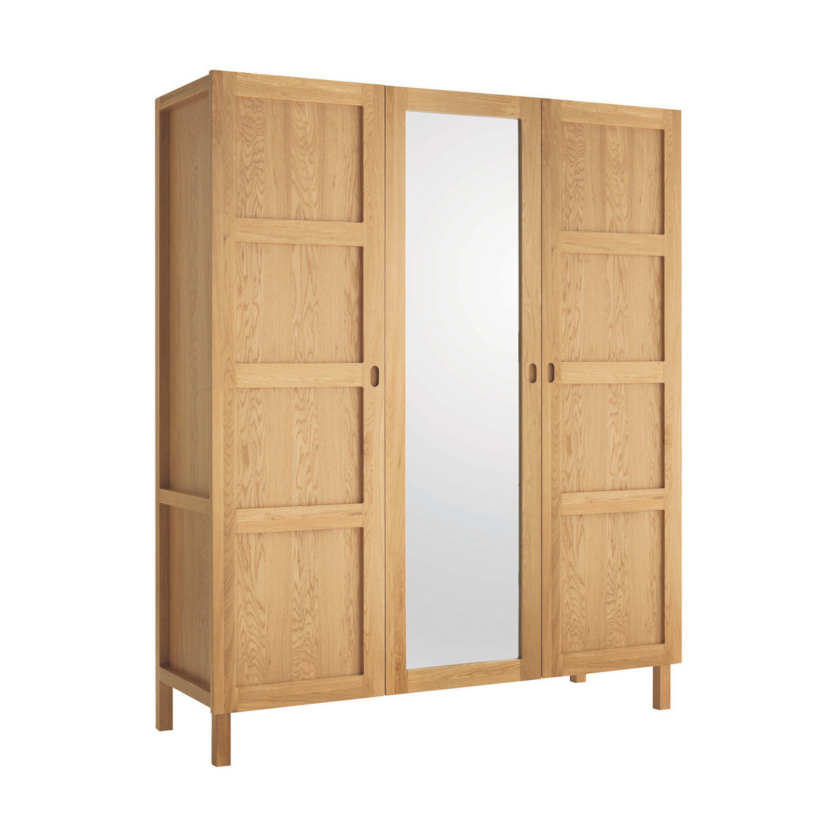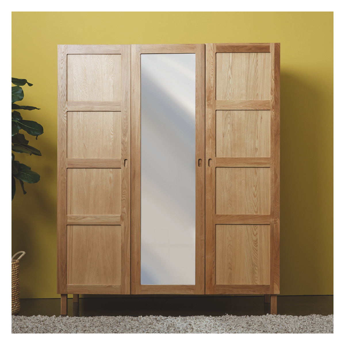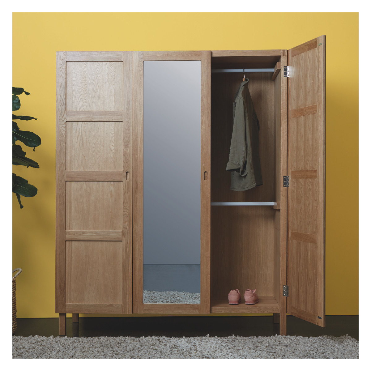 This understated and timeless Radius oak 3 door wardrobe with full length mirror, 3 hanging rails and shelf is beautifully crafted from lacquered solid oak and oak veneer. It features recessed door handles and joined in traditional methods. The bridle joint construction is a carpenter's joint that allows for a corner connection that is very strong in all directions and needs no additional bracing.