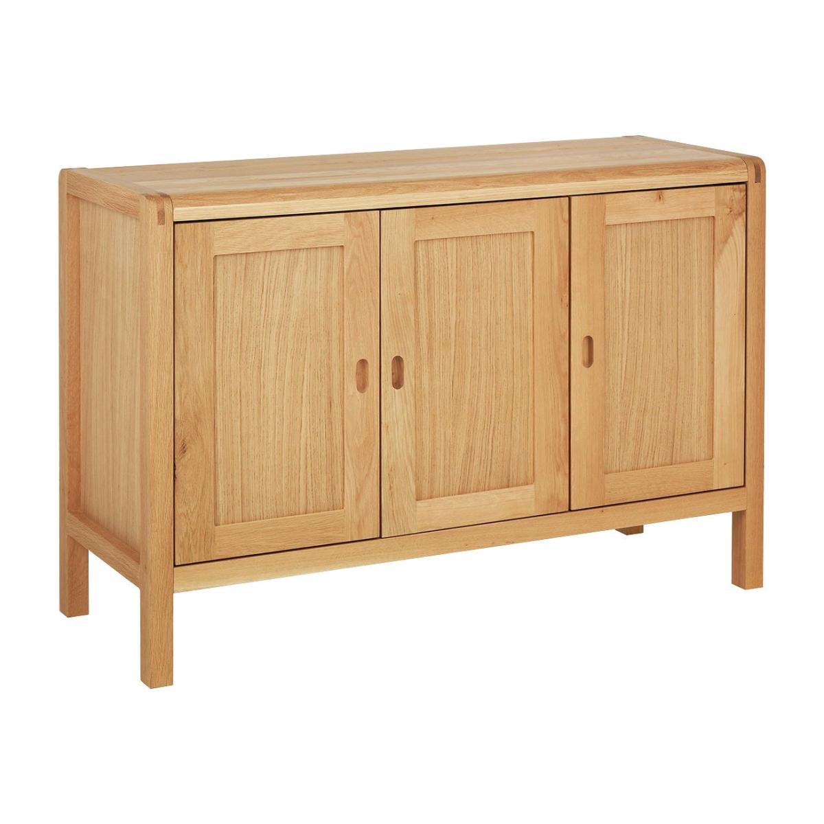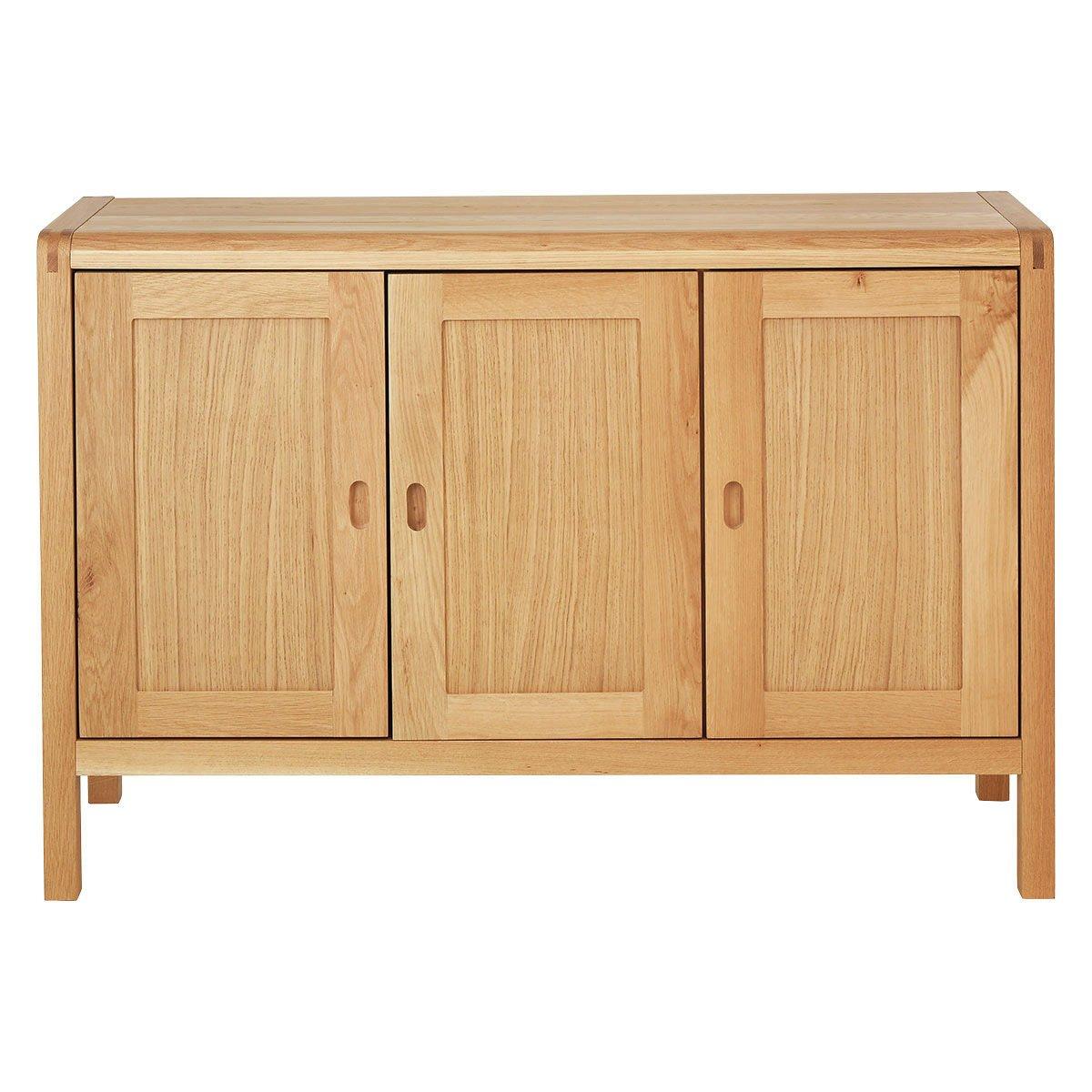 The understated and timeless Radius 3 door oak sideboard with recessed handles is beautifully crafted from lacquered solid oak and oak veneer. The sideboard's rounded corners are joined with traditional bridle joints, a carpenter's joint that allows for a corner connection that is strong in all directions and needs no additional bracing. Part of the Radius collection. Made from oak and oak veneer. Size H 86, W 130.4, D49cm. 3 doors. 4 adjustable shelves. Weight 62kg. Self-assembly - 2 people recommended. Maximum load weight 30kg. If this product is over 60cm high it must be securely attached to the wall to prevent overturning. Package Dimensions: Package 1 dimensions: H16.5, W58, D131.5cm. Package 1 weight: 24kg. Package 2 dimensions: H18.5, W58, D96cm. Package 2 weight: 25kg. Package 3 dimensions: H14, W73, D133.5cm. Package 3 weight: 27kg. General information: Manufacturer's 1 year guarantee. FSC certified meaning the materials used for this product are responsibly sourced.