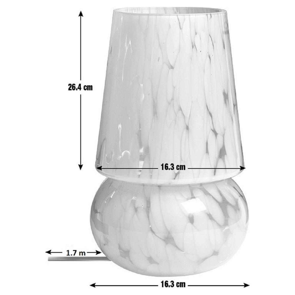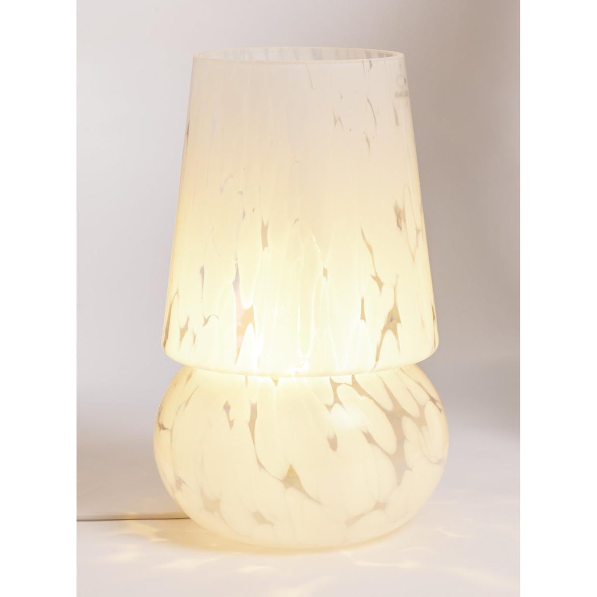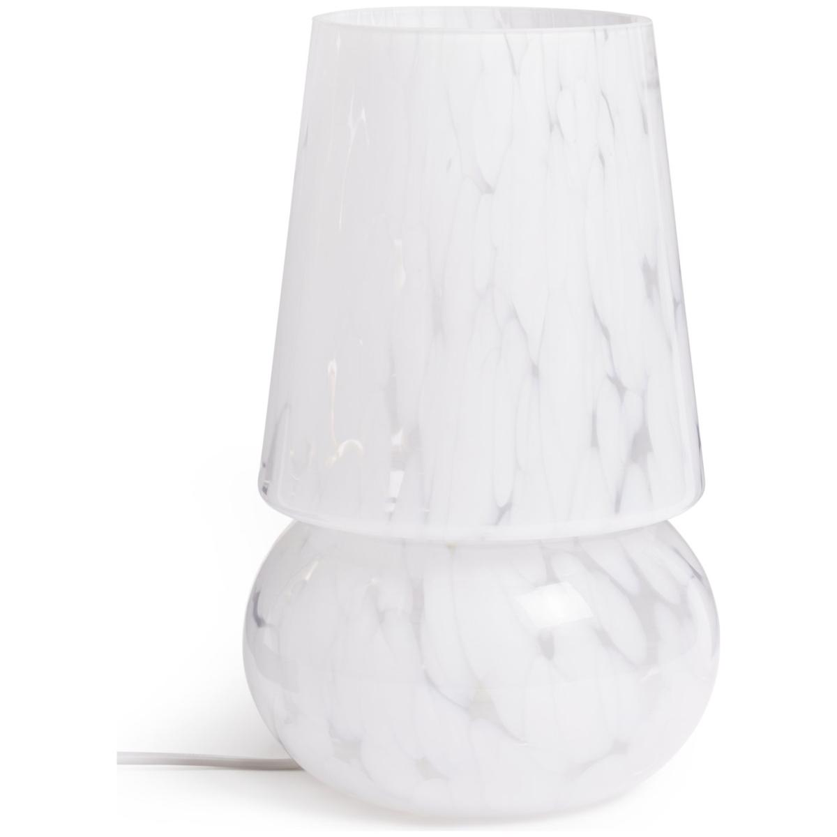 Elegant and expressive lighting. Bring a warm artistic glow to your home with our speckled frosted white glass lamp. The gently curved silhouette has a harmonious flow. Adds an artisan touch to a bedside table, or display a pair for a balanced aesthetic. Dimensions: Overall size H26.4, W16.3, D16.3cm, Diameter 16.3cm. Shade size H26.4, D16.3cm. Diameter of base 16.3cm. Cord length 1.7m. Bulb Information: Bulbs required 1 x candle E14 small edison screw filament LED bulb(s) (not included). Recommended maximum wattage: 7 watts. (bulb not included). LED bulb only. General Information: Shade colour: white. Base colour: white. Shade material: glass. Base material: glass. In-line switch. IP rating 20 - not suitable for bathroom use. Supplied assembled. Product is mains powered plug in. This lighting product is a class 2 fitting. Habitat. Manufacturer's 1 year guarantee.