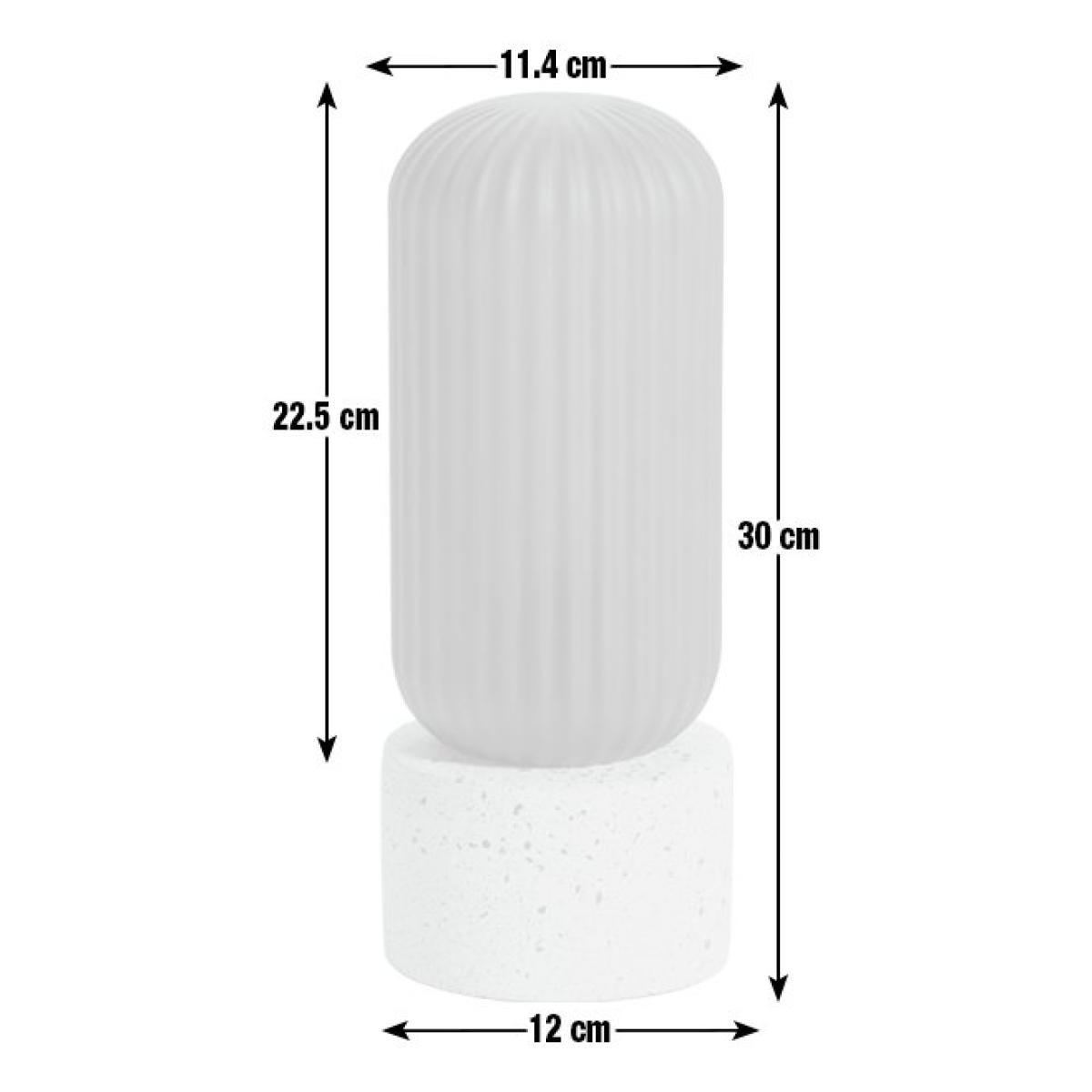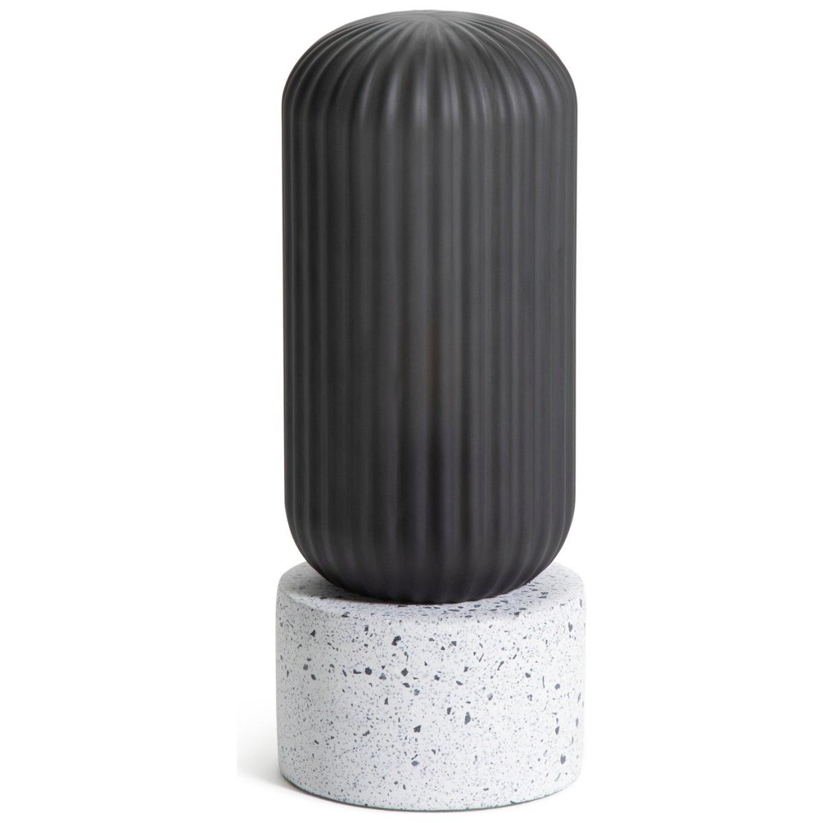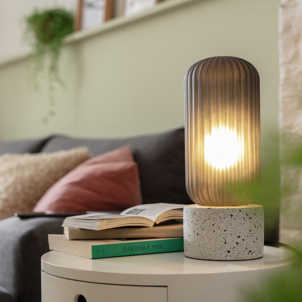 Smoke show. We're head over heels for this hot looking lamp. The smokey ridged glass shade and terrazzo cement base makes a great partnership. Creating a soft, subtle glow, it has a Scandi simplicity that complements any space. Pop it by your bedside or next to your favourite reading nook. This shapely table lamp is all style. With a generous cord length and handy in-line switch, this bright spark works in a range of locations. Dimensions: Overall size H30, Diameter 12cm. Shade size H22.5, D11.4cm. Diameter of base 12cm. Cord length 1.8m. Bulb Information: Bulbs required 1 x classic E14 small edison screw eco halogen bulb(s) (not included). Recommended maximum wattage: 40 watts. General Information: In-line switch. IP rating 20 - not suitable for bathroom use. Minimal assembly. Manufacturer's 1 year guarantee.
