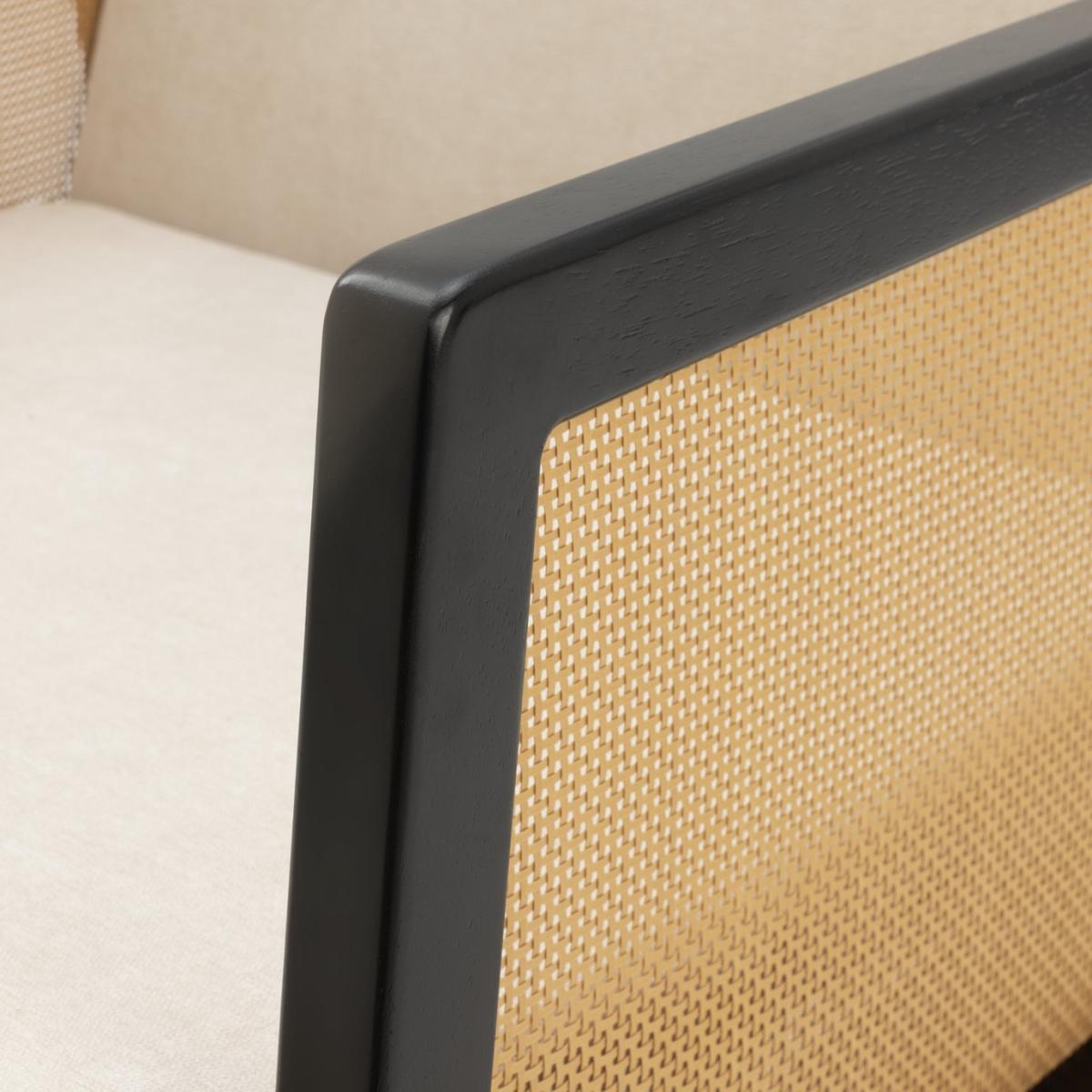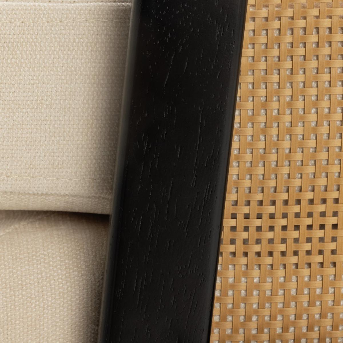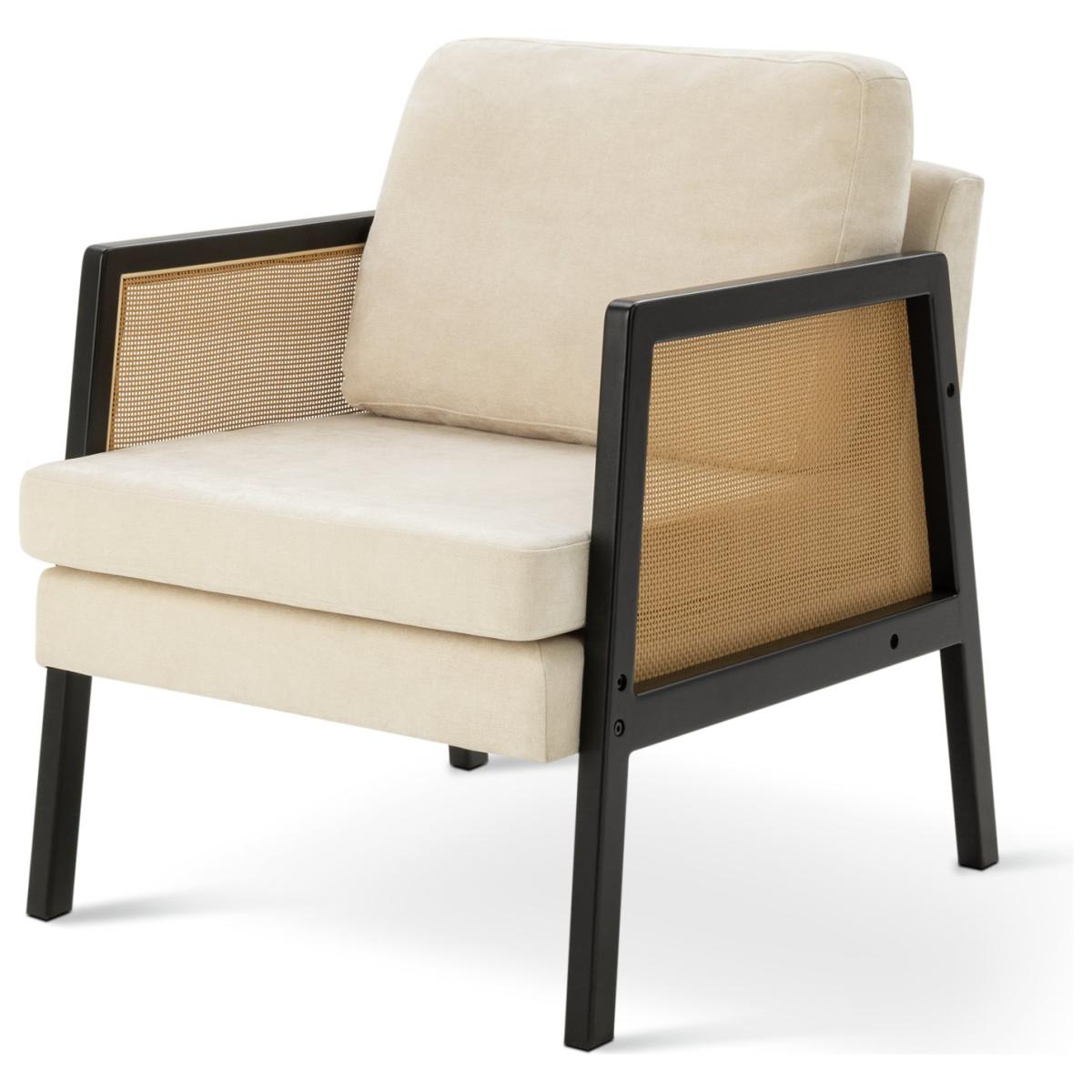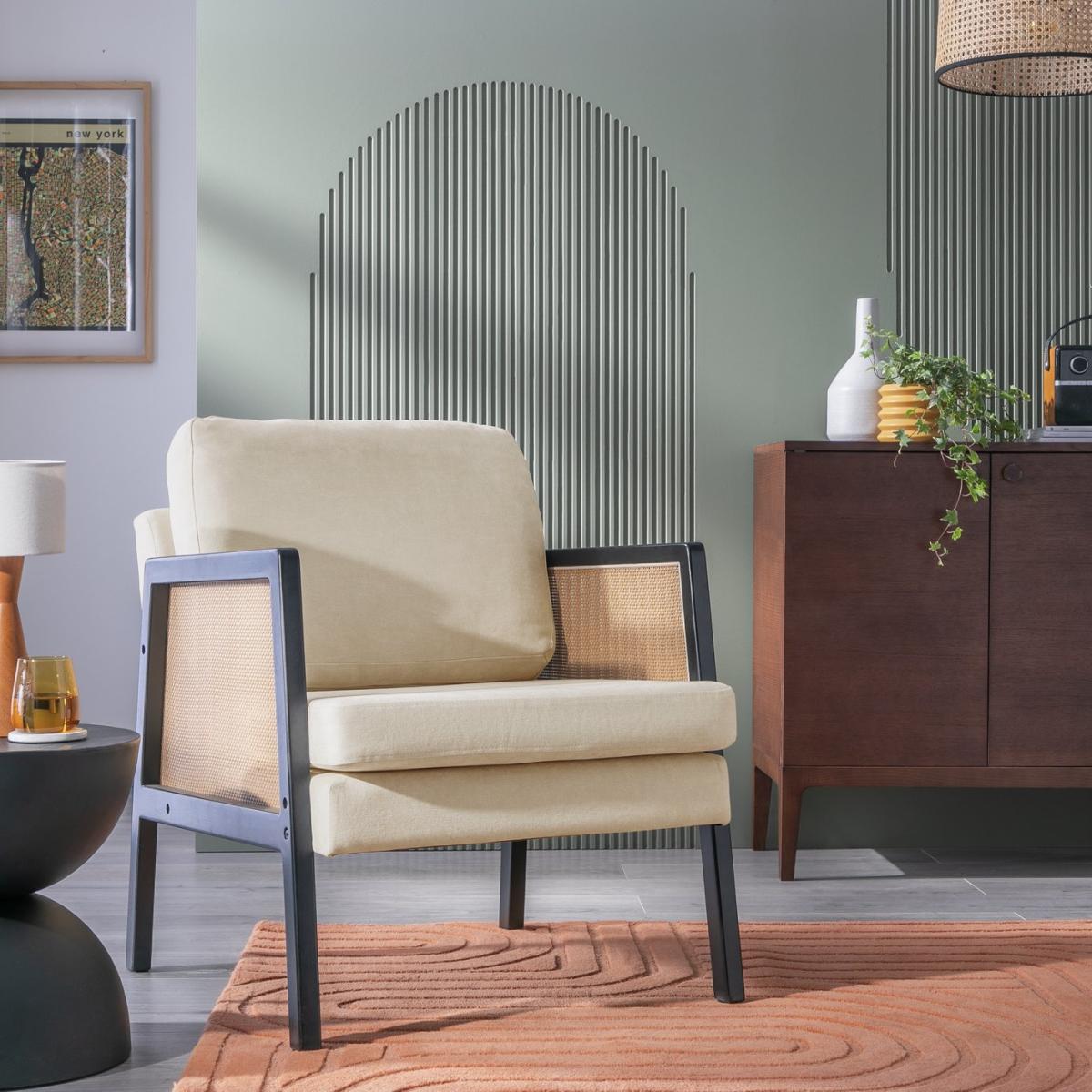 Scandi meets mid-century with this doubly comfortable armchair. Generously padded fibre-filled cushions. A black stained wooden frame elevated by rattan detailing on both arms. Sumptuously upholstered in rich cream fabric. A looker indeed. Nab this seat and make it your own. Material: Made from 100% polyester. Wooden feet. Fixed seat with foam filling. Removable cushion(s) with fibre filling. Dimensions: Size H83, W66, D76cm. Floor to seat height: 46cm. Depth of seat: 60cm. Height of seat back: 70cm. Width of seating area between arms: 60cm. Height of arm rest: 65cm. Weight 14.1kg. Dust or wipe with a damp cloth only. Minimal assembly - just add feet. Maximum individual user weight 110kg. Packaged dimensions: Package size H40, W74, D66cm. FSC certified meaning the materials used for this product are responsibly sourced. General information: We are excited to be welcoming some of our favourite HOME products into the Habitat range. Your product may arrive in Habitat or HOME packaging. Manufacturer's 2 year frame guarantee.