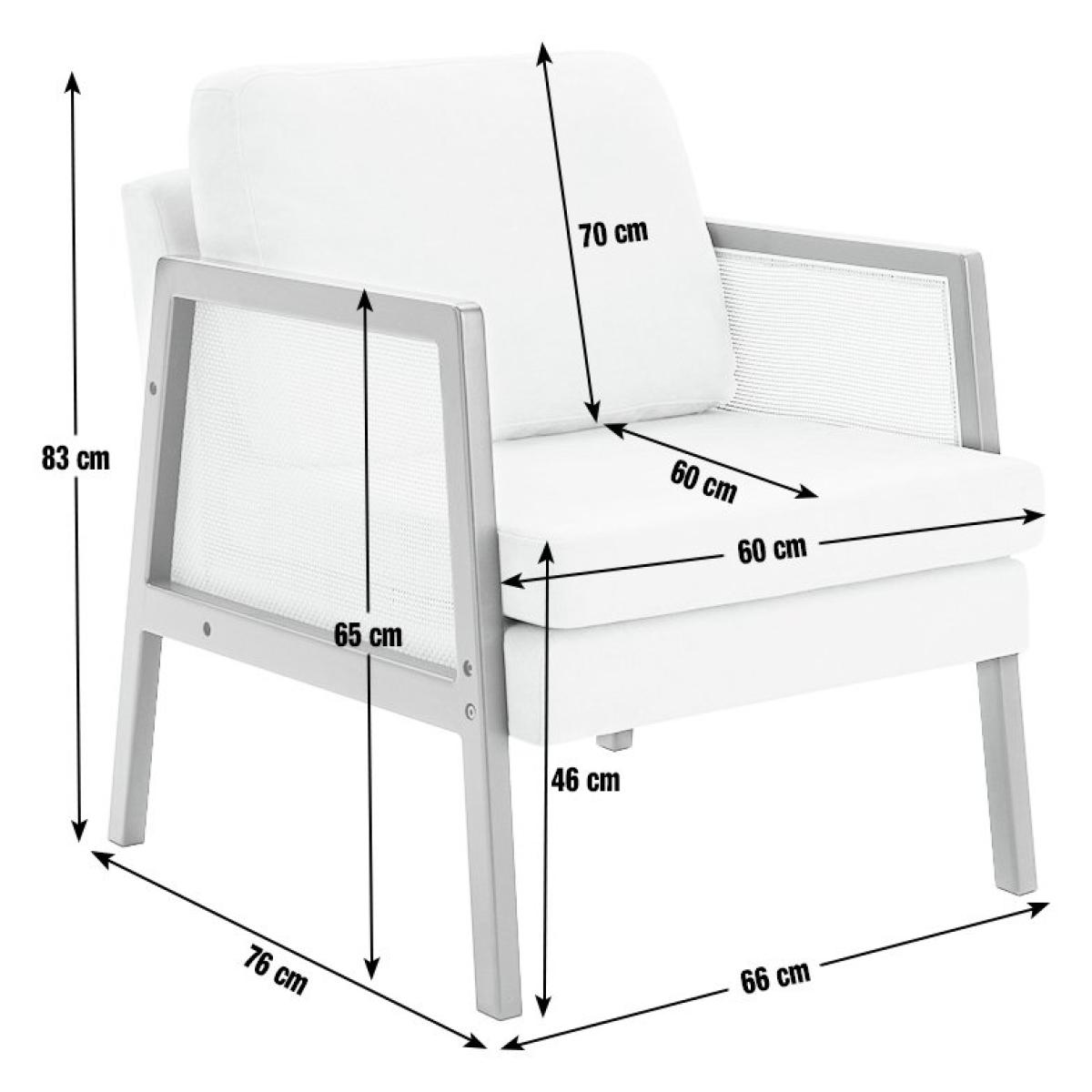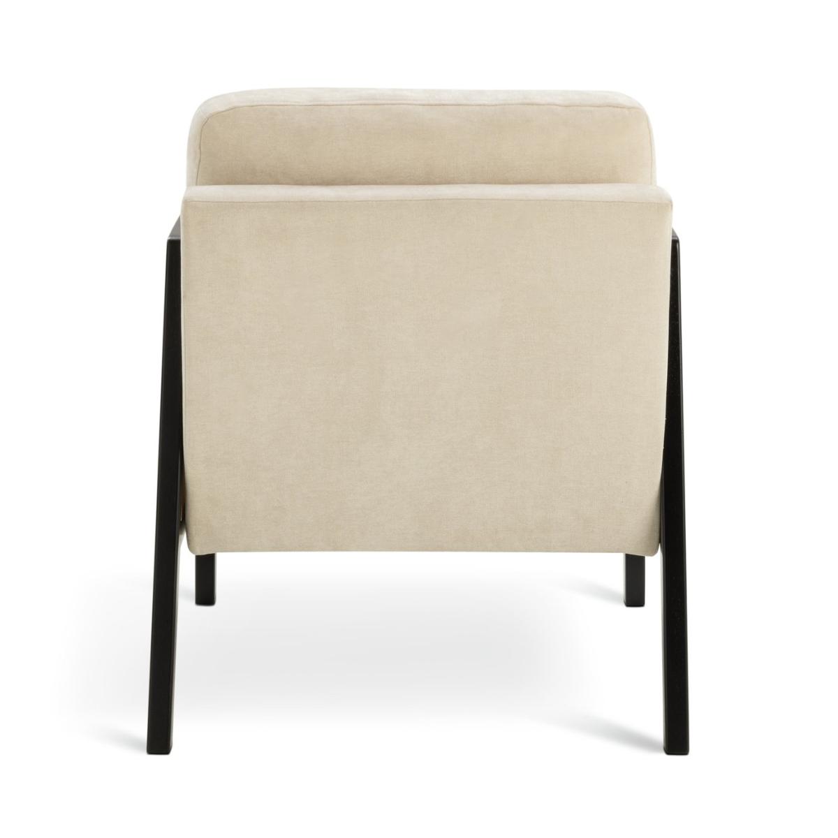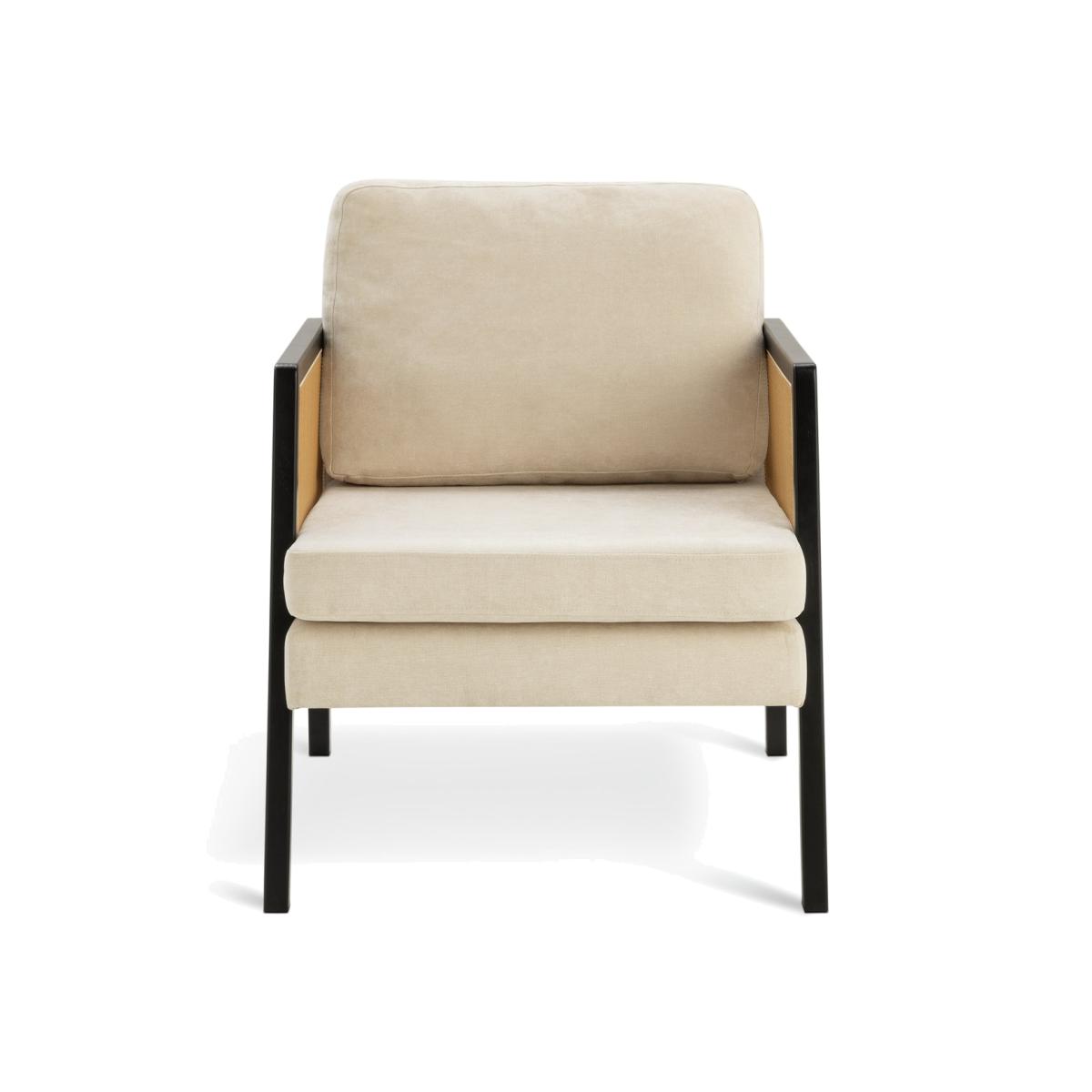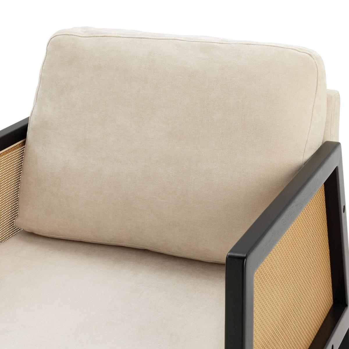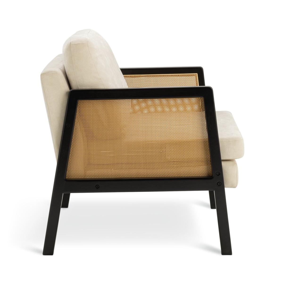 Scandi meets mid-century with this doubly comfortable armchair. Generously padded fibre-filled cushions. A black stained wooden frame elevated by rattan detailing on both arms. Sumptuously upholstered in rich cream fabric. A looker indeed. Nab this seat and make it your own. Material: Made from 100% polyester. Wooden feet. Fixed seat with foam filling. Removable cushion(s) with fibre filling. Dimensions: Size H83, W66, D76cm. Floor to seat height: 46cm. Depth of seat: 60cm. Height of seat back: 70cm. Width of seating area between arms: 60cm. Height of arm rest: 65cm. Weight 14.1kg. Dust or wipe with a damp cloth only. Minimal assembly - just add feet. Maximum individual user weight 110kg. Packaged dimensions: Package size H40, W74, D66cm. FSC certified meaning the materials used for this product are responsibly sourced. General information: We are excited to be welcoming some of our favourite HOME products into the Habitat range. Your product may arrive in Habitat or HOME packaging. Manufacturer's 2 year frame guarantee.