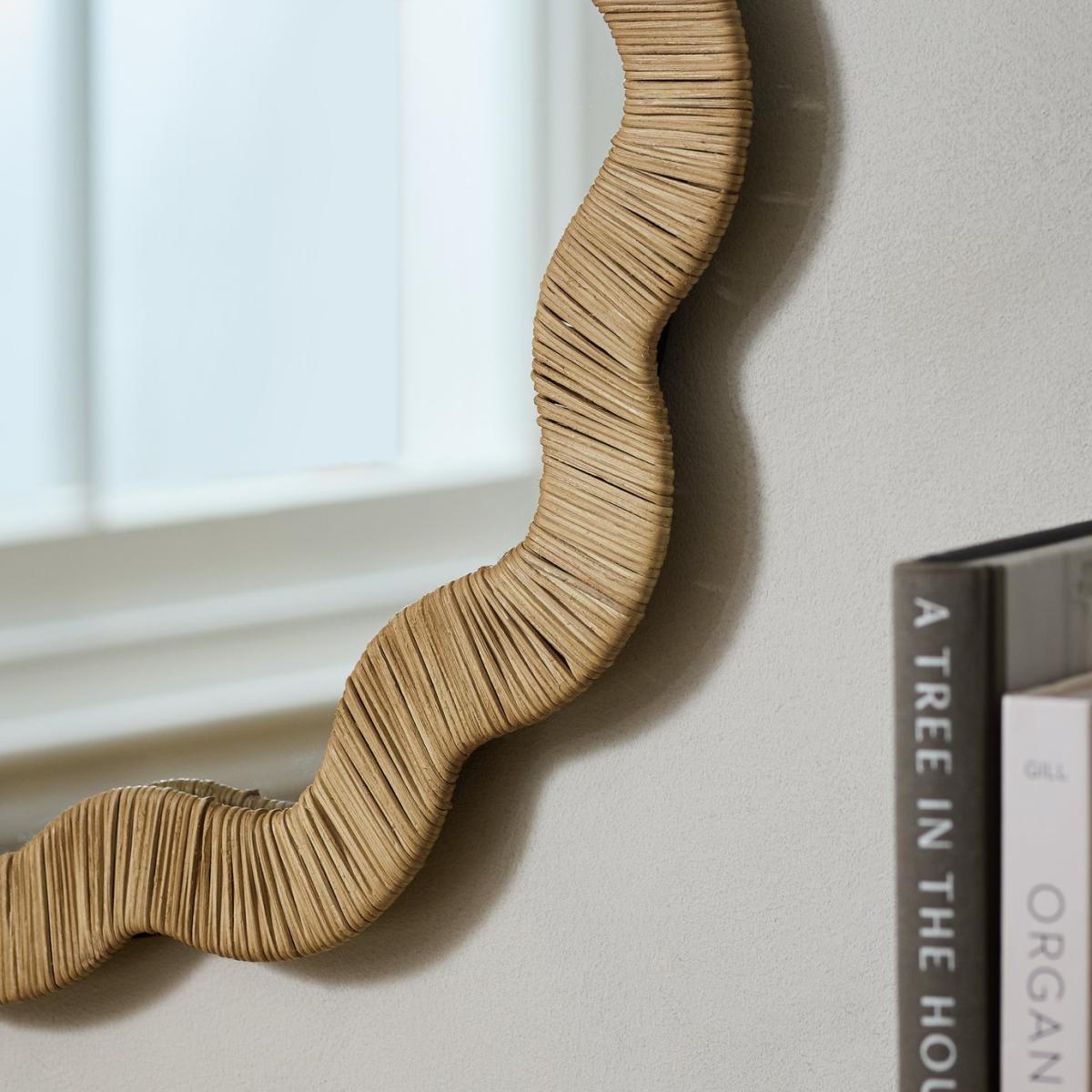 I love the wavy frame of this mirror, as it adds a playful yet stylish touch that works well in a variety of interior styles, from boho to modern coastal. Its natural rattan finish creates a warm, organic vibe, making it perfect for enhancing light and space in living rooms, bedrooms, or hallway areas. Practical styling tips include hanging it above a console or sideboard to create a focal point, or grouping it with other artwork and mirrors for a layered effect. Its sizeable frame makes it both functional and decorative - a great way to introduce texture and a relaxed, inviting feel to any room.
