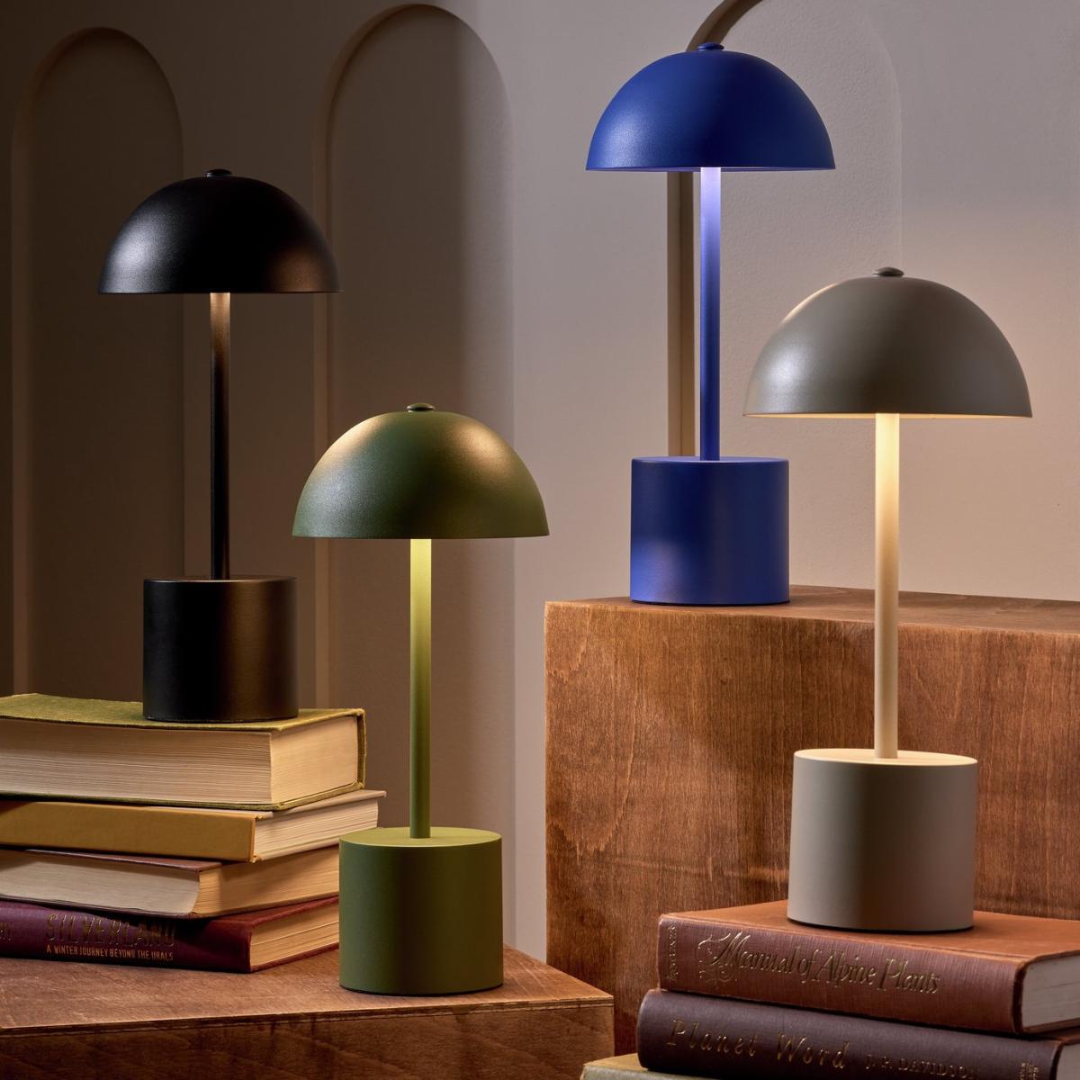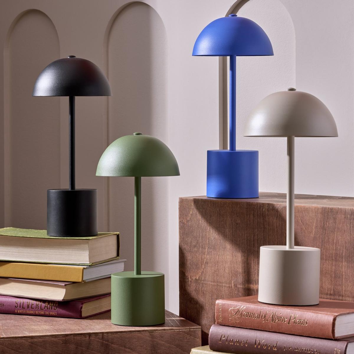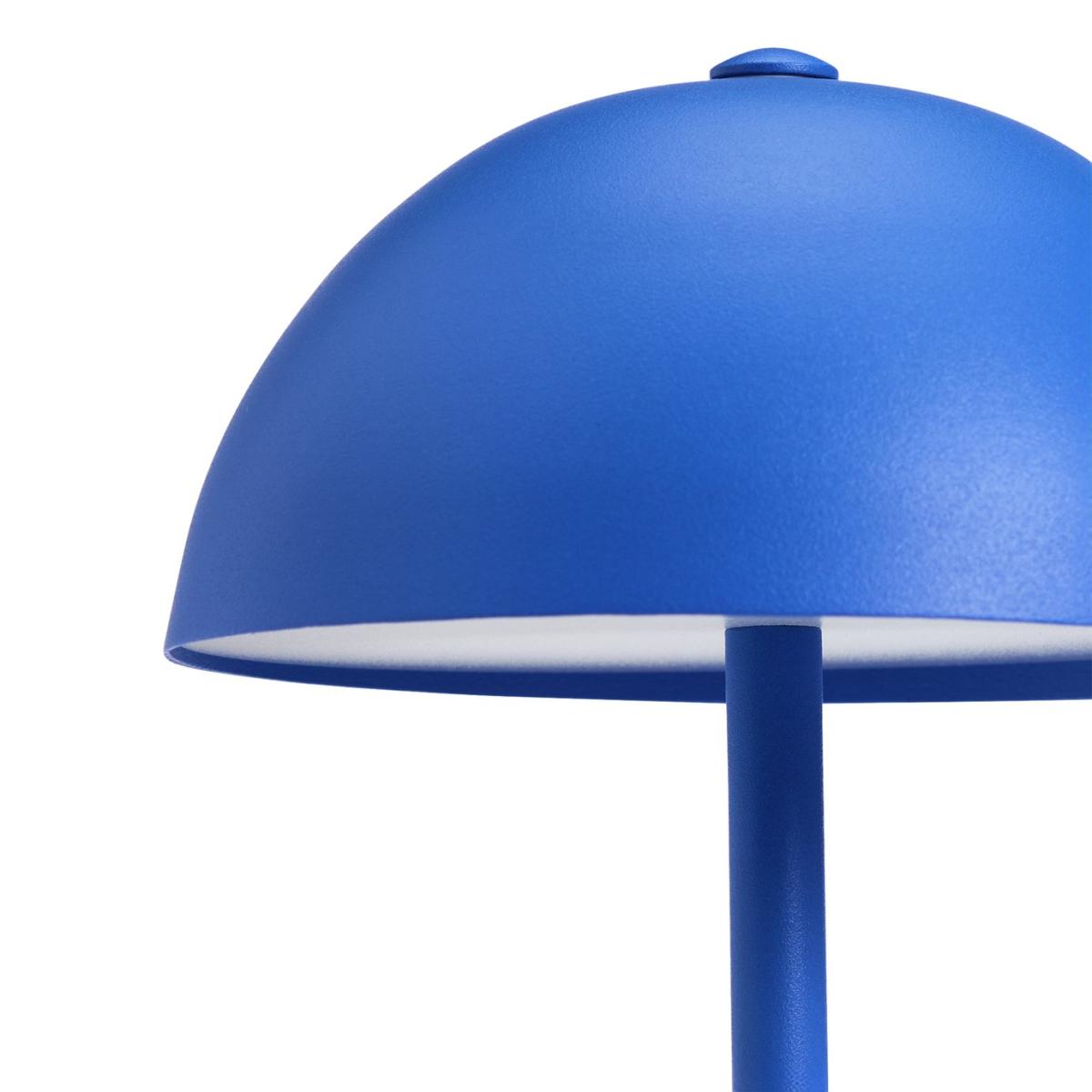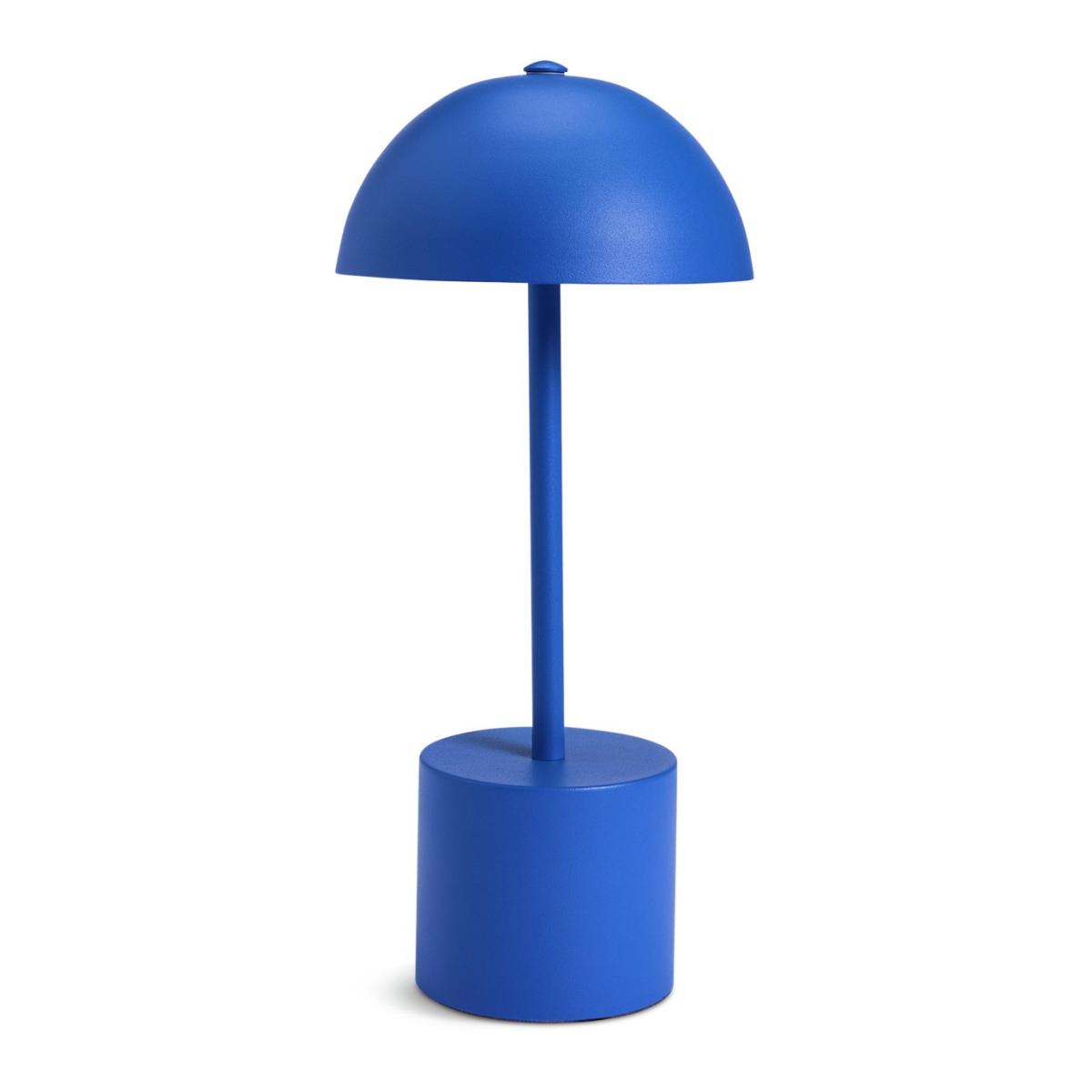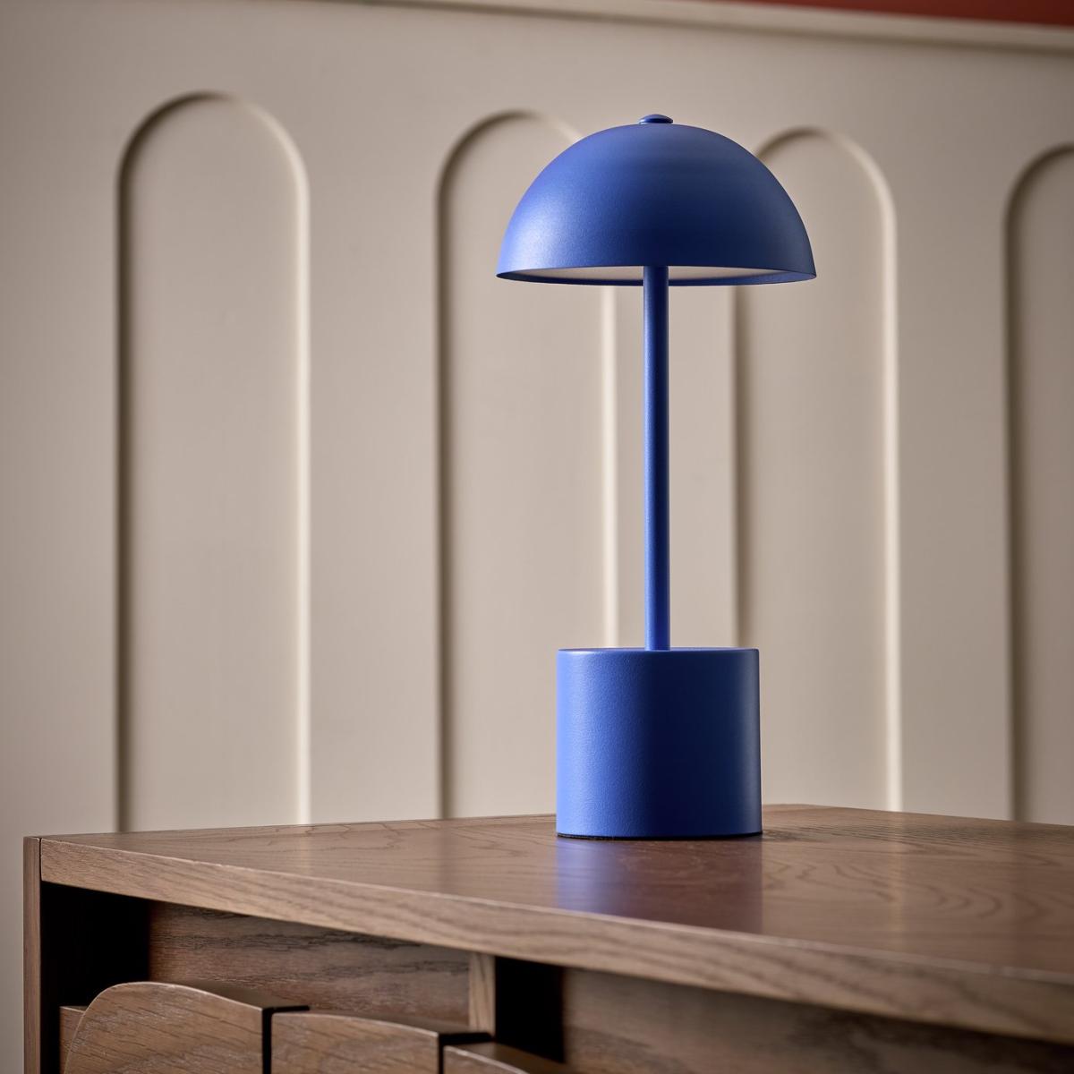 Combine retro style with today's tech and you have this mid-century modern mushroom table lamp. Its vintage roots are displayed in the classic dome shape that casts a warm ambient glow. And for contemporary convenience, it's rechargeable via a USB port. Made from steel with a bold blue finish this is one mushroom that loves being in the light. Dimensions: Overall size H31, W14, D14 cm. Diameter 14cm. Shade size H7, D14cm. Diameter of base 9cm. Cord length 1m. Bulb Information: Bulbs required 1 x. integrated LED bulb(s)(included). Recommended maximum wattage: 3 watts. LED bulb only. Colour rendering index 80. Colour temperature 3000. K. Rated luminous flux 120. General Information: Shade colour: blue. Base colour: blue. Shade material: steel. Base material: steel. Product features: USB connectivity. Rocker switch on top of shade. IP rating 20not suitable for bathroom use. Fully assembled. This lighting product is a class 3 fitting. Manufacturer's 2 year guarantee.