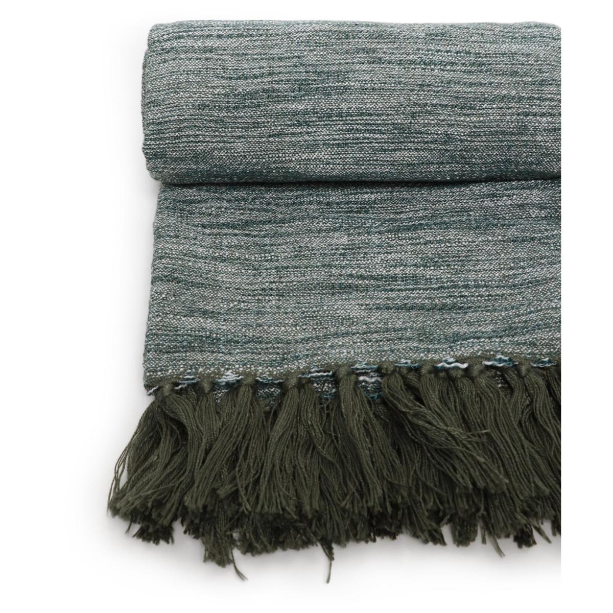 Get country cosy. In calming forest shades our smart throw is an organic way to add warmth and interest to your bedspread. The soft tassel trim gives this modern design a classic edge. And it's woven from 100% recycled polyester, so that's comforting too. It's even handy to have as an instant wrap around if the temperature drops. Very snuggly. Set the scene with a layer of green.