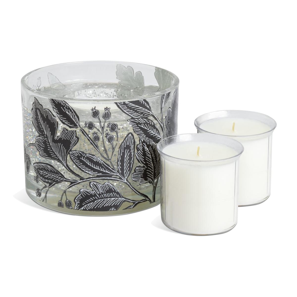 Light up the season! This refillable gel scented candle is presented in a fun festive glass decorated with silver leaves and LED lights which start to glow when the candle is lit. Plus, it has a wonderful winter fragrance. Crisp notes of frosted cedar, fresh moss and rich patchouli with an infusion of warm spices and zesty orange. Frosted Cedar scent. Paraffin wax. Set includes Refillable candle set + 2 refill. Size of medium candle H9,. Diameter of medium candle 10cm. Approximate burn time 20 hours. Refills available.