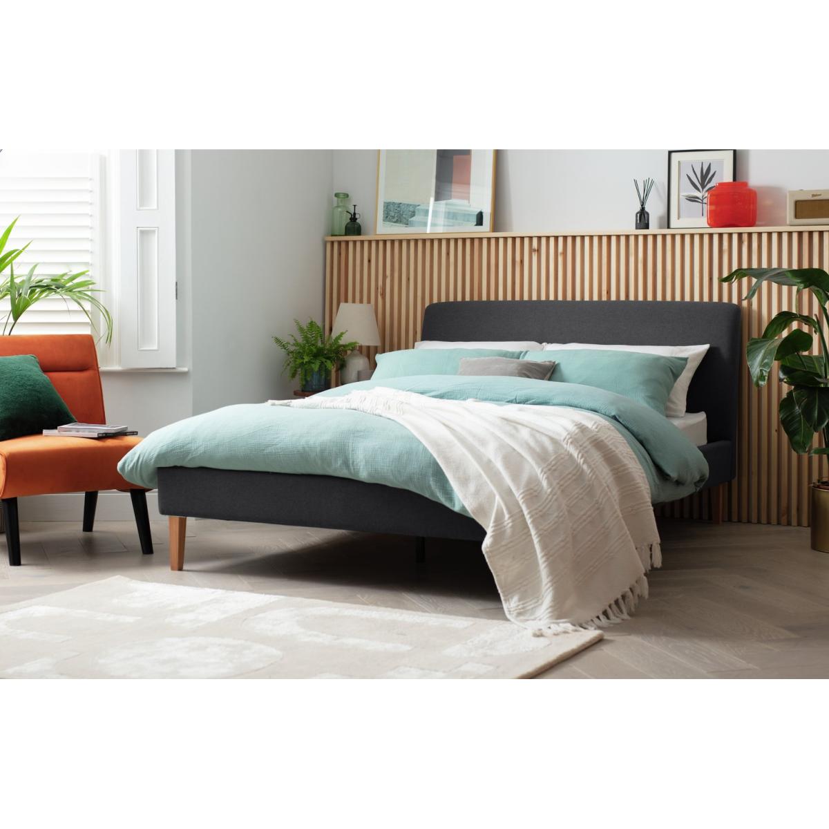 Embrace restrained elegance with our Ren double bed. The soft headboard and frame are upholstered in a smart charcoal fabric. Tailored stitching adds a handsome finish. Squared off legs provide sturdy support while the slatted wooden base is sprung for sound sleep. Pocket sprung, open coil or memory foam? We have a selection of mattresses to meet your needs. Refresh your linen with a new set from our bedding collection. Part of the Ren collection. Upholstered frame. Base with sprung wooden slats. Size W147, L212, H94cm. Height to top of siderail 25cm. 19cm clearance between floor and underside of bed. Weight 32.5kg. Total maximum user weight 220kg. Self-assembly - 2 people recommended. Package Dimensions: Package 1 dimensions: H16.5, W83.5, D150cm. Package 1 weight: 19.5kg. Package 2 dimensions: H20, W198, D18.5cm. Package 2 weight: 17kg. General Information: We are excited to be welcoming some of our favourite HOME products into the Habitat range. Your product may arrive in Habitat or HOME packaging.
