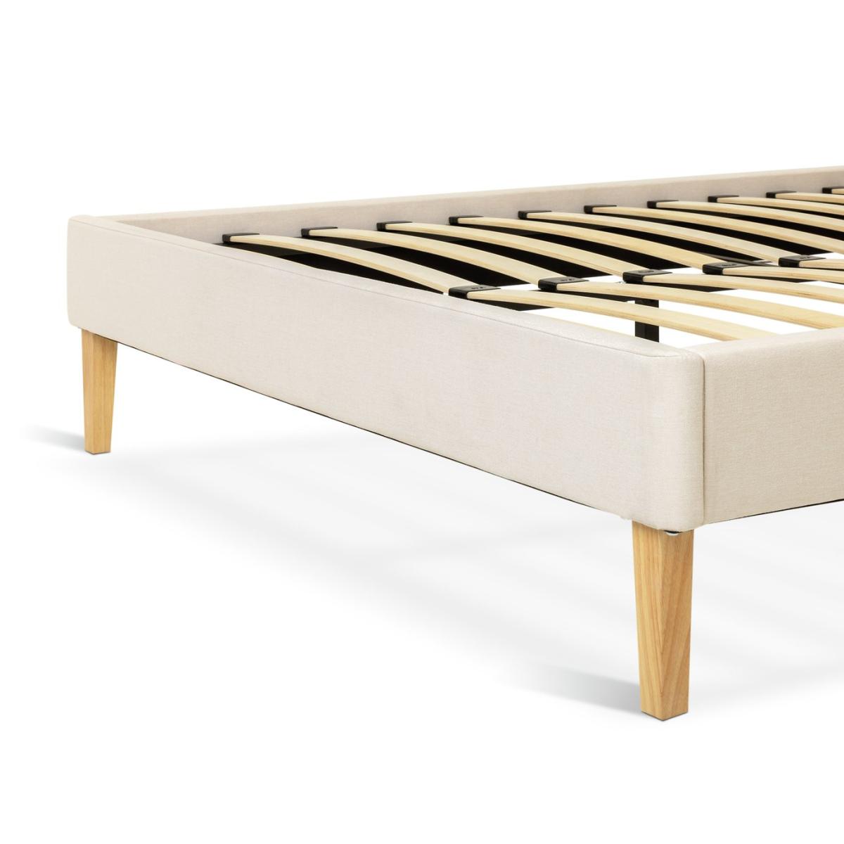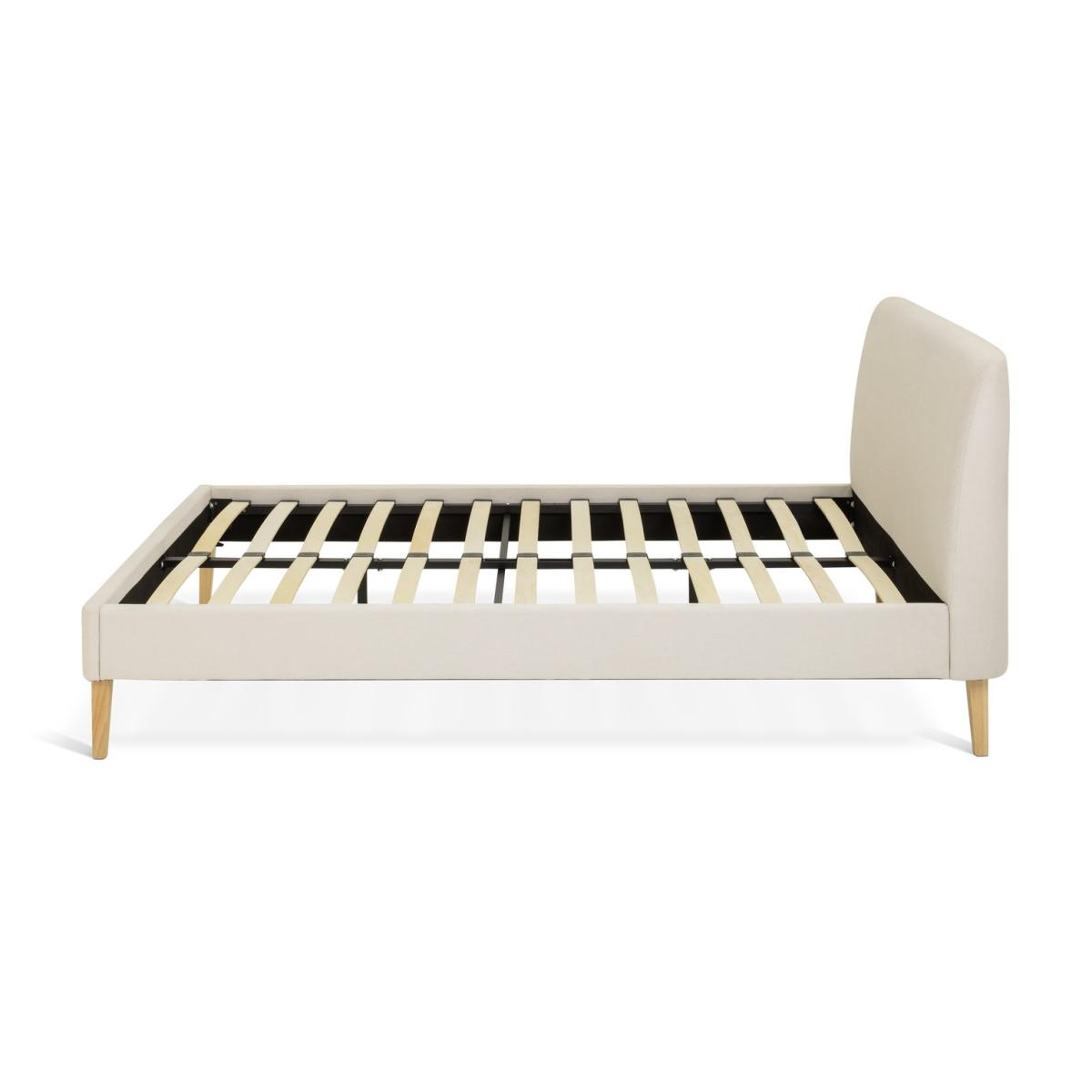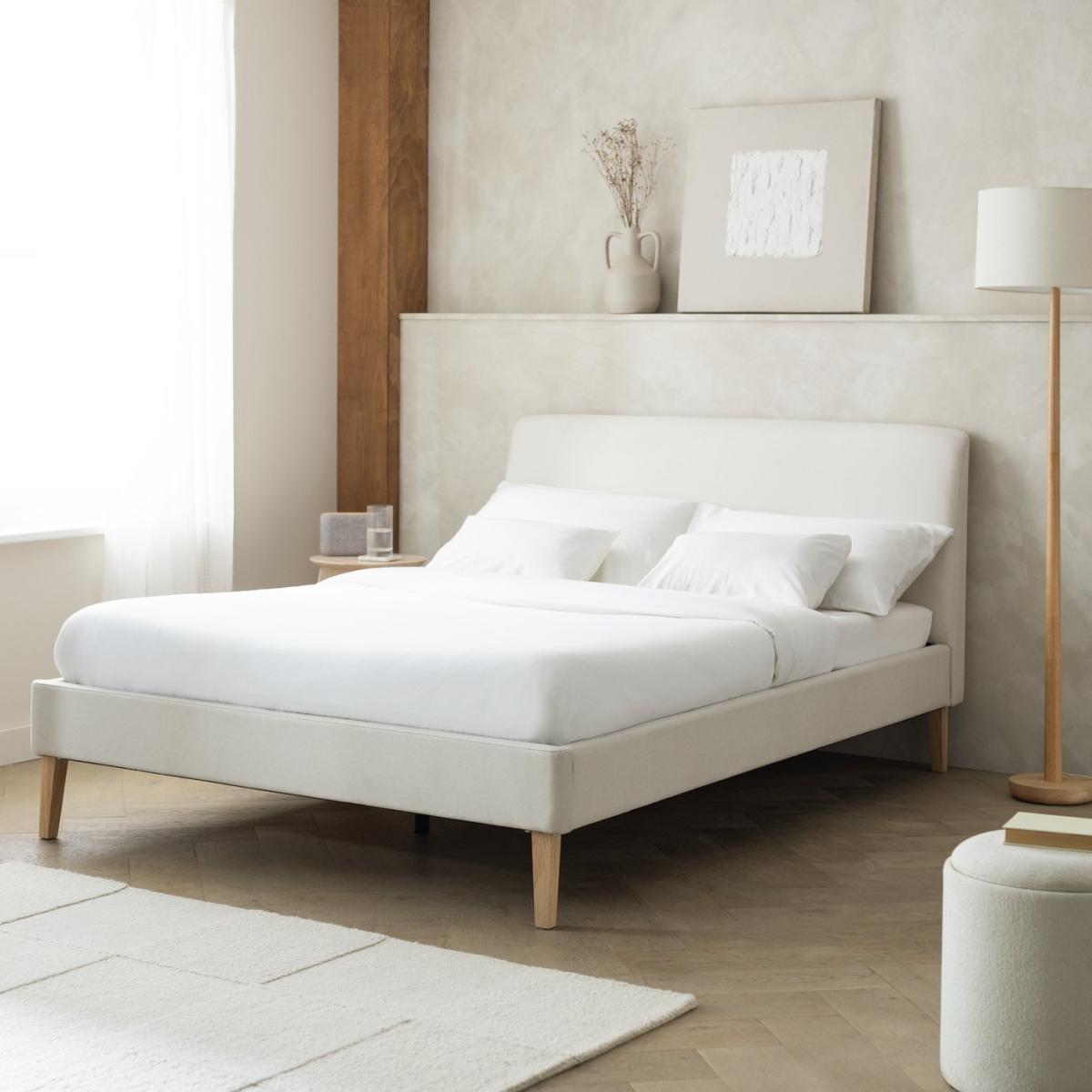 Embrace restrained elegance with our Ren bedframe. The soft headboard and frame are upholstered in a classic cream fabric. Tailored stitching adds a smart finish. Squared off legs provide sturdy support while the slatted wooden base is sprung for sound sleep. Part of the Ren collection. Upholstered frame. Linen look fabric - 100% polyester. Wooden feet. Base with sprung wooden slats. No storage. Size W132, L212, H94cm. Height to top of siderail 25cm. 19cm clearance between floor and underside of bed. Weight 30kg. Total maximum user weight 220kg. Self-assembly - 2 people recommended. Package Dimensions: Package 1 dimensions: H16.5, W83.5, D135cm. Package 1 weight: 19.5kg. Package 2 dimensions: H20, W198, D18.5cm. Package 2 weight: 16kg. General Information: Manufacturer's 1 year guarantee. FSC certified meaning the materials used for this product are responsibly sourced.