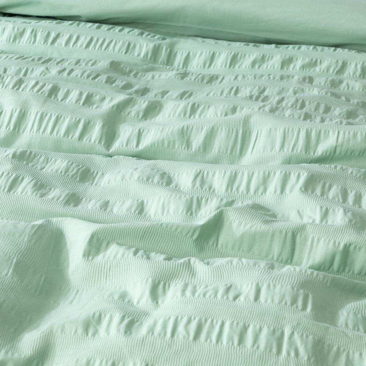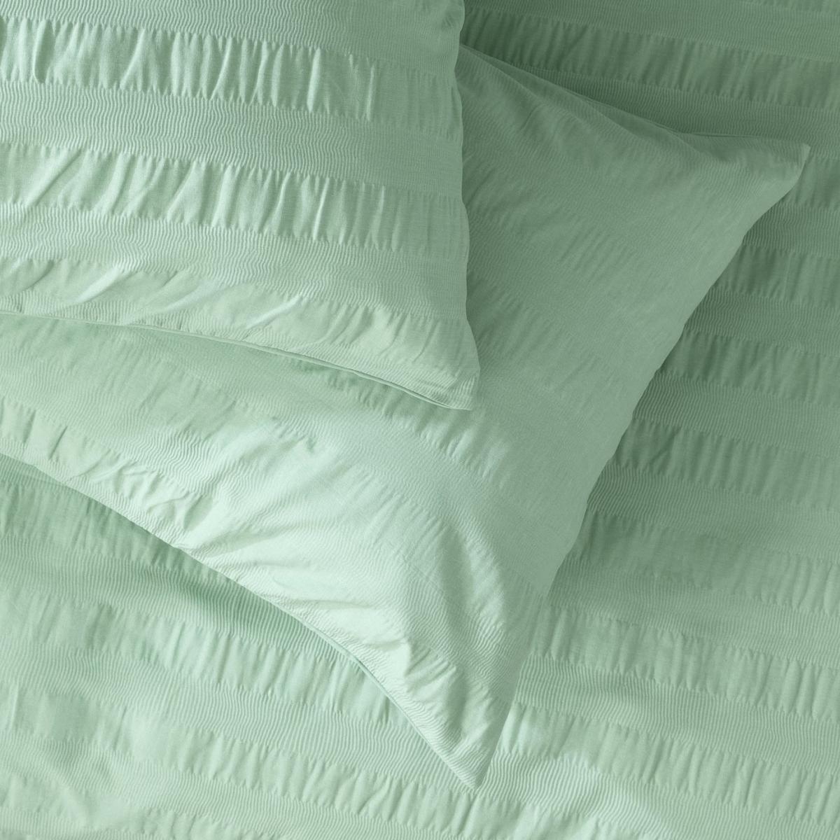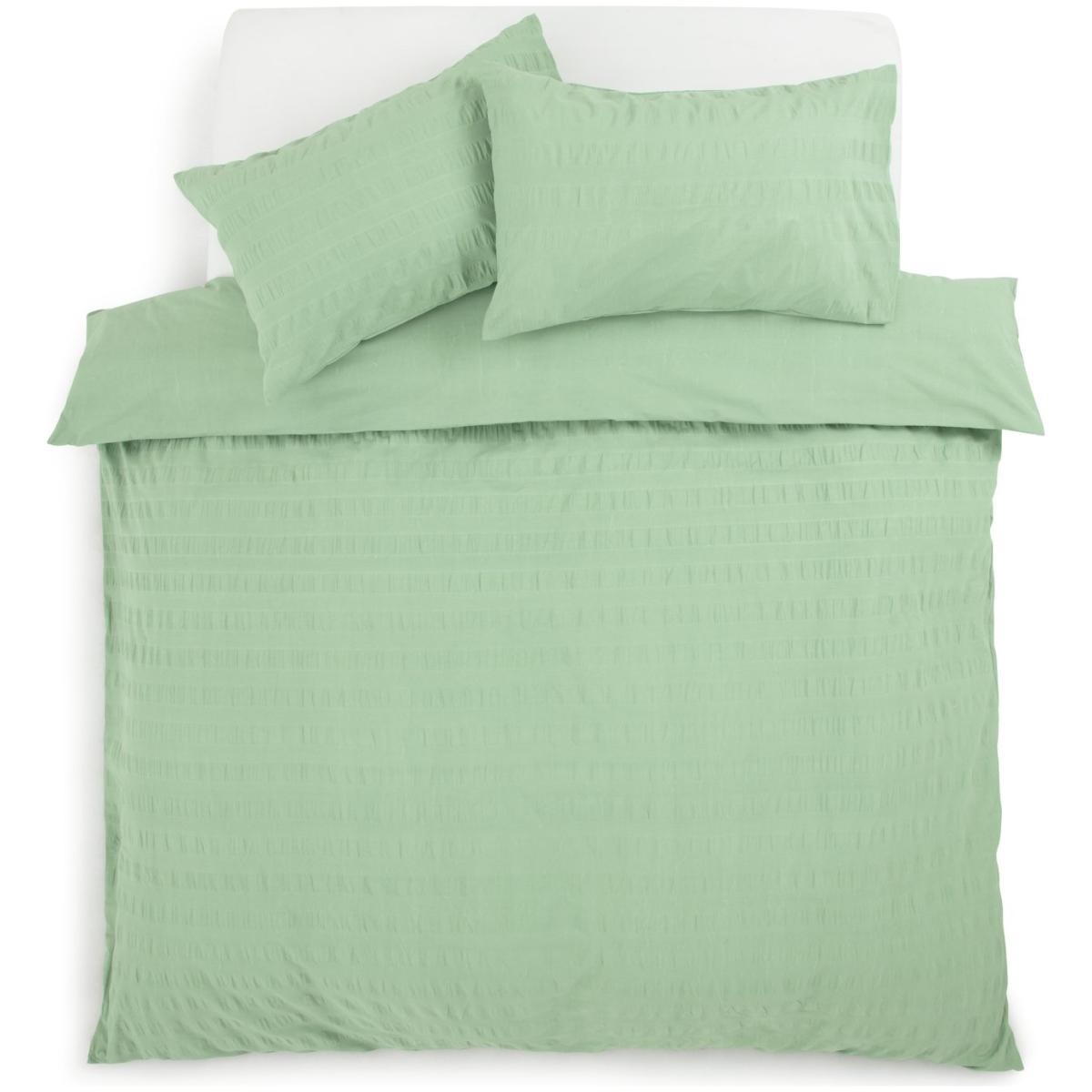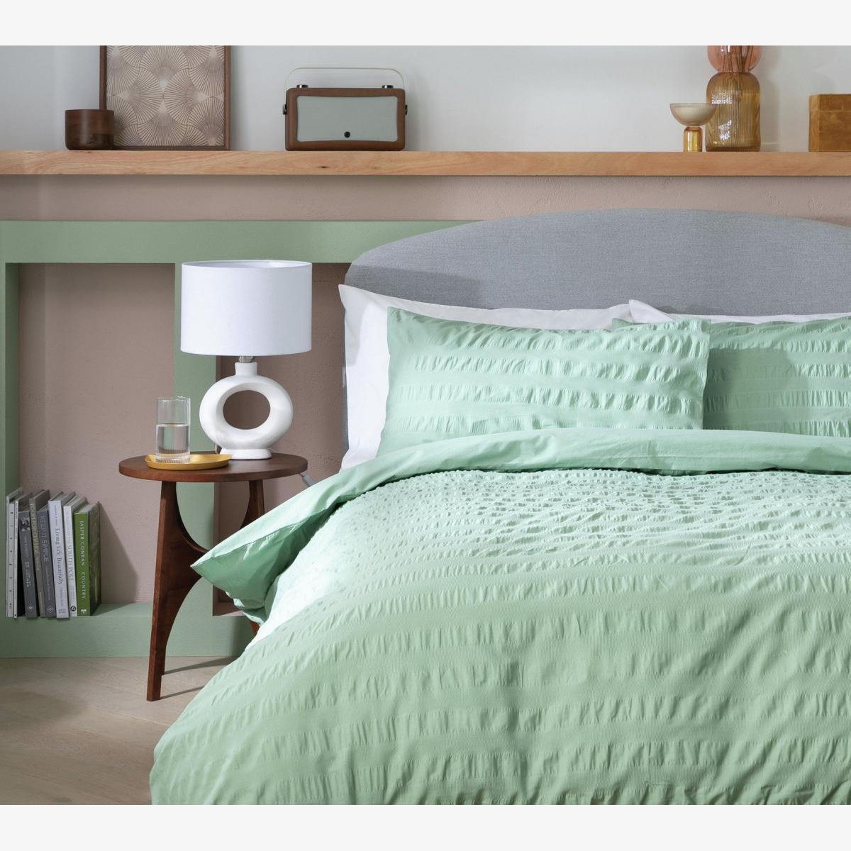 With pretty, preppy and puckered seersucker, with a touch of delicate textured stripe design and a refreshed look. Our airy and light king size bed set is full of bounce and springs back to look like new after washing, plus no need to iron. Perfect for this time of year, it's cool, comfortable and comes in a gorgeous seasonal green. This item carries the STANDARD 100 by OEKO-TEX logo, which means you can be certain that every component has been tested for harmful substances and is therefore harmless to human health. Finish: seersucker. 52% polyester , 48% cotton, 1006619%. 1006619% , 1006619%, 1006619%. 144 thread count. Set includes 1 duvet cover and 2 pillowcases. Bed size: king size. Length 220cm, Width 230cm. Buttons for fastening. Standard pillowcase (s). Pillow case length 75cm, Width 50cm. Reversible pillowcase (s). Machine washable at 40 C. Suitable for tumble drying.