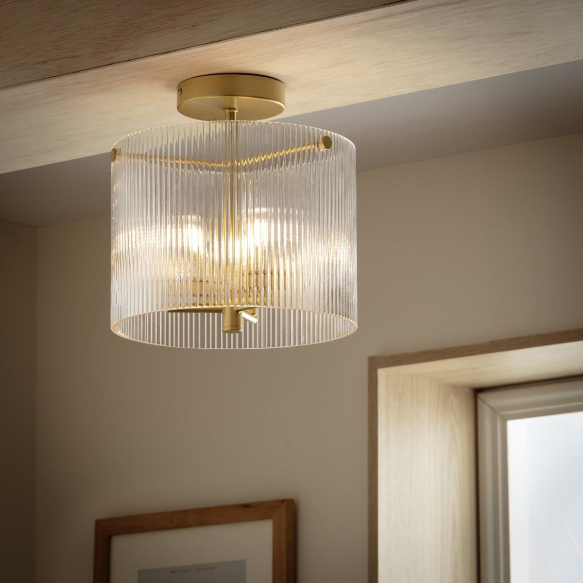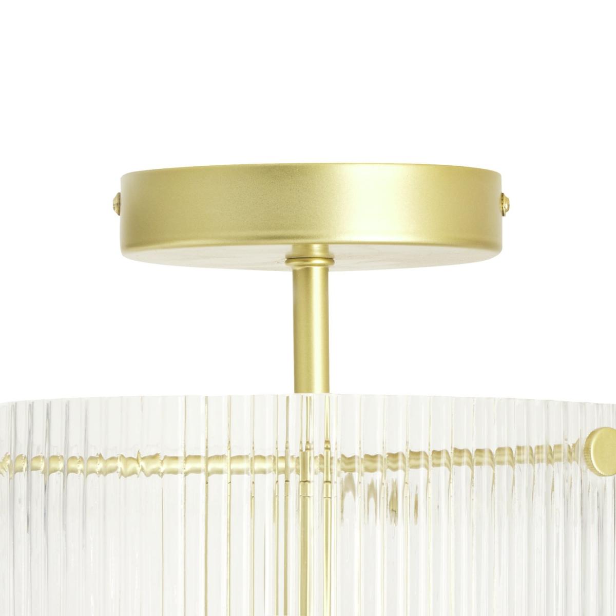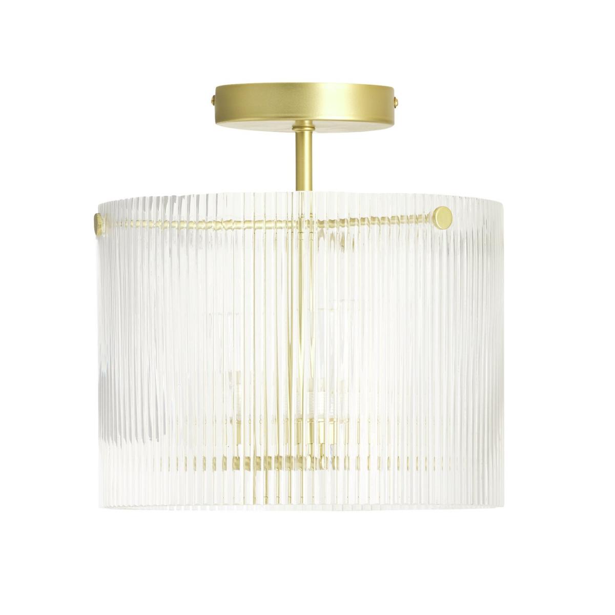 Retro curves with polished brass. This ribbed glass jar ceiling light brings a mid-century modern mood to your home. While the flush fit keeps things neat. Designed to gently diffuse light, creating a soft glow that works beautifully in hallways, bedrooms or living rooms. A simple design, made to perfection. Dimensions: Size H27.8, W26.8, Diameter 26.8cm. Bulb Information: Bulbs required 3 x classic capsule G9 LED (not included). Recommended maximum wattage: 5 watts. Dimmable LED bulb. General Information: Material: 60% iron, 35% glass,5% plastic. IP rating 44. Not suitable for bathroom use. Weight: 0.8kg. Manufacturer's 1 year guarantee.