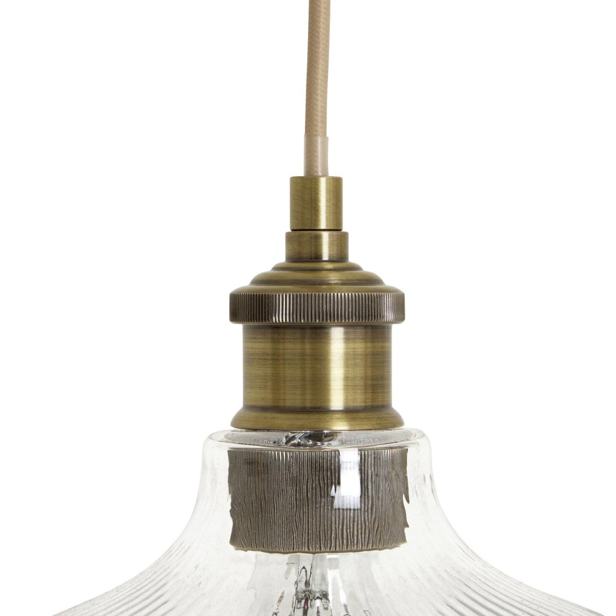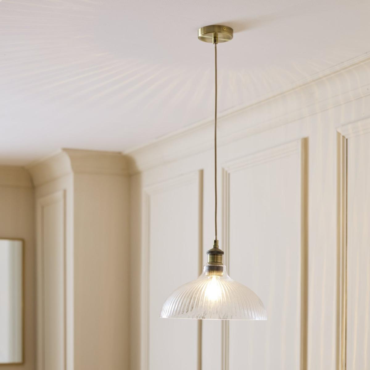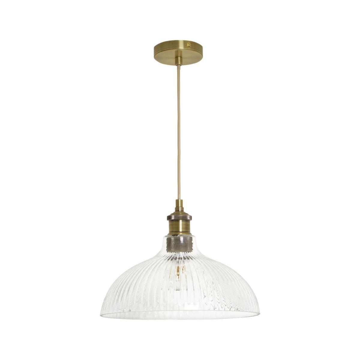 A clear nod to vintage style. This pendant ceiling light pairs a fluted glass shade with an antique looking brass holder for a timeless traditional feel. A smart way to add warmth and classic character to a dining space, kitchen or hallway. Dimensions: Size H120, W30.5, D30.5cm. Diameter 30.5cm. Adjustable drop. 60 - 120cm drop. Bulb Information: Bulbs required 1 x classic E27 edison screw LED (not included). Recommended maximum wattage: 15 watts. Can be used with a dimmer switch. LED bulb only. General Information: Material: Glass & Iron. IP rating 20. Not suitable for bathroom use. Weight: 1.2kg. Minimal assembly. Product is hard-wired into electrics. This lighting product is a class 2 fitting. Manufacturer's 1 year guarantee.