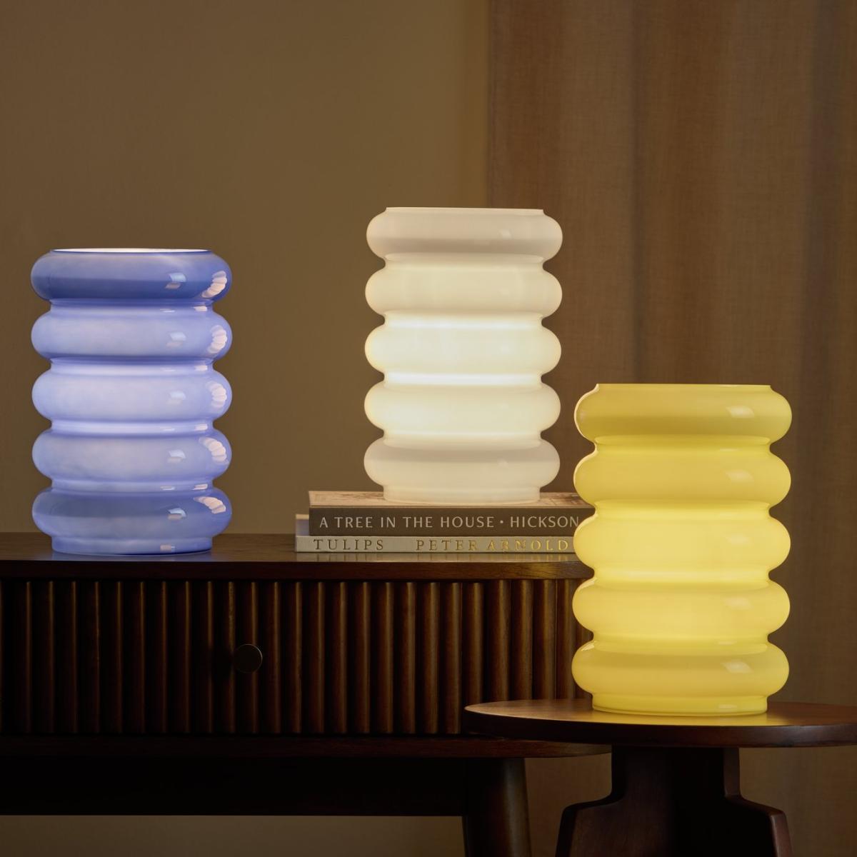 Coloured glass makes its mark with this fun blue glass table lamp. High gloss and big on style, it adds a pop of dopamine to your decor with a simple flick of a switch. Ribbed to offer a retro aesthetic, the blue glass casts a cool blue hue glow when lit. Playful by day, cosy by night. Dimensions: Overall size H26.5, W18, D18 cm. Diameter of base 18cm. Cord length 1.8m. Bulb Information: Bulbs required 1 x candle. E14 small edison screwLE D bulb(s)(not included). Recommended maximum wattage: 10 watts. General Information: Base colour: blue. Shade material: glass. Base material: glass. In-line switch. IP rating 20not suitable for bathroom use. Fully assembled. Product is mains powered plug in. This lighting product is a class 2 fitting. Part of the Coloured Glass collection. Manufacturer's 1 year guarantee.