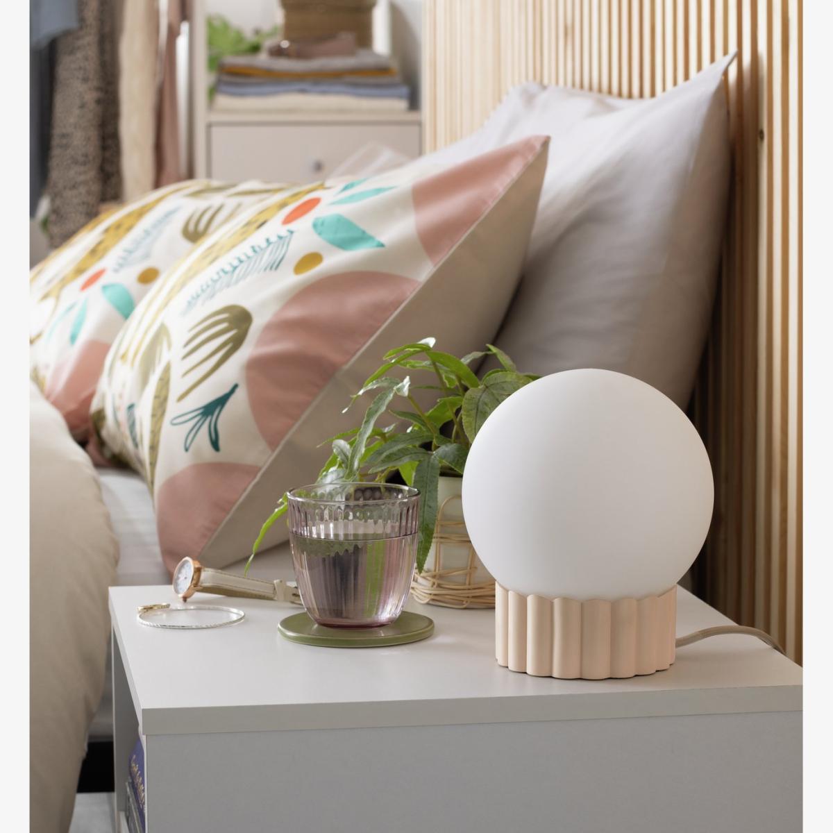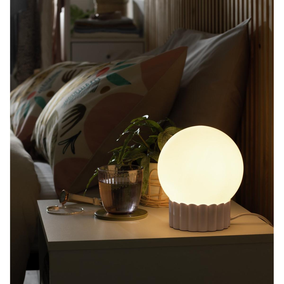 A pearl of a lamp. Light up our globe table lamp and enjoy its soft warm glow. With a ribbed peach resin base, it has a delicate aura that sets the tone. Even switched off, it makes a fab decor piece. Looking for more mood lighting? Explore our options in ambient floor and table lamps. Dimensions: Overall size H18, Diameter 15cm. Shade size H15, D15cm. Diameter of base 11cm. Bulb Information: Bulbs required 1 x classic capsule G9 LED bulb(s) (not included). Recommended maximum wattage: 7 watts. General Information: Shade colour: white. Base colour: natural. In-line switch. IP rating 20 - not suitable for bathroom use. Minimal assembly. Manufacturer's 1 year guarantee.