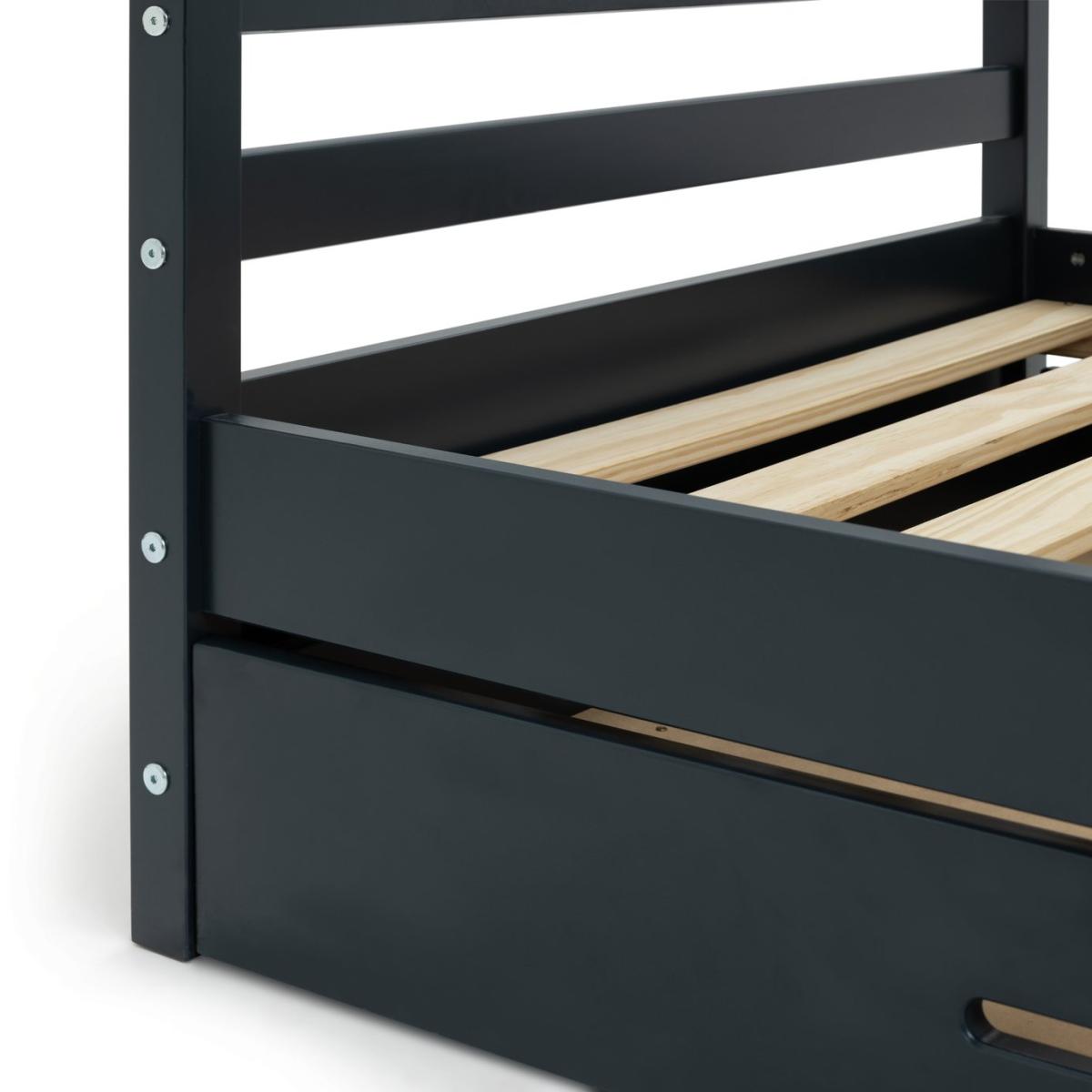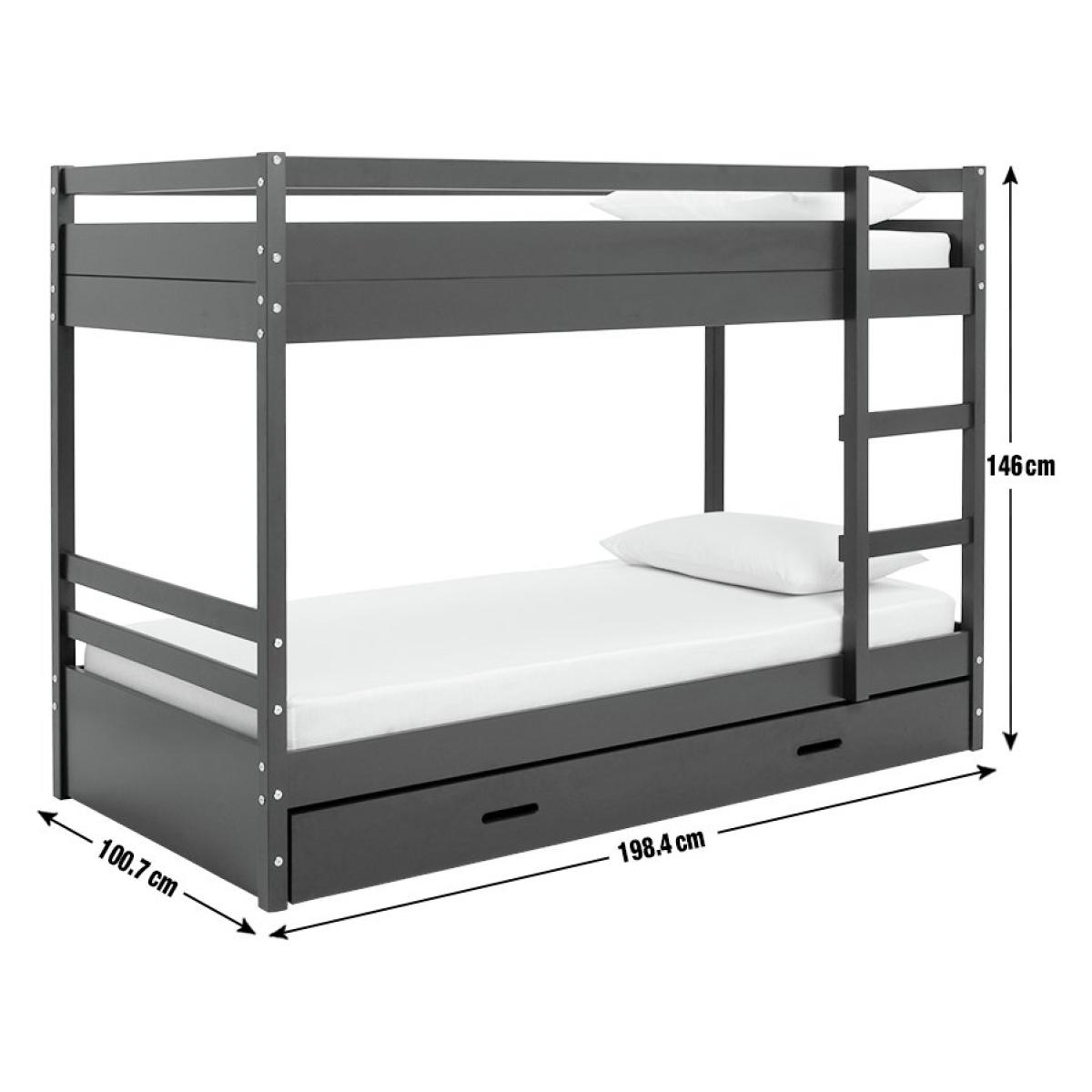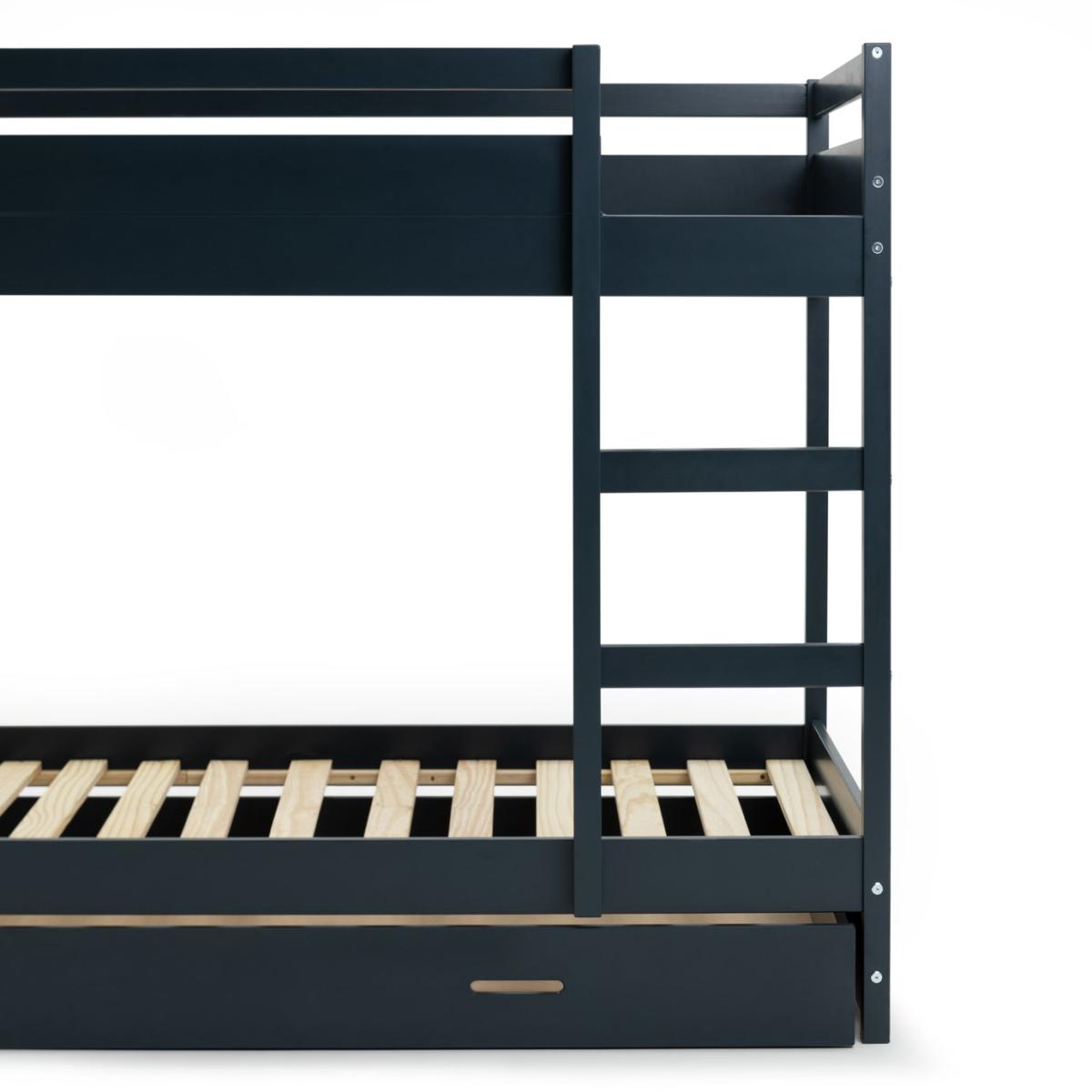 Climb aboard this blue bunk bed. The strong wooden frame features a fixed ladder and safety rail around the top cot, and a handy wide draw below the bottom bunk. This fun and functional bunk bed comes complete with a pair of comfy mattresses. Night, night you two.