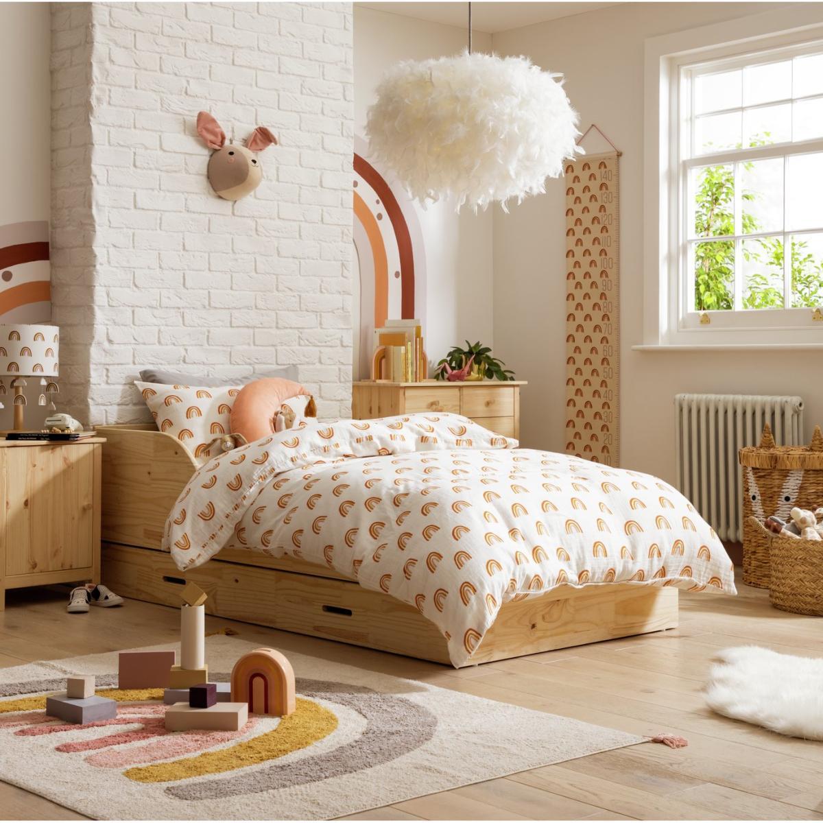I love this bed frame for its combination of practicality and simplicity. The pine finish creates a warm, natural look that fits well in both Scandi-inspired or more traditional children’s rooms. Its low profile makes it suitable for nursery or toddler spaces, and the built-in drawers are perfect for extra storage-ideal for keeping bedding, toys, or clothes tucked away but easily accessible. Styling tip: pair it with neutral or pastel bedding for a calm feel, or add colourful cushions and throws for a playful vibe. It works well in interiors that lean towards light wood accents, whitewashed walls, or subtle pastel palettes, making it a versatile choice for creating a cosy, clutter-free environment.