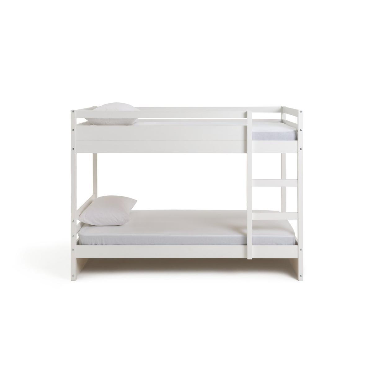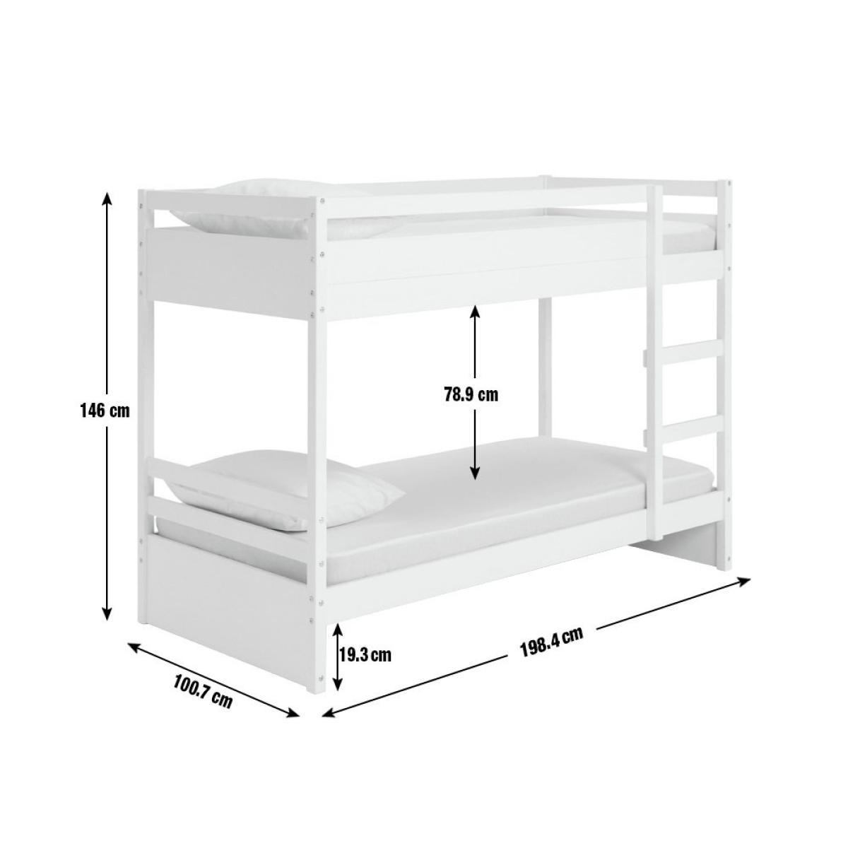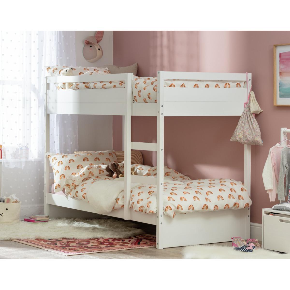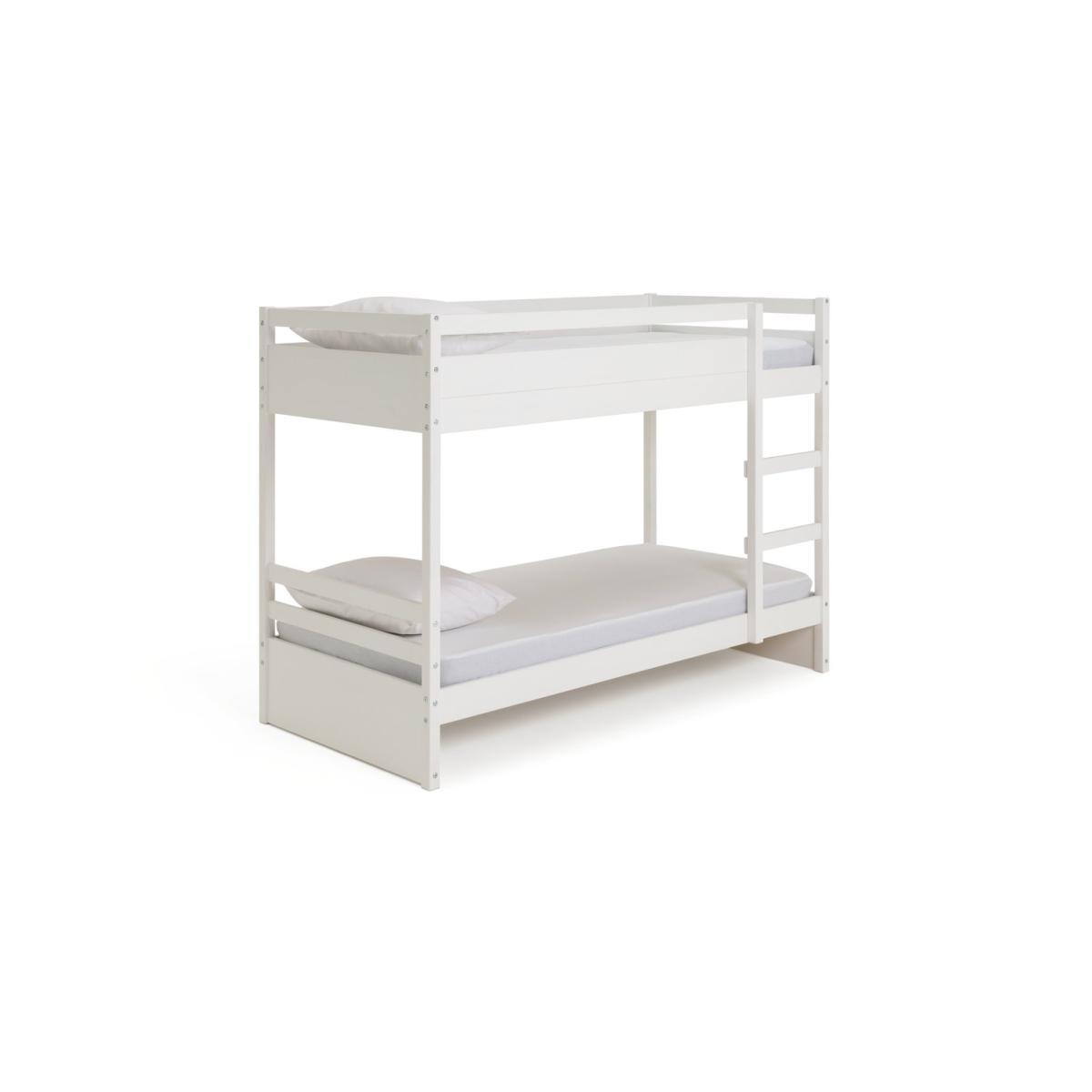 That's sleepovers sorted. Our sleek but sturdy Rico bunk bed lets you say 'yes' to your kids best friend staying the night. Great for siblings 6+ years to share too. Made of solid FSC wood mixed with MDF and painted white, the frame measures L198.4cm W100.7cm H146cm. It's simple to assemble and designed to fit neatly into smaller kids' bedrooms. The in-built ladder makes access to the top bunk easy and there's space under the bottom bunk for toy or shoe storage. What a space saver, so much more room to have fun. Bags the top bunk.