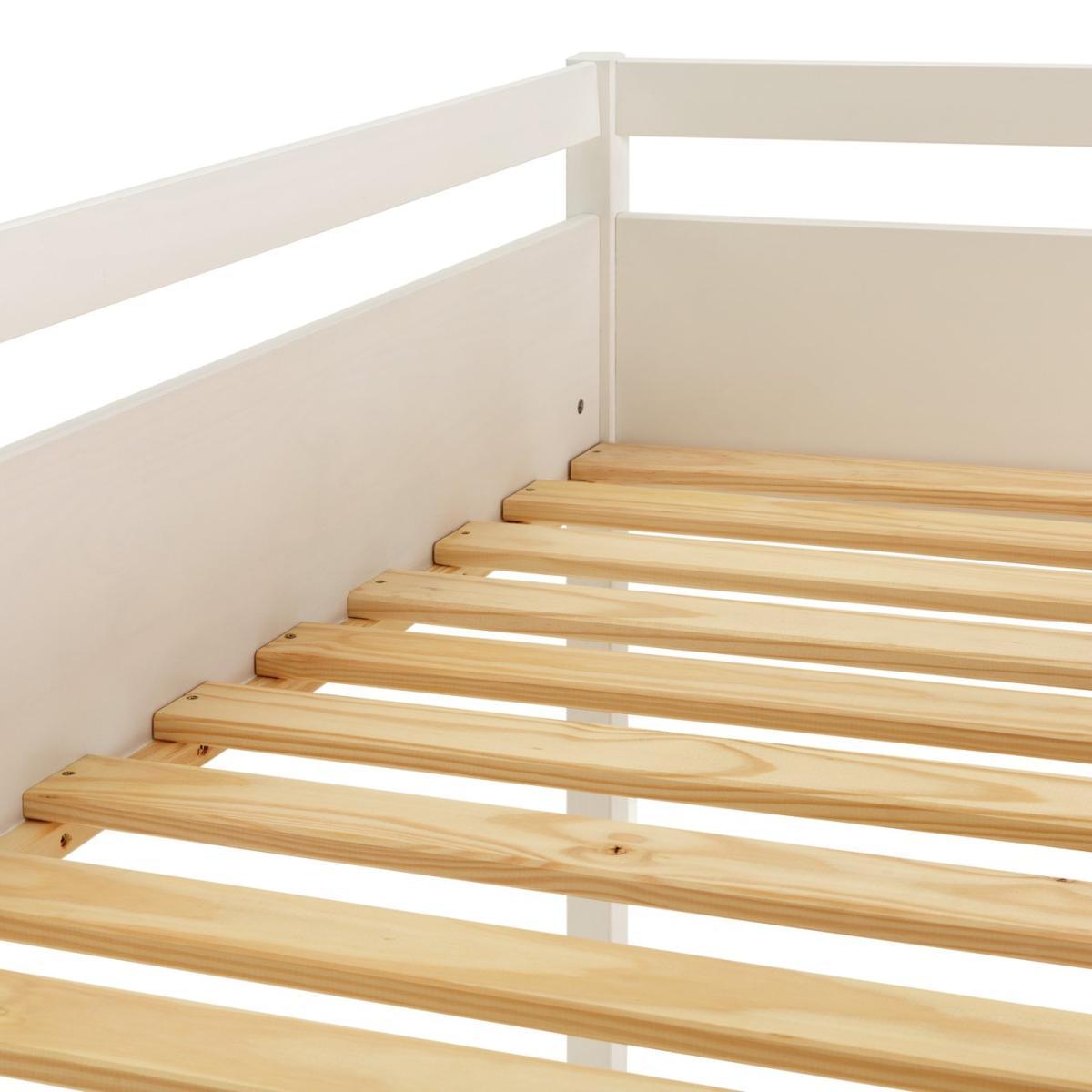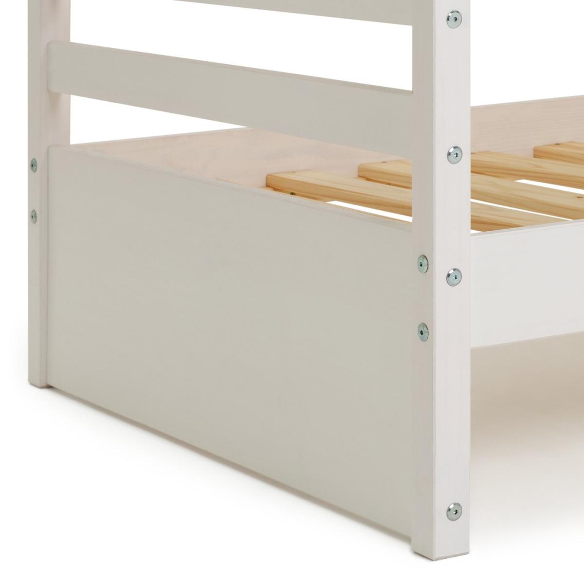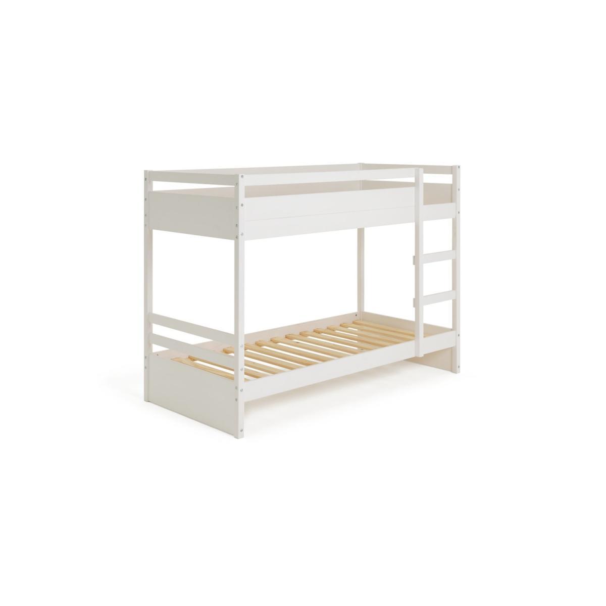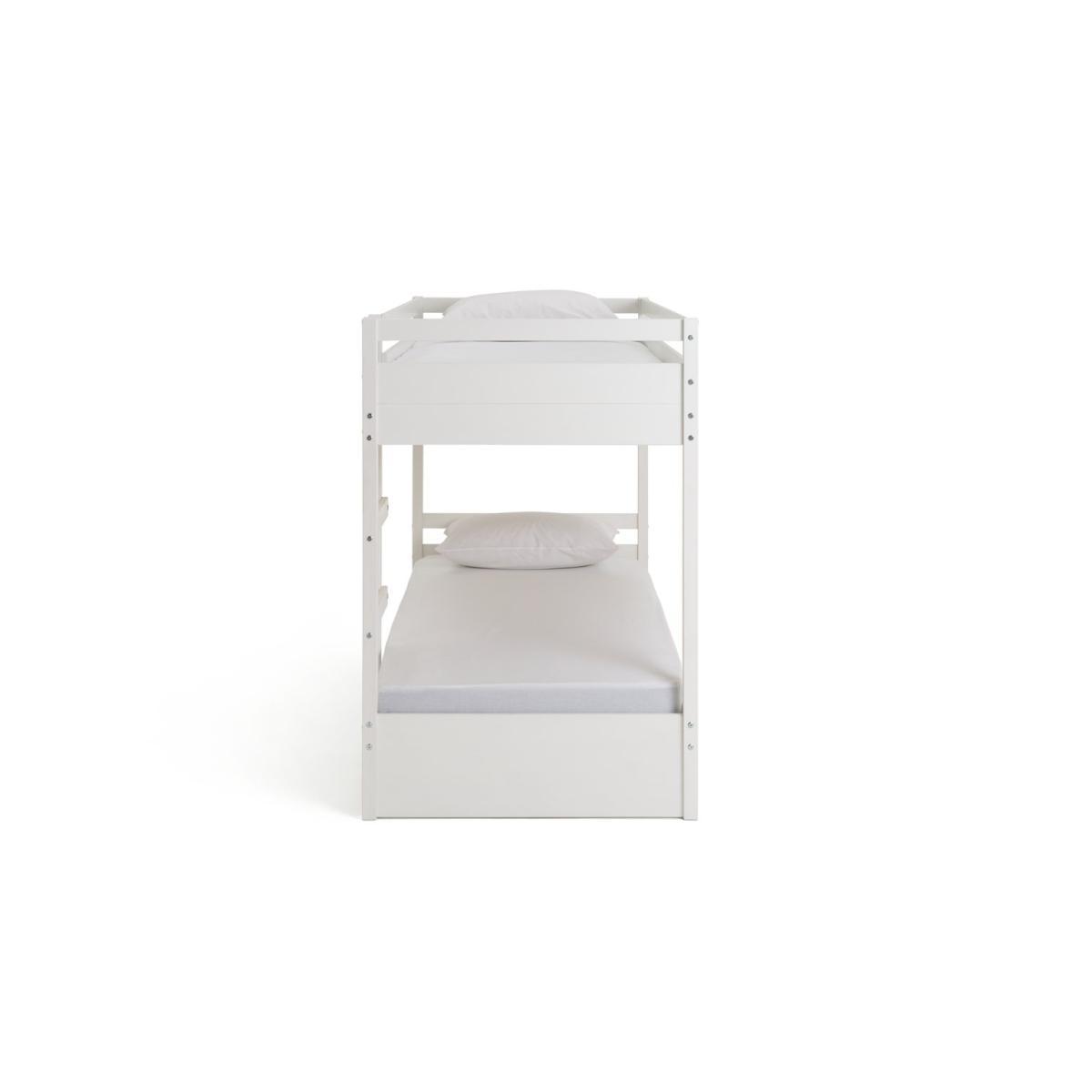 That's sleepovers sorted. Our sleek but sturdy Rico bunk bed lets you say 'yes' to your kids best friend staying the night. Great for siblings 6+ years to share too. Made of solid FSC wood mixed with MDF and painted white, the frame measures L198.4cm W100.7cm H146cm. It's simple to assemble and designed to fit neatly into smaller kids' bedrooms. The in-built ladder makes access to the top bunk easy and there's space under the bottom bunk for toy or shoe storage. What a space saver, so much more room to have fun. Bags the top bunk.