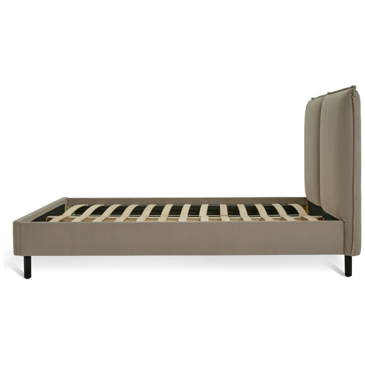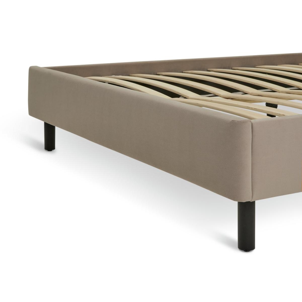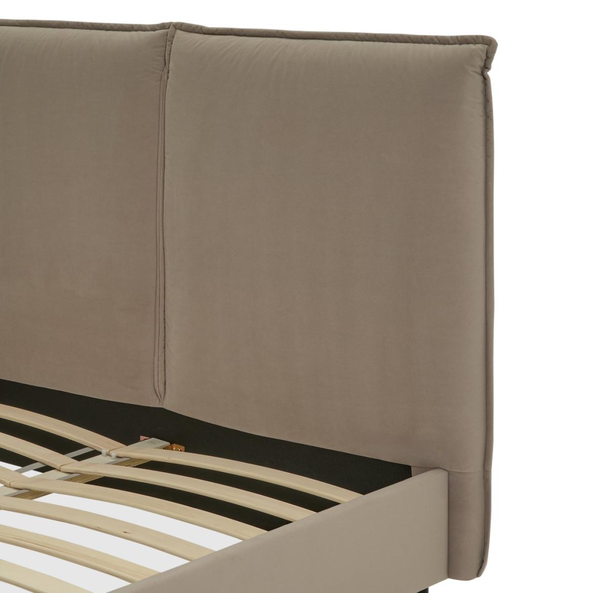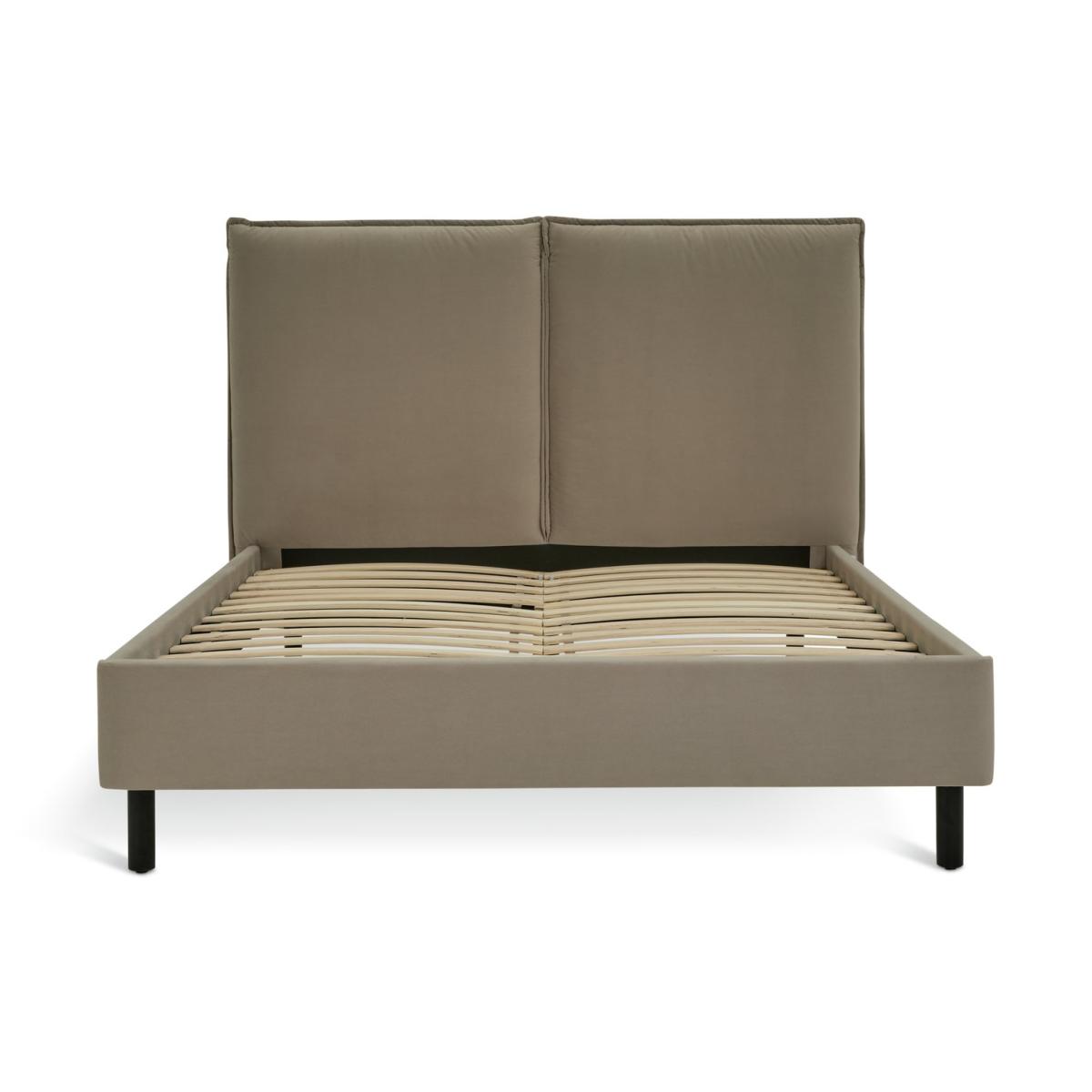 Capture the spirit of New York. Our plush, pillow back padded headboard gives a modern Big Apple look to this Rigby kingsize bedframe. Upholstered in a latte velvet it wraps up comfort and luxury with an urban and contemporary vibe. Black wooden legs provide effortless support while the slatted wooden base is sprung to help give sound sleep. Part of the Rigby collection. Fabric frame. Velvet fabric - 100% polyester. Wooden feet. Base with sprung wooden slats. Size W172.5, L220, H115cm. Height to top of siderail 29cm. 15cm clearance between floor and underside of bed. Weight 48.1kg. Total maximum user weight 220kg. Self-assembly - 2 people recommended. Package Dimensions: Package 1 dimensions: H14, W173, D119cm. Package 1 weight: 28.3kg. Package 2 dimensions: H14.5, W235, D22cm. Package 2 weight: 27.1kg. General Information: Manufacturer's 1 year guarantee. FSC certified meaning the materials used for this product are responsibly sourced.