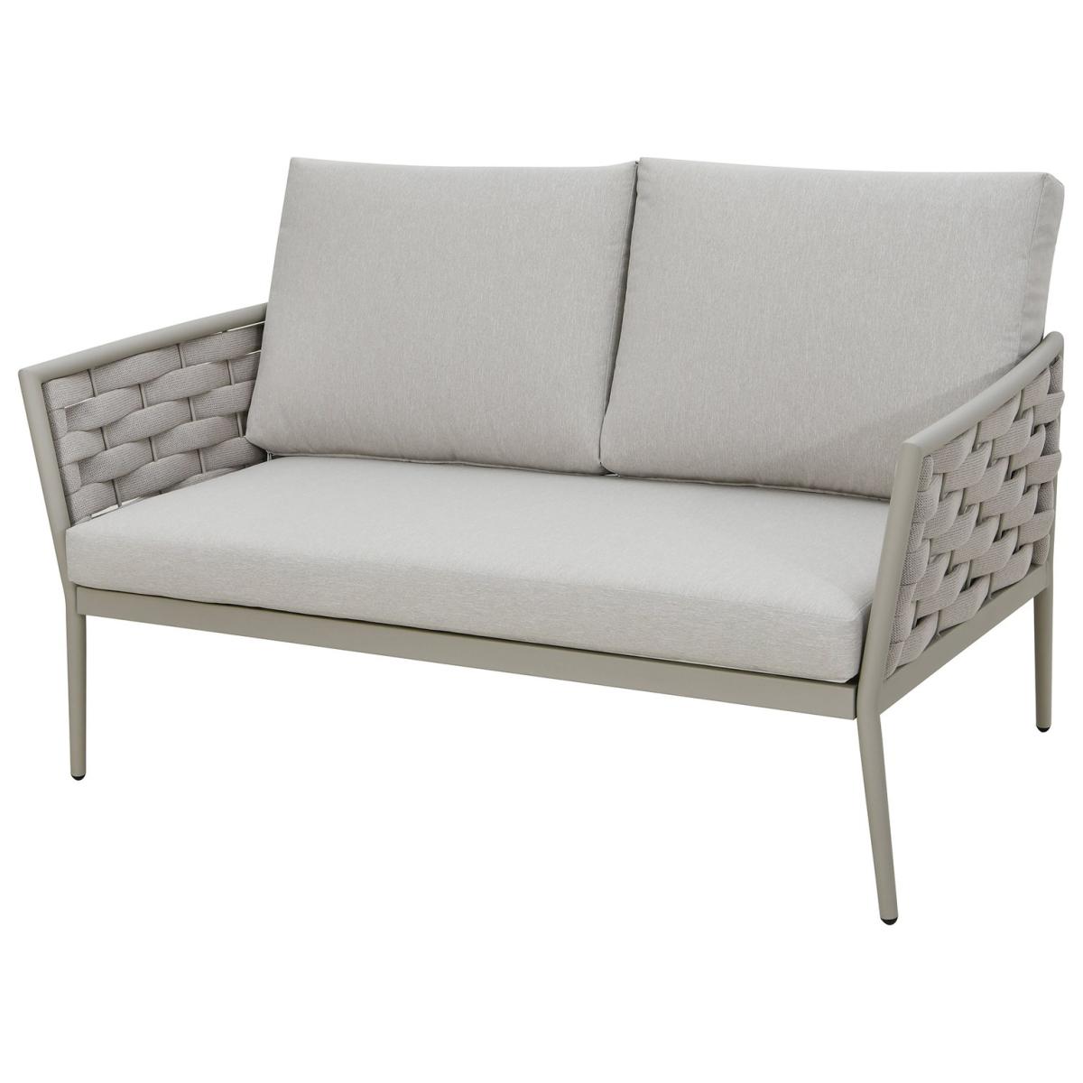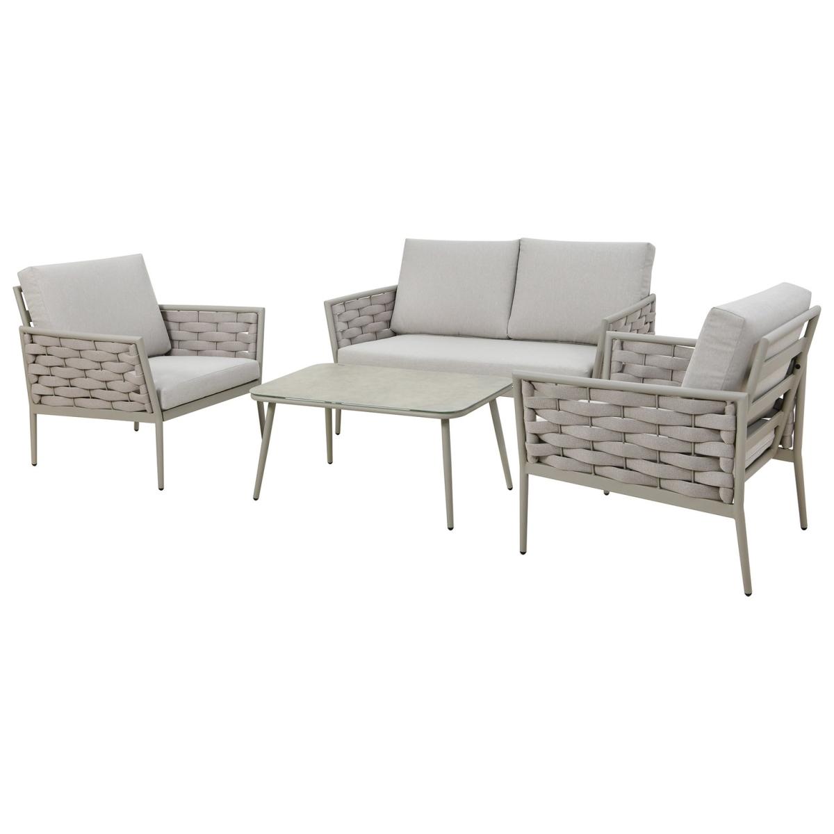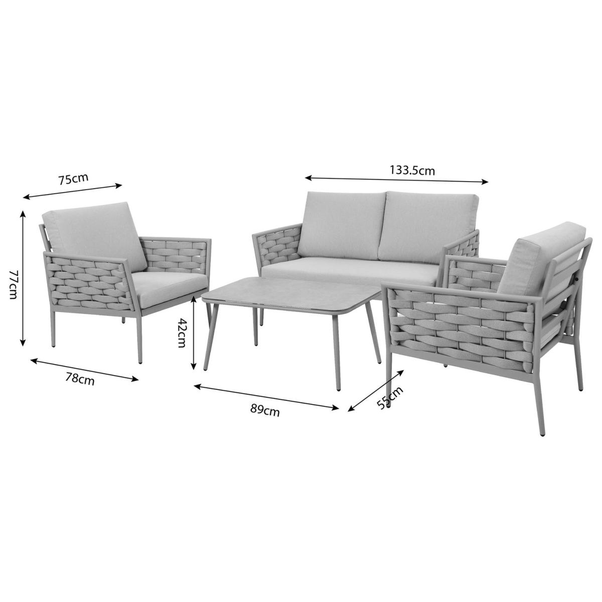 How stylish is this outdoor sofa set? Answer, very. The 2-seater sofa, 2 armchairs and matching coffee table are beautifully designed. The combination of metal frames and wide rope like woven sides complements the comfortable cream cushions. The glass top table has a natural stone effect that pairs perfectly with the neutral tones. Altogether this is cool, contemporary and fashionably sociable garden seating. Part of the Rodes collection. Parasol base not included. Parasol not included. Includes 7 cushions. General features: Set seats 4 people. Set made from metal and polyester. Cover or store inside in winter months to prolong life of the products. Total weight 58.2kg. Garden table features: Glass table top. Table size: H42, W55, L89cm. Removable legs for storage. Chair features: Chair seat and back made from metal. Size H77, W75, D78cm. Seat height 42cm. Seating area size W 59, D65cm. Sofa features: Sofa size H77, W133.5. D78cm. 110kg maximum user weight per sofa. Cushion features: Polyester and cream cushions. Removable covers. Stain resistant. Remove cushions when not in use and store inside. Packaging information: Package 1 size H64, W120, D64cm. Package 1 weight 64.5kg. General Information: Self-assembly - 2 people required. Manufacturer's 1 year guarantee.