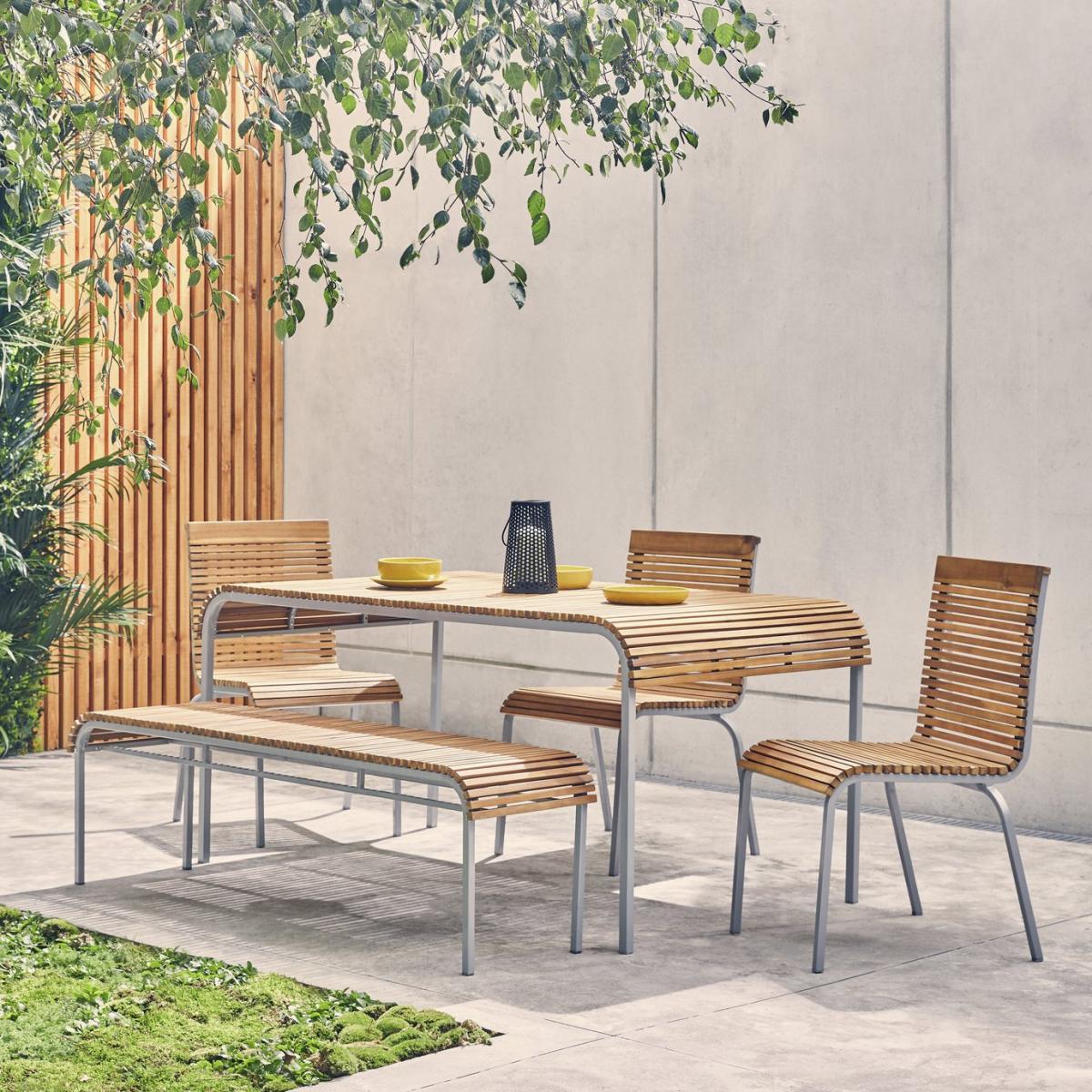 Inspired by nature, the Rolio natural 6 seater slatted acacia wood garden table, bench and chairs will add a contemporary touch to your outdoor space.