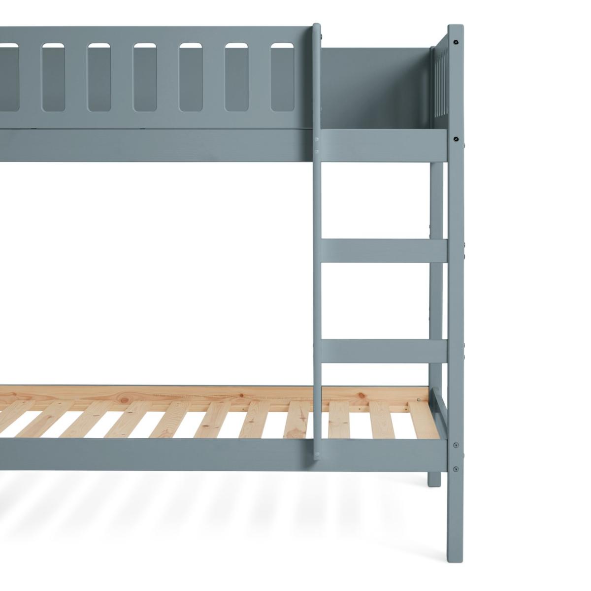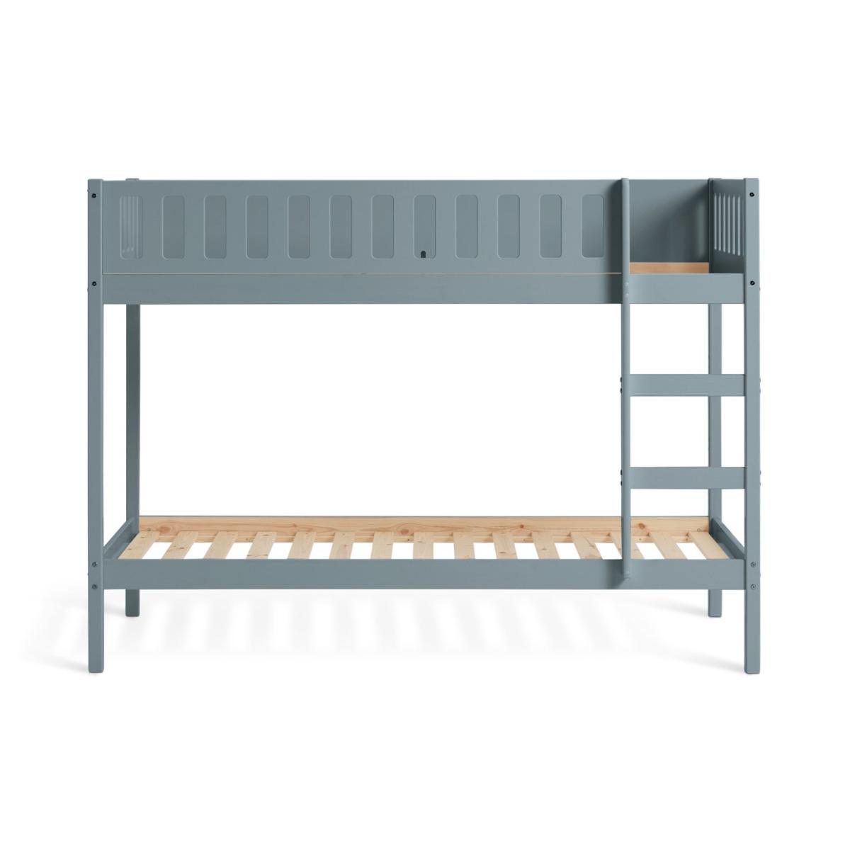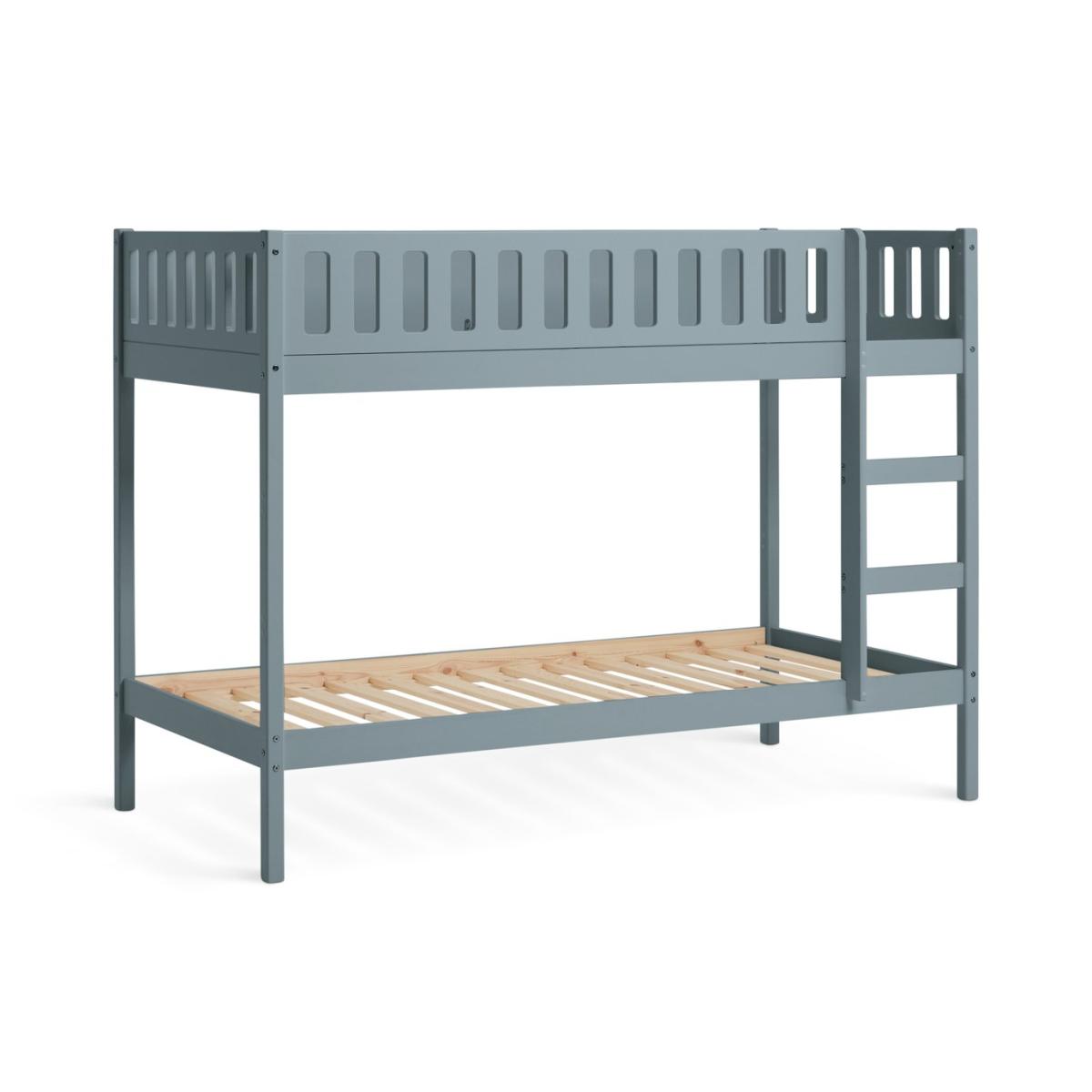 The Ronnie Bunk Bed combines style and practicality, making it the perfect addition to your child's bedroom. Its sleek finish and clean lines bring a sophisticated touch that complements various decor styles. Built with a sturdy frame and durable slats, it ensures long-lasting support and comfort for years of restful sleep. With simple assembly instructions, setting up the bed is quick and hassle-free. Designed with elegance, durability, and convenience in mind, the Ronnie Bunk Bed is an ideal choice for modern living. Part of the Ronnie collection. Bunk: Single bed. Blue bed with a solid wood frame. Includes wooden slats. Packed flat - 2 people recommended. WARNING "This product must be attached to a wall or building structure". Ladder can be positioned either side of the bed. Maximum user weight per bunk 120kg. For ages 6 years and over. Suitable for adult use (safety tested to 100kg). Mattresses: For safety, maximum depth of mattress to be used on top bunk is 16cm. Dimensions: Frame size L195.3, W101.5, H143.8cm. Safety rail height 32cm. Height between bunks 81.6cm. Clearance between floor and underside of bed 24cm. Bed weight 44.9kg. Package dimensions: Package 1 size H17.1, W37.5, D192.5cm. General Information: Manufacturer's 2 year guarantee.