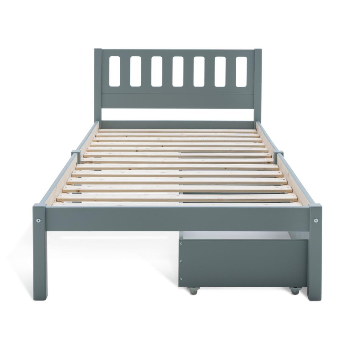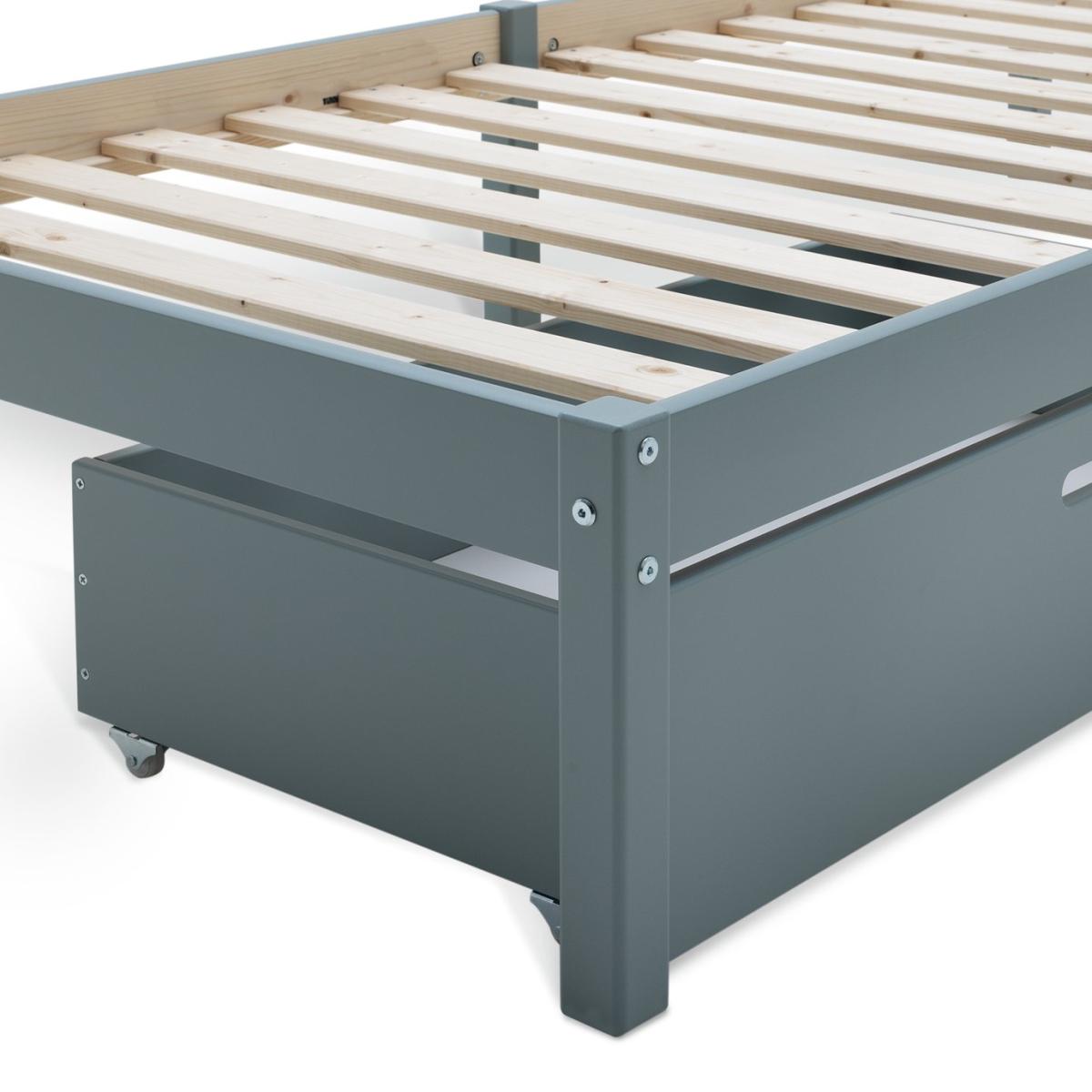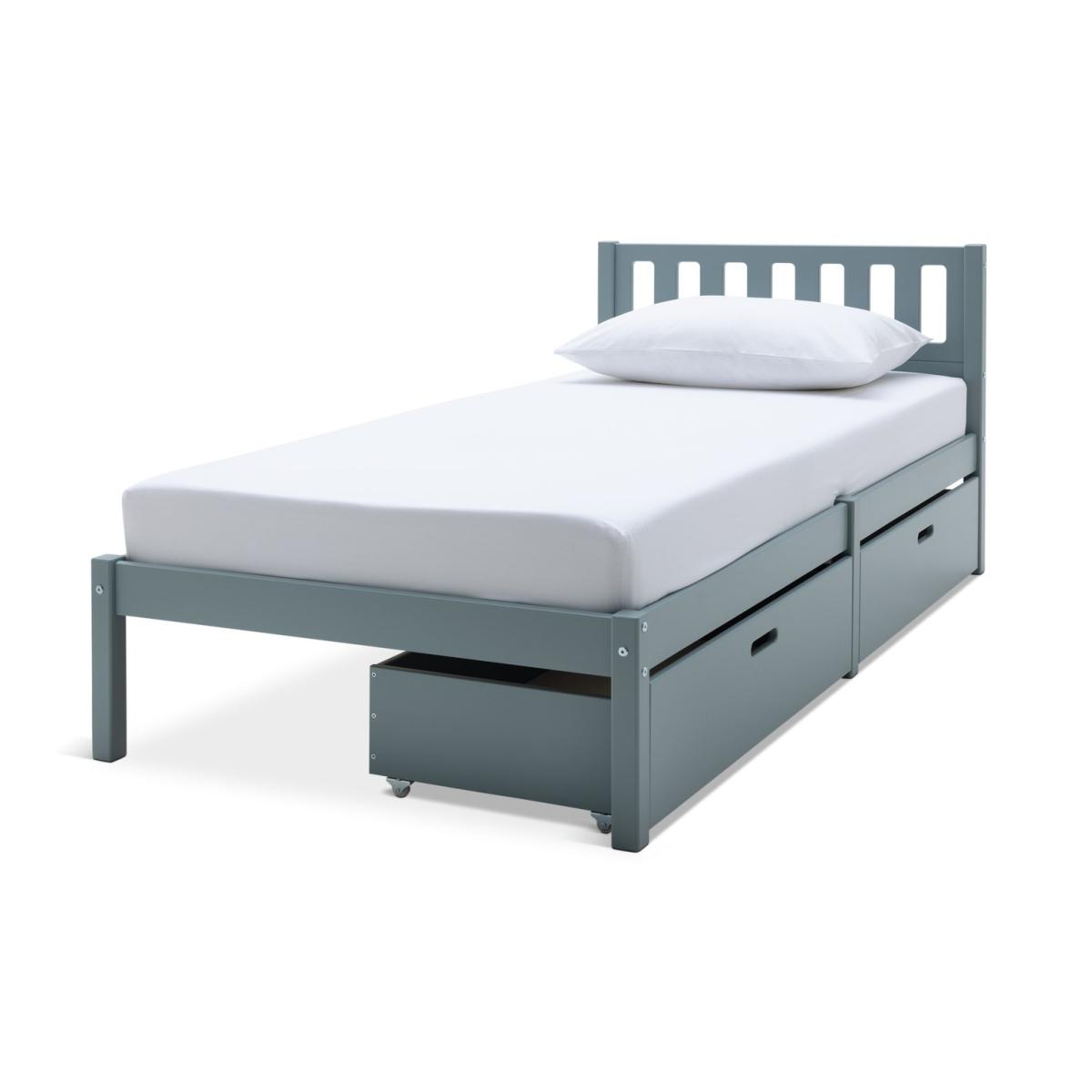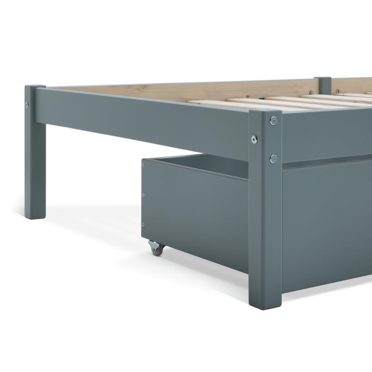Keep it simple with Ronnie. Crafted from solid pine, this shaker style bedframe is designed to stand the test of time and energetic youngsters. The blue grey painted finish brings a modern freshness. Need extra storage? No problem, it comes with 2 freestanding underbed open drawers. Both drawers are on castors so they're a doddle to pull out and tuck away again. Smart, sturdy and made for sweet dreams. Part of the Ronnie collection. Bed frame: Single bed. Grey bed with a mdf and solid wood frame. Includes wooden slats. Packed flat - 2 people recommended. Maximum user weight 120kg. For ages 4 years and over. Suitable for adult use (safety tested to 100kg). Mattress: (not included). Dimensions: Frame size L195.3, W96.3, H76.7cm. Drawer size H23, W90.6, D46.5cm. Package dimensions: Package 1 size H97, W41.8, D11.9cm. Package 2 size H99.4, W45.8, D6.1cm. General information: Manufacturer's 2 year guarantee.
