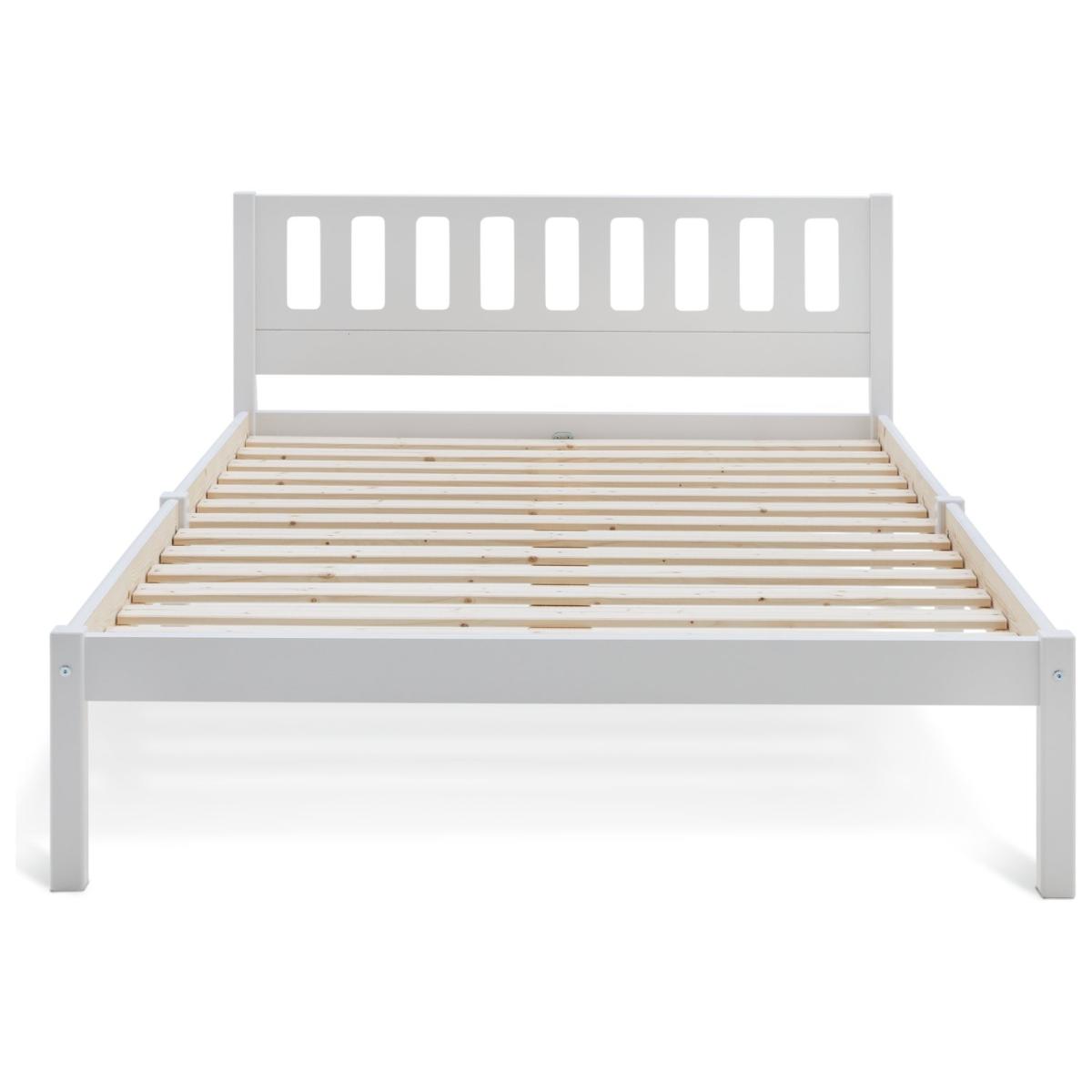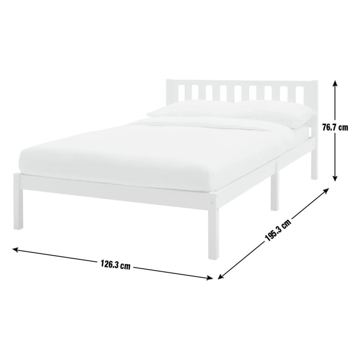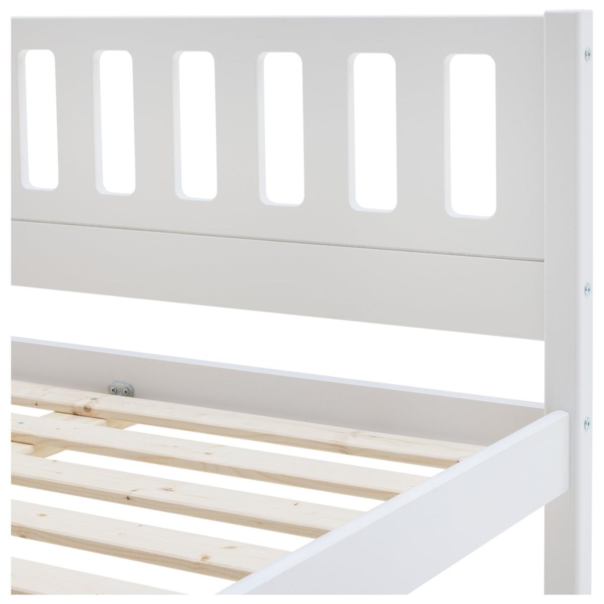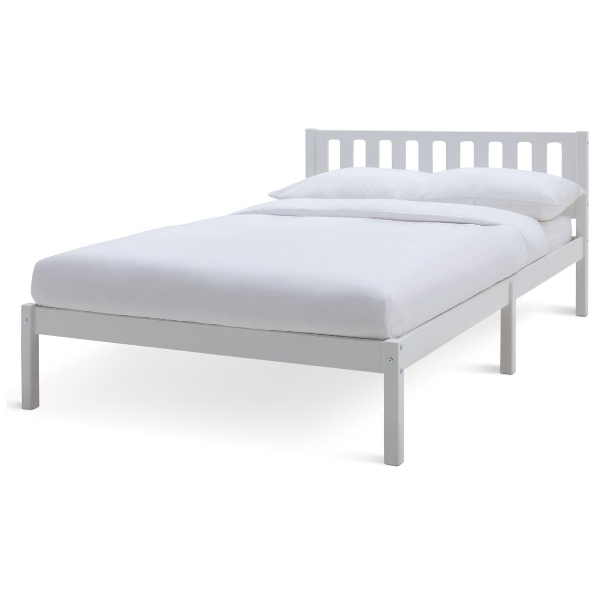 Keep it simple with Ronnie. Crafted from solid pine, this shaker style bedframe is designed to stand the test of time and energetic youngsters. The crisp white painted finish brings a modern freshness. Smart, sturdy and made for sweet dreams. Part of the Ronnie collection. Bed frame: Small double bed. White bed with a mdf and solid wood frame. Includes wooden slats. Packed flat - 2 people recommended. Maximum user weight 220kg. For ages 4 years and over. Suitable for adult use (safety tested to 100kg). Mattress: (not included). Dimensions: Frame size L195.3, W126.3, H76.7cm. Package dimensions: Package 1 size H125.5, W38.6, D13.9cm. General information: Manufacturer's 2 year guarantee.