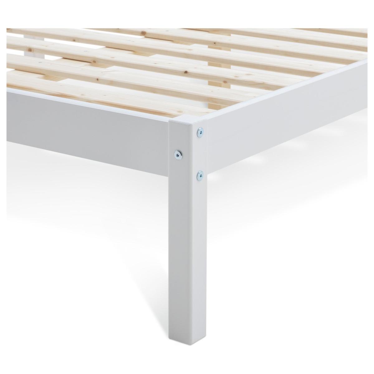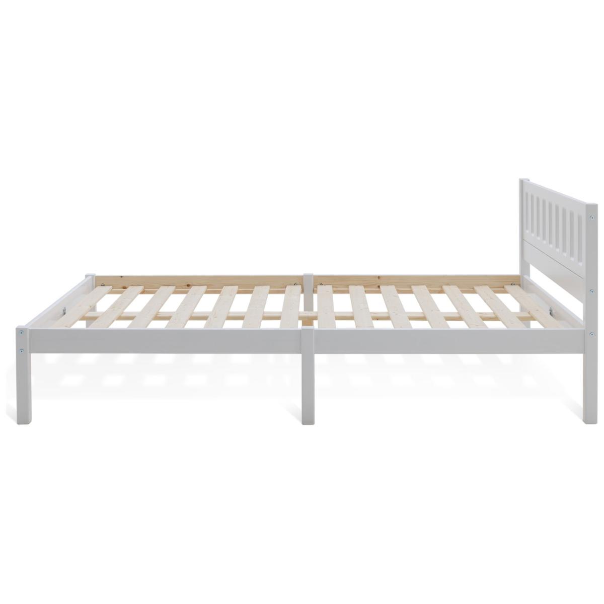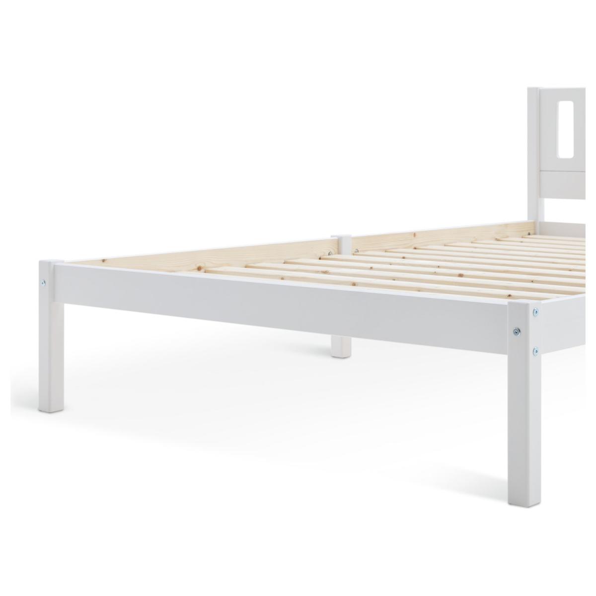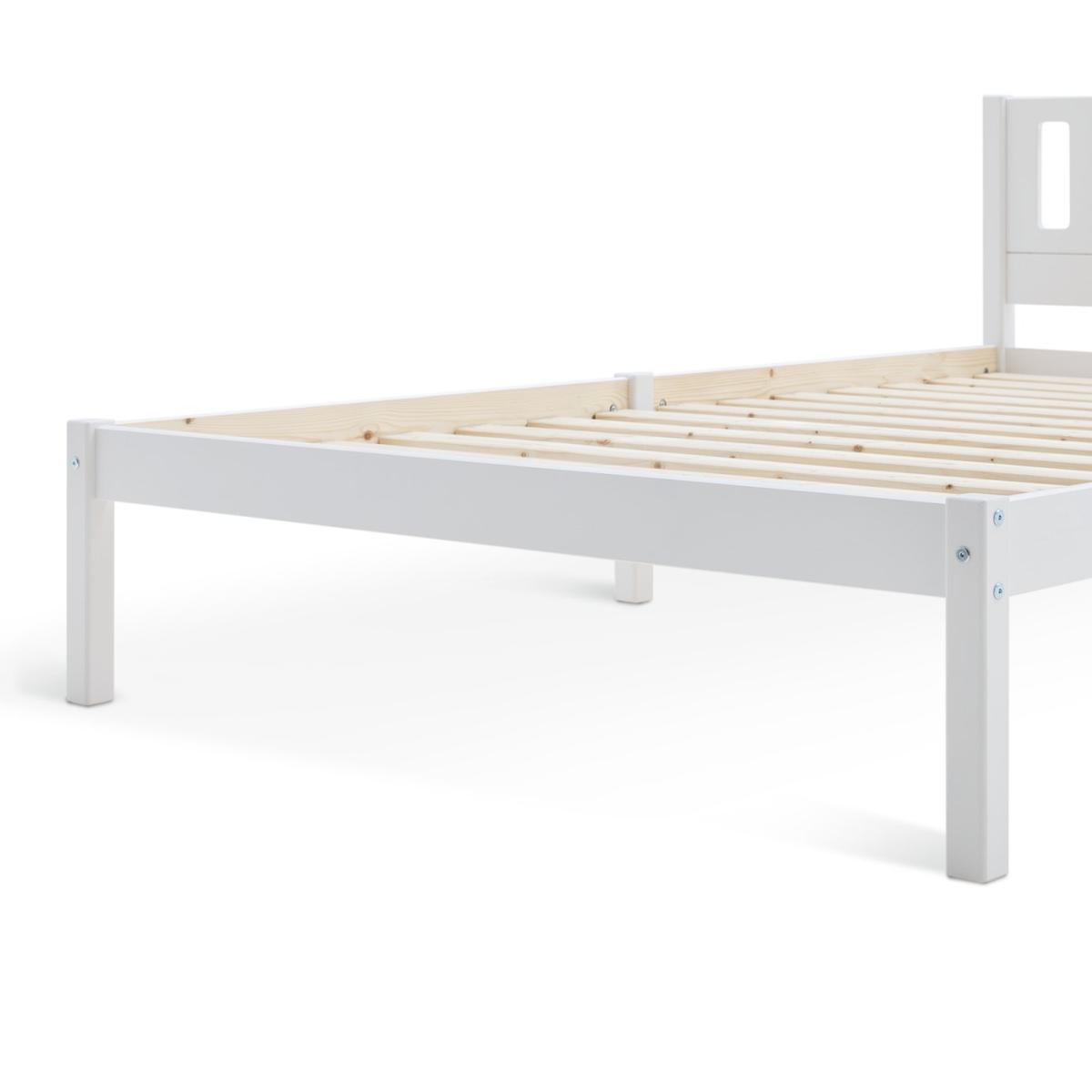 Keep it simple with Ronnie. Crafted from solid pine, this shaker style bedframe is designed to stand the test of time and energetic youngsters. The crisp white painted finish brings a modern freshness. Smart, sturdy and made for sweet dreams. Part of the Ronnie collection. Bed frame: Small double bed. White bed with a mdf and solid wood frame. Includes wooden slats. Packed flat - 2 people recommended. Maximum user weight 220kg. For ages 4 years and over. Suitable for adult use (safety tested to 100kg). Mattress: (not included). Dimensions: Frame size L195.3, W126.3, H76.7cm. Package dimensions: Package 1 size H125.5, W38.6, D13.9cm. General information: Manufacturer's 2 year guarantee.