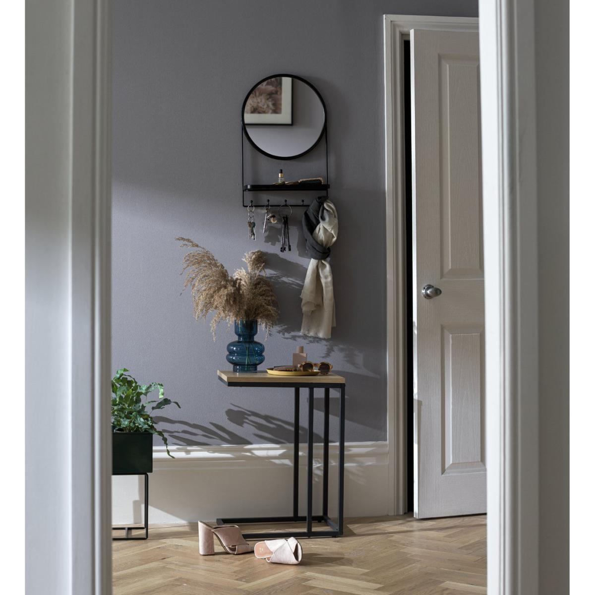 Find your keys in a flash with this three-in-one shelf mirror. A stylish piece, it features a round black metal framed mirror above a tray and five hooks. Welcome a modern touch of industrial chic to your hallway or bedroom and make the most of a small space. Perfect for hanging keys, scarves or jewellery – those bits and bobs you can never find as you head out. Use the hidden keyhole brackets to mount it securely. Here's a handy tip. Make sure you hang it at the right height to check your reflection. Tick!