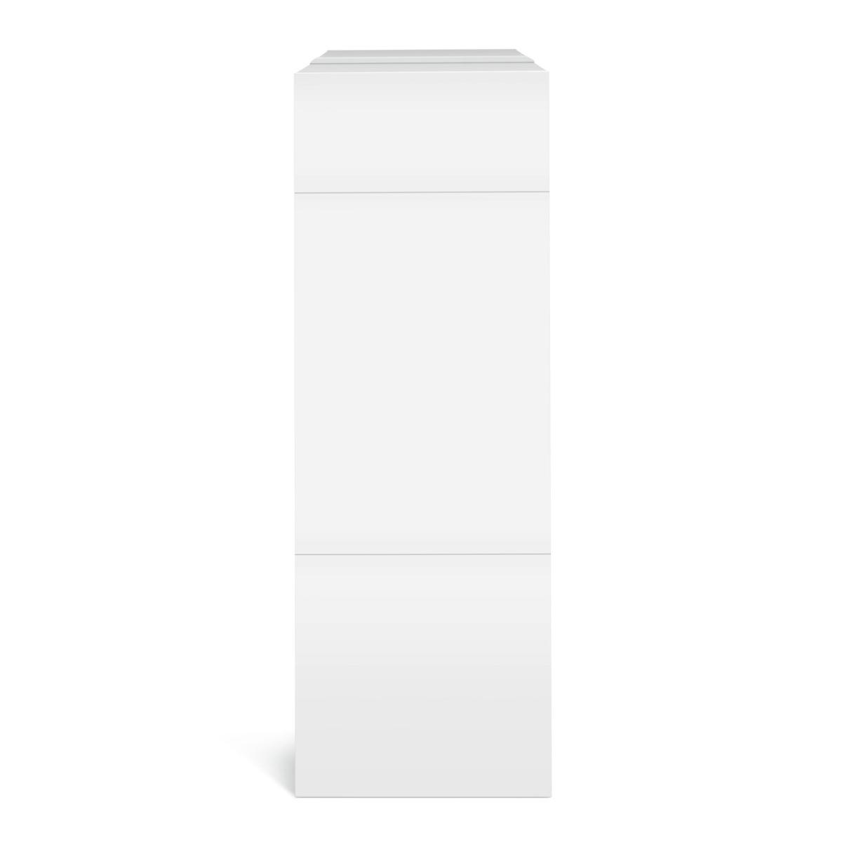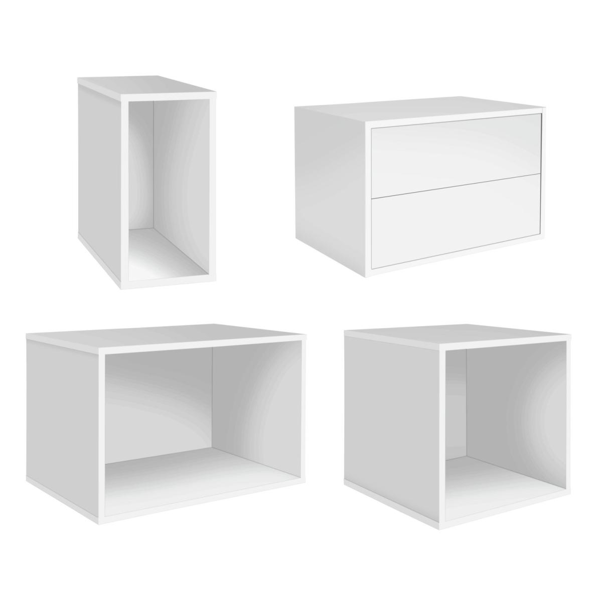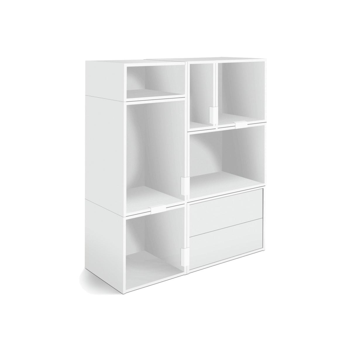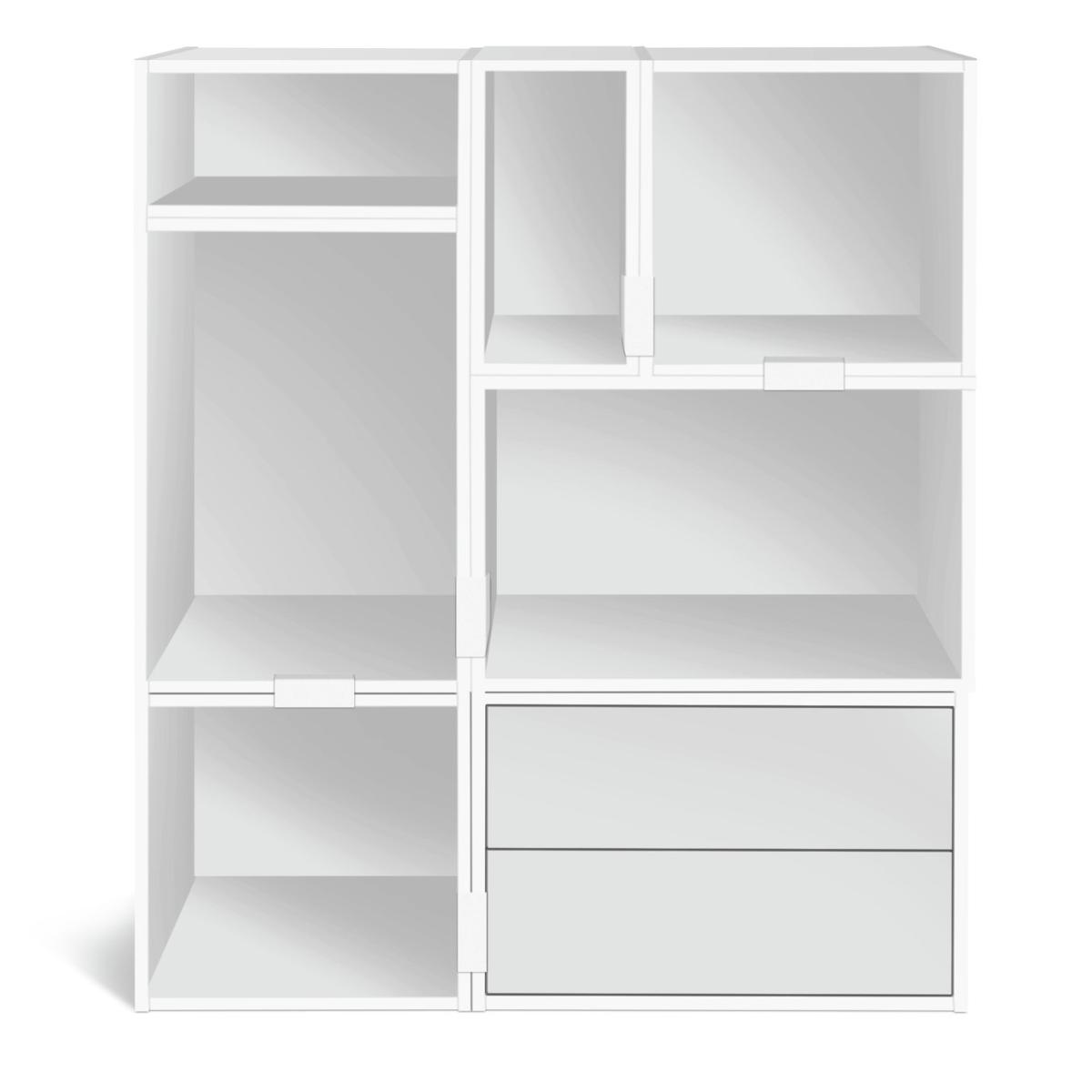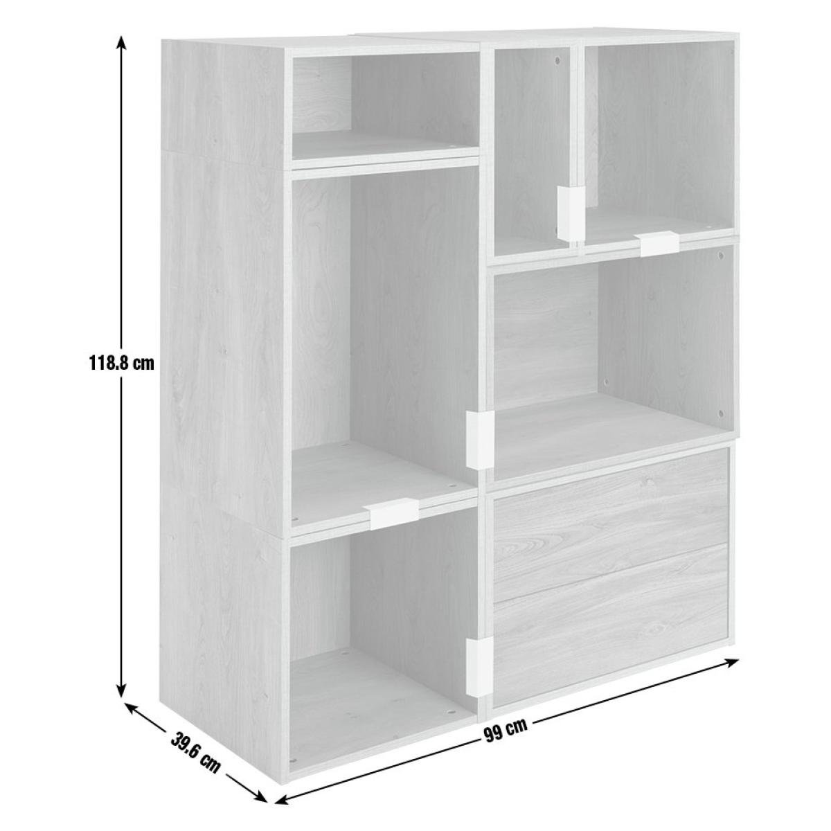 Create spaces that work for you with our bright modern modular bookcase. Designed to be personalised, you can configurate the various sized shelves into cubic areas to suit your display items. From books to baskets, flowers to fine art. All against a pure white backdrop. With 2 handleless soft close drawers, the smooth minimalist look is complete. Part of the Rubrics. Made from wood effect - white finish. Complete unit dimensions: H118.8, W99, D39.6cm. Weight 55kg. Package includes 7 modules. Module details: 2 x (H39.7, W19.8, D39.7cm). 2 x (H39.7, W39.7, D39.7cm). 2 x (H39.7, W59.4, D39.7cm). 1 x (H39.7, W59.4, D39.7cm). 14 x metal fixing plates and fittings. 7 x wall fittings. Drawer module: 2 soft close drawers. Internal drawer dimensions H11.1, W51.1, D33.4cm. Package Dimensions: Package 1 dimensions: H7.6, W44.3, D42.2cm. Package 1 weight: 5.5kg. Package 2 dimensions: H7.6, W48.9, D42.2cm. Package 2 weight: 7.3kg. Package 3 dimensions: H7.6, W67.2, D42.2cm. Package 3 weight: 9.5kg. Package 4 dimensions: H12.7, W67.2, D42.2cm. Package 4 weight: 17.3kg. General Information: Packed flat - 2 people recommended. If the finished unit is over 60cm high it must be securely attached to the wall to prevent overturning. FSC certified meaning the materials used for this product are responsibly sourced. Manufacturer's 1 year guarantee.