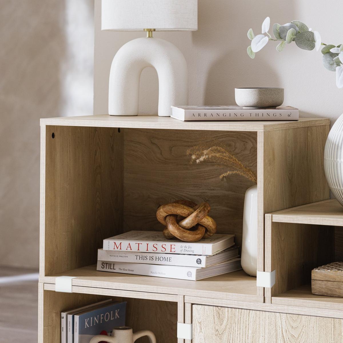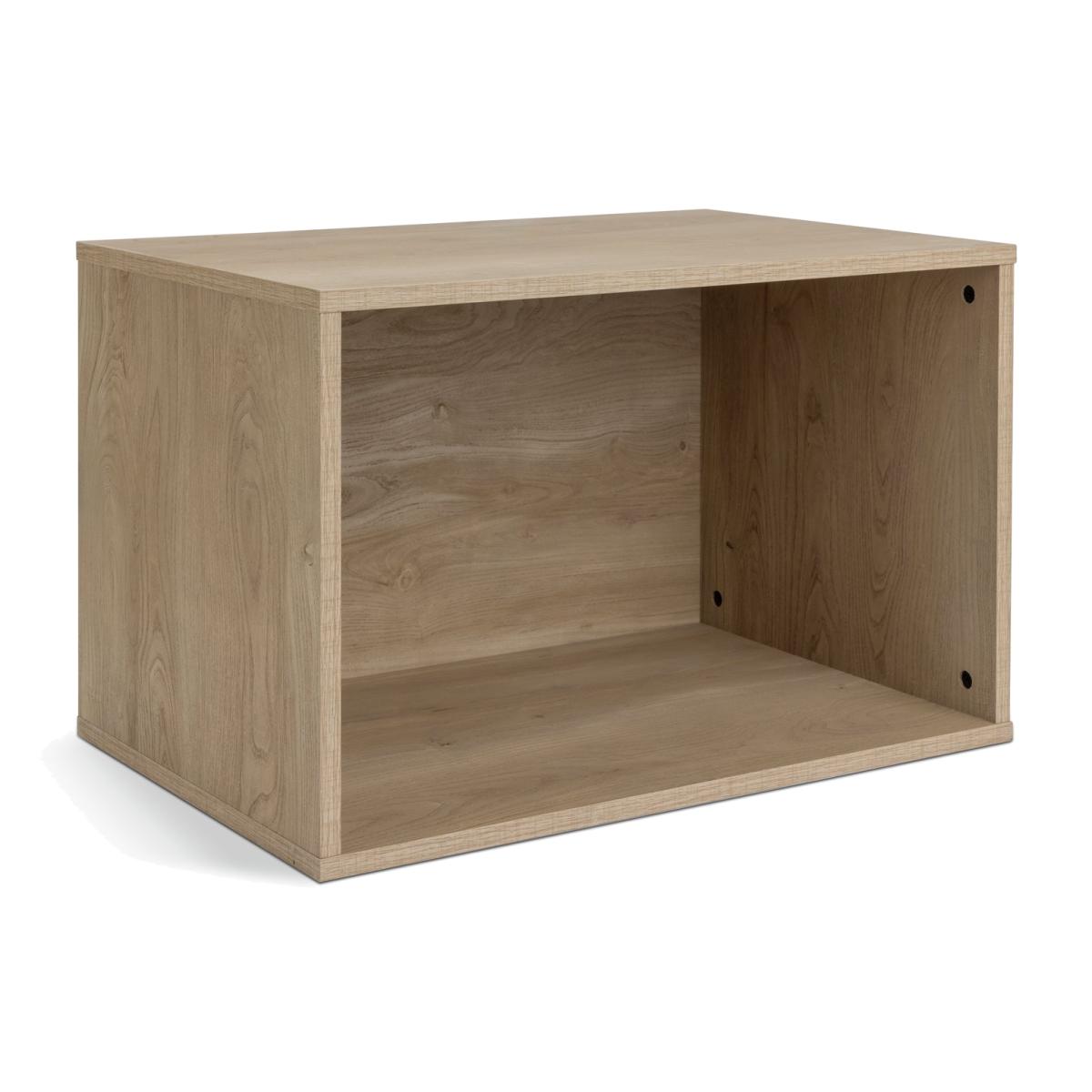 Create spaces that work for you with our oak finish modular shelving unit. This rectangular storage cube can be used singularly or as part of a stack. Also pairs with the other pieces in the Rubrics modular collection for a minimalist look with the warmth of wood. Part of the Rubrics collection. Made from wood effect - oak finish. Package includes 1 x (H39.7 W59.4 D39.7). Weight 8.5kg. Maximum load 15kg. 2 x metal fixing plates and fittings. 1 x wall fittings. Package dimensions: Package 1 H7.6, W67.2, D42.2cm. Weight 9.5kg. General Information: Packed flat - 2 people recommended. FSC certified meaning the materials used for this product are responsibly sourced. Manufacturer's 1 year.