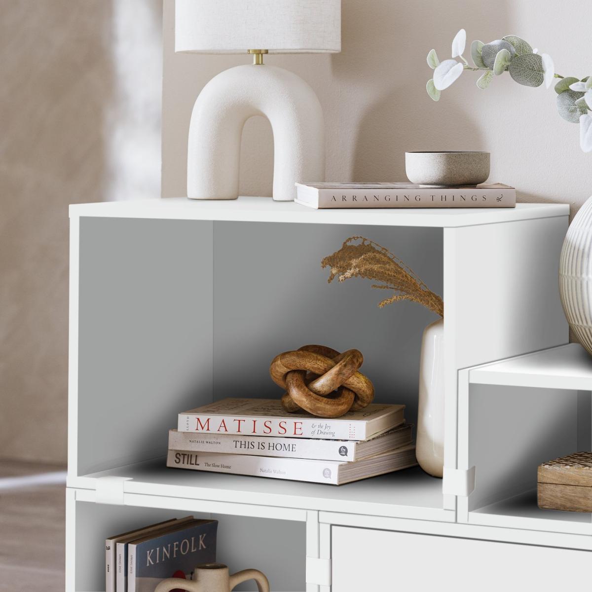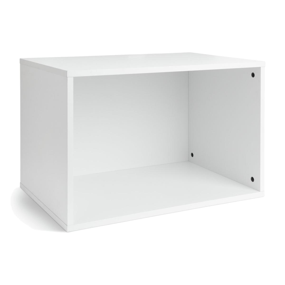 Create spaces that work for you with our modern modular shelving unit. This white rectangular storage cube can be used singularly or as part of a stack. Also pairs with the other pieces in the Rubrics modular collection for a bright, minimalist look. Part of the Rubrics collection. Made from wood effect - white finish. Package includes 1 x (H39.7 W59.4 D39.7). Weight 8.5kg. Maximum load 15kg. 2 x metal fixing plates and fittings. 1 x wall fittings. Package dimensions: Package 1 H7.6, W67.2, D42.2cm. Weight 9.5kg. General Information: Packed flat - 2 people recommended. FSC certified meaning the materials used for this product are responsibly sourced. Manufacturer's 1 year.