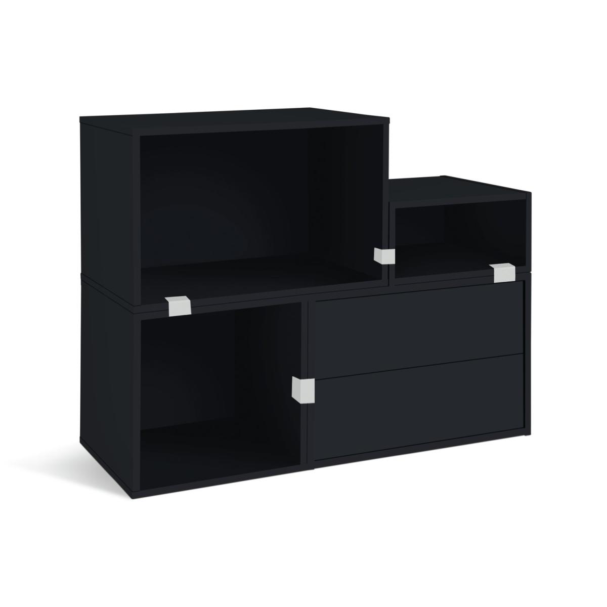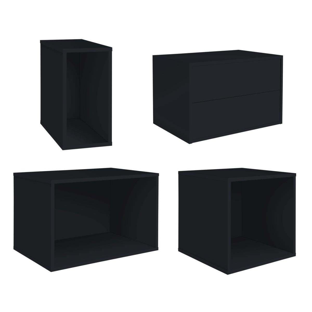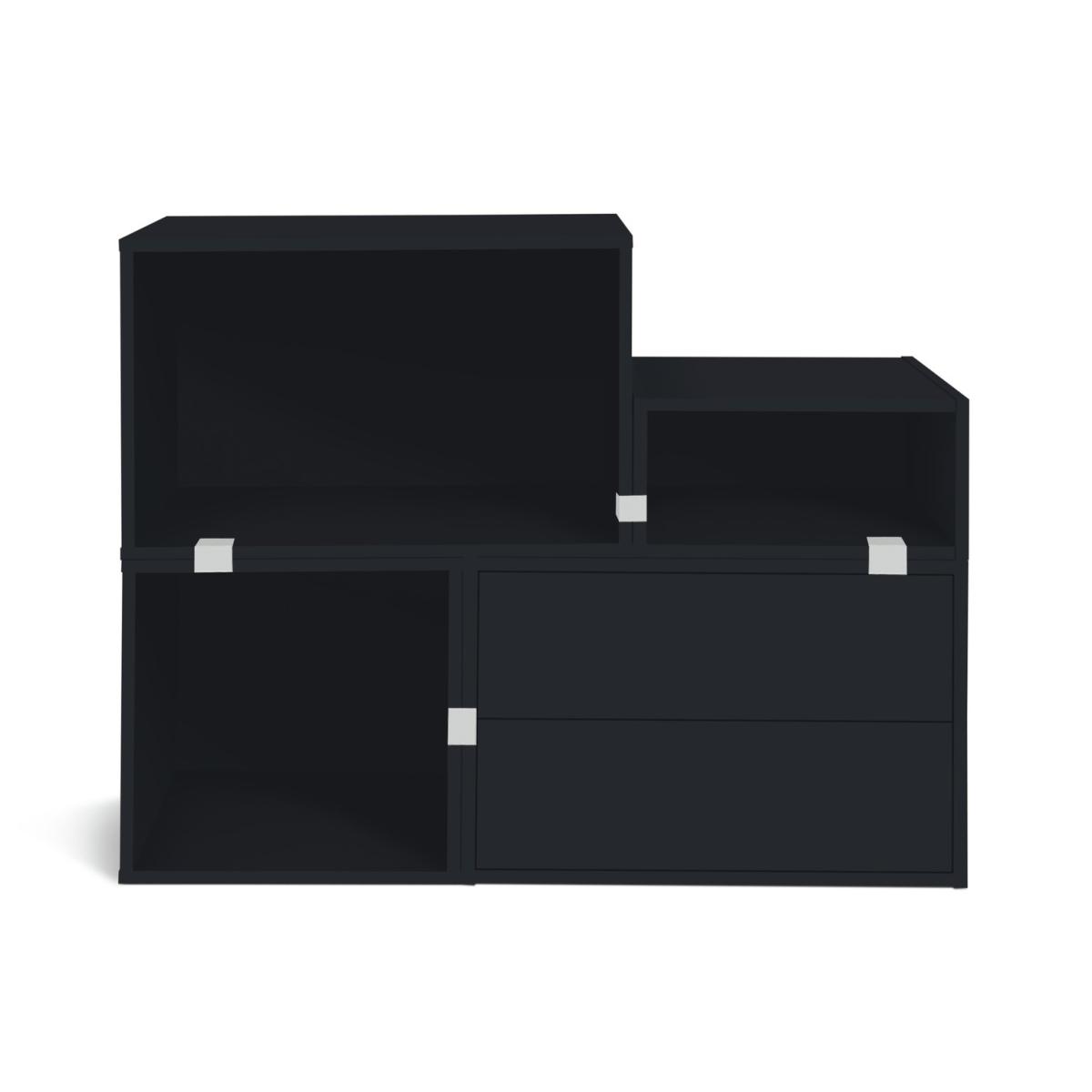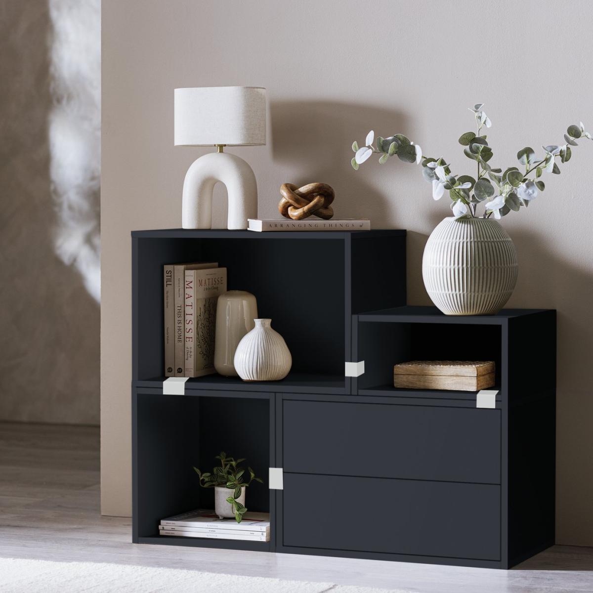 Create spaces that work for you with our compact modular bookcase. Designed to be personalised, you can configurate the various sized shelves into cubic areas to suit your display items. From books and magazines, flowers to collectables. All against a stark black backdrop. With 2 handleless soft close drawers, the smooth minimalist look is complete. Part of the Rubrics. Made from wood effect - black finish. Complete unit dimensions: H79.2, W99, D39.6cm. Weight 35.5kg. Package includes 4 modules with a total maximum load of75kg. Module details: 1 x (H39.7, W59.4, D39.7cm). 1 x (H39.7, W19.8, D39.7cm). 1 x (H39.7, W39.7, D39.7cm). 1 x (H39.7, W59.4, D39.7cm). 8 x metal fixing plates and fittings. 4 x wall fittings. Drawer module: 2 soft close drawers. Internal drawer dimensions H11.1, W51.1, D33.4cm. Package Dimensions: Package 1 dimensions: H7.6, W67.2, D42.2cm. Package 1 weight: 9.5kg. Package 2 dimensions: H7.6, W44.3, D42.2cm. Package 2 weight: 5.5kg. Package 3 dimensions: H7.6, W48.9, D42.2cm. Package 3 weight: 7.3kg. Package 4 dimensions: H7.6, W67.2, D42.2cm. Package 4 weight: 9.5kg. General Information: Packed flat - 2 people recommended. If the finished unit is over 60cm high it must be securely attached to the wall to prevent overturning. FSC certified meaning the materials used for this product are responsibly sourced. Manufacturer's 1 year guarantee.
