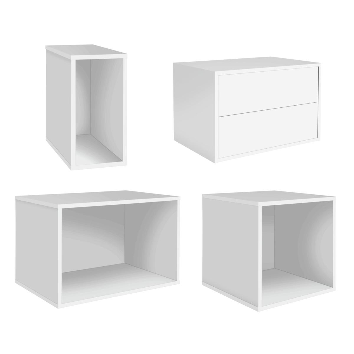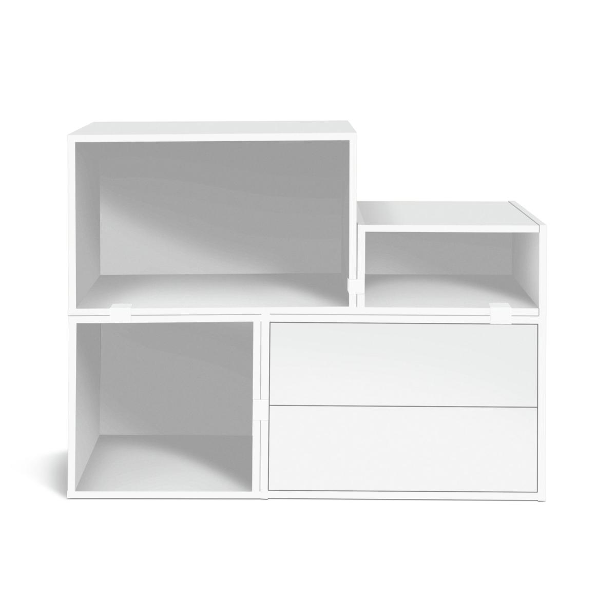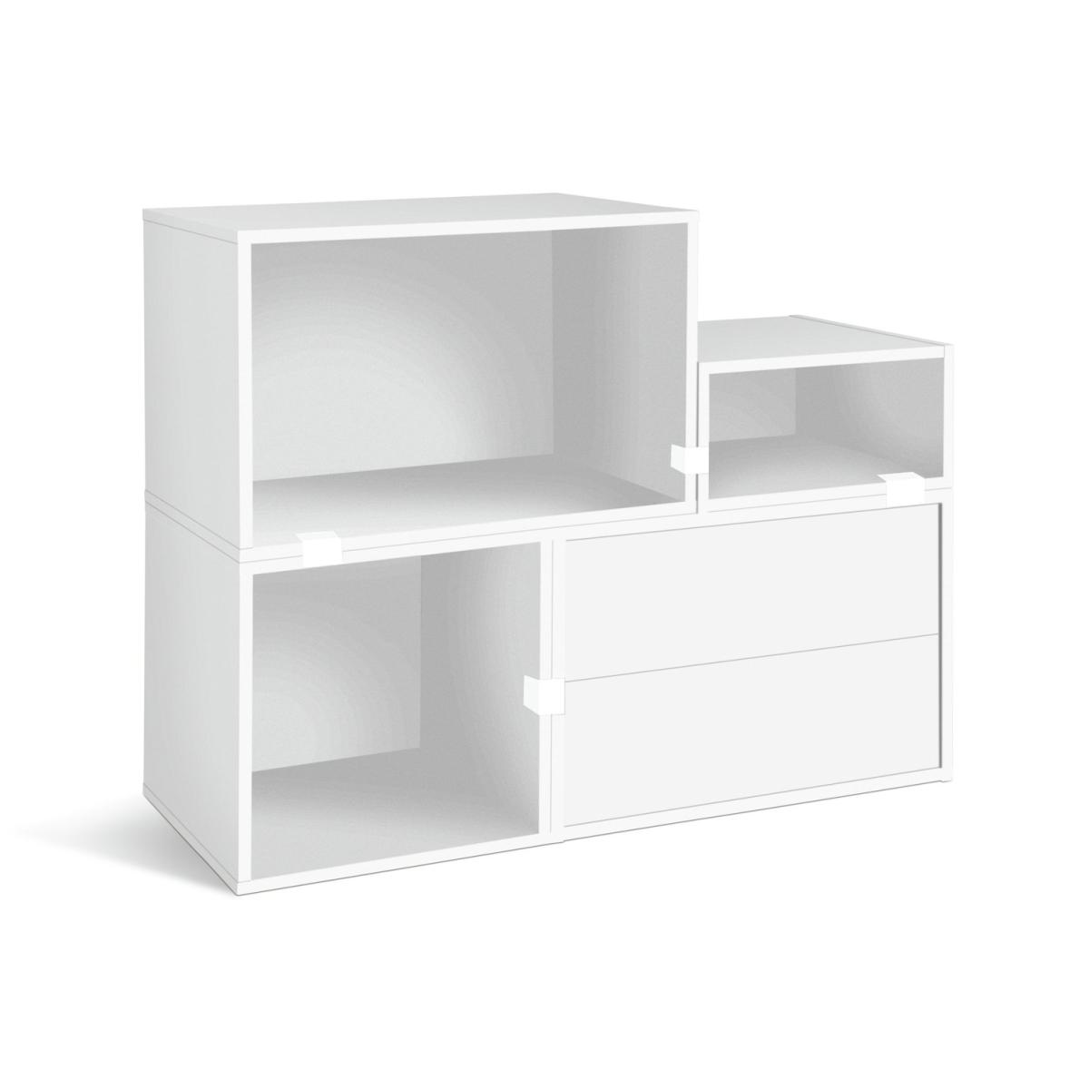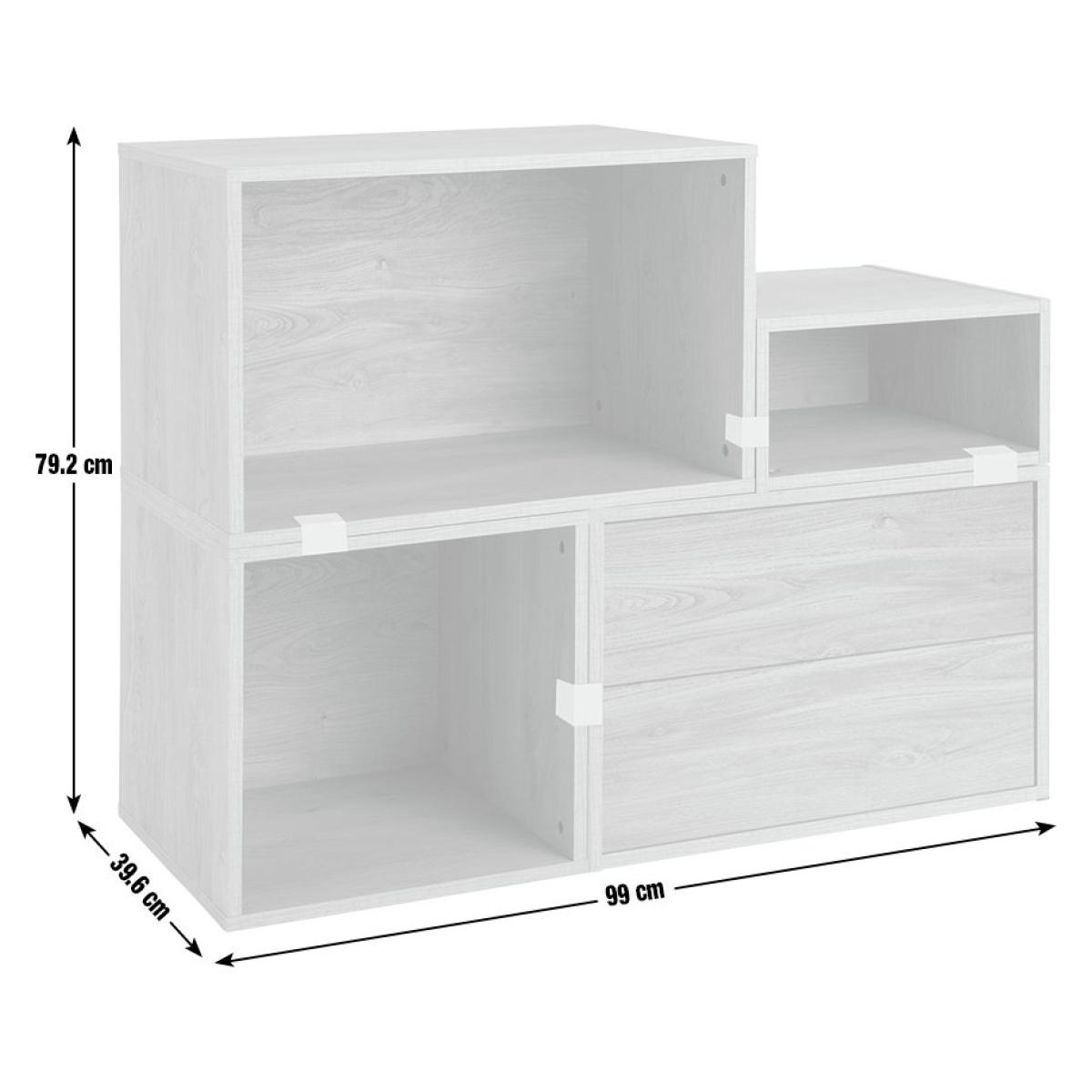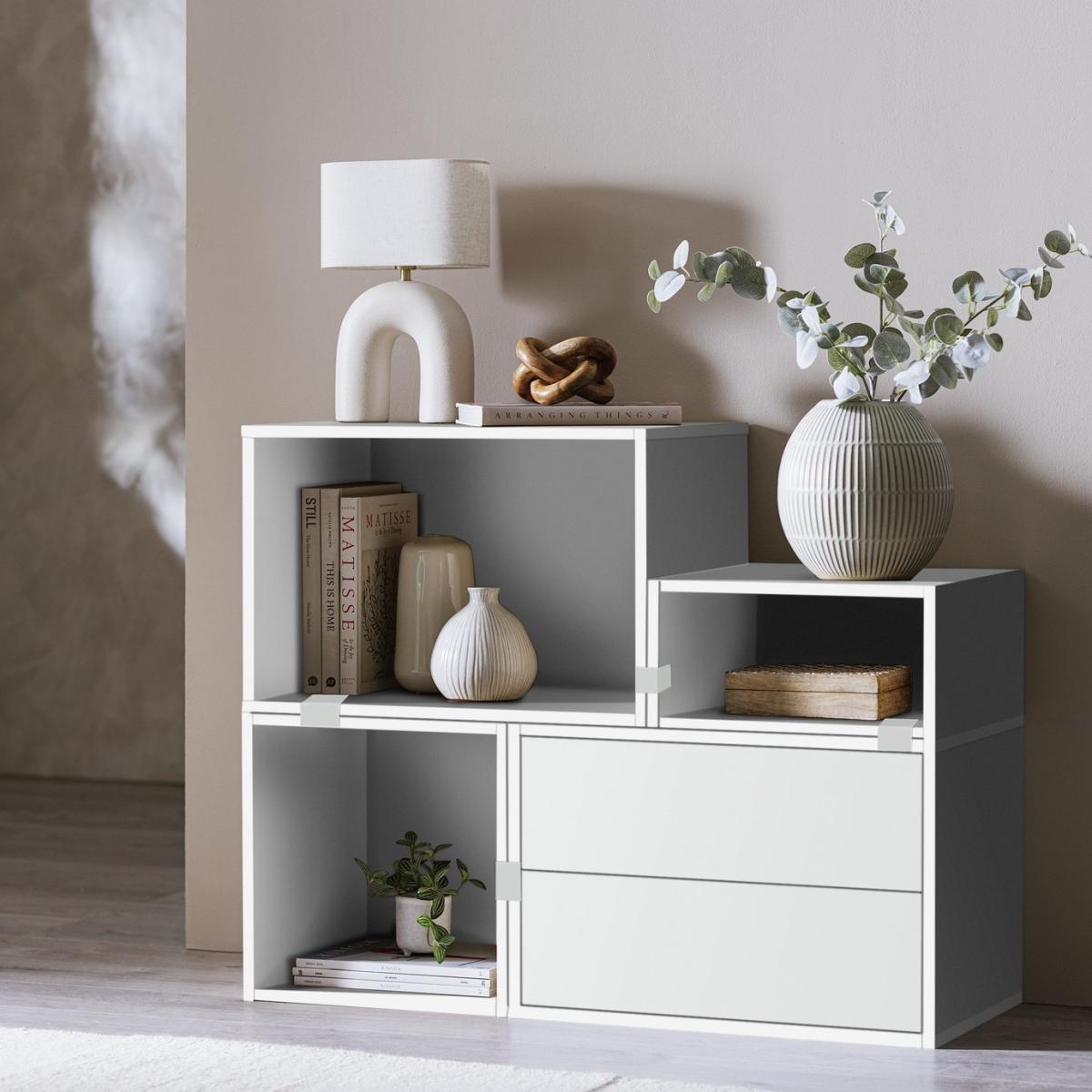 Create spaces that work for you with our bright compact modular bookcase. Designed to be personalised, you can configurate the various sized shelves into cubic areas to suit your display items. From books and magazines to flowers and collectables. All against a pure white backdrop. With 2 handleless soft close drawers, the smooth minimalist look is complete. Part of the Rubrics. Made from wood effect - white finish. Complete unit dimensions: H79.2, W99, D39.6cm. Weight 35.5kg. Package includes 4 modules with a total maximum load of75kg. Module details: 1 x (H39.7, W59.4, D39.7cm). 1 x (H39.7, W19.8, D39.7cm). 1 x (H39.7, W39.7, D39.7cm). 1 x (H39.7, W59.4, D39.7cm). 8 x metal fixing plates and fittings. 4 x wall fittings. Drawer module: 2 soft close drawers. Internal drawer dimensions H11.1, W51.1, D33.4cm. Package Dimensions: Package 1 dimensions: H7.6, W67.2, D42.2cm. Package 1 weight: 9.5kg. Package 2 dimensions: H7.6, W44.3, D42.2cm. Package 2 weight: 5.5kg. Package 3 dimensions: H7.6, W48.9, D42.2cm. Package 3 weight: 7.3kg. Package 4 dimensions: H7.6, W67.2, D42.2cm. Package 4 weight: 9.5kg. General Information: Packed flat - 2 people recommended. If the finished unit is over 60cm high it must be securely attached to the wall to prevent overturning. FSC certified meaning the materials used for this product are responsibly sourced. Manufacturer's 1 year guarantee.