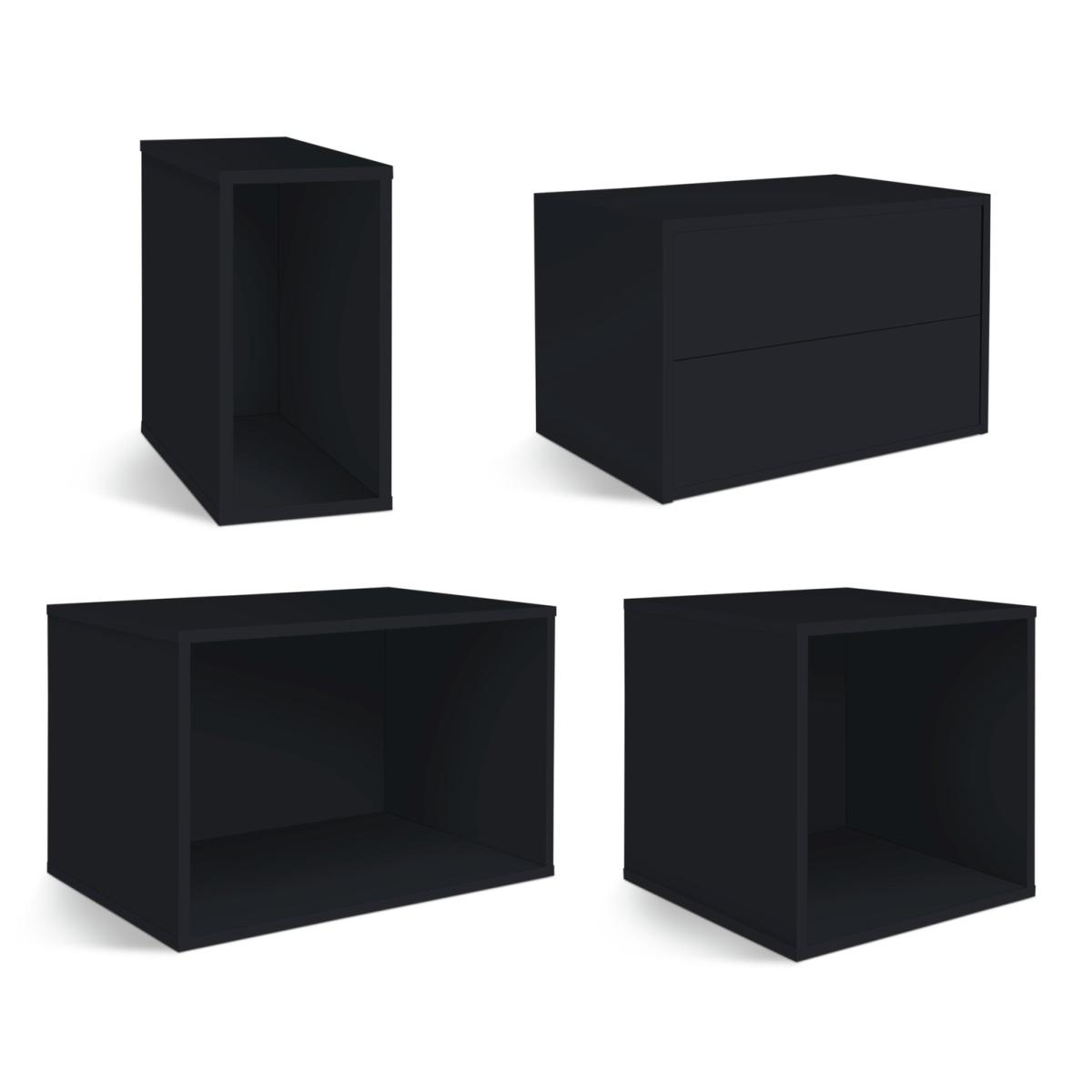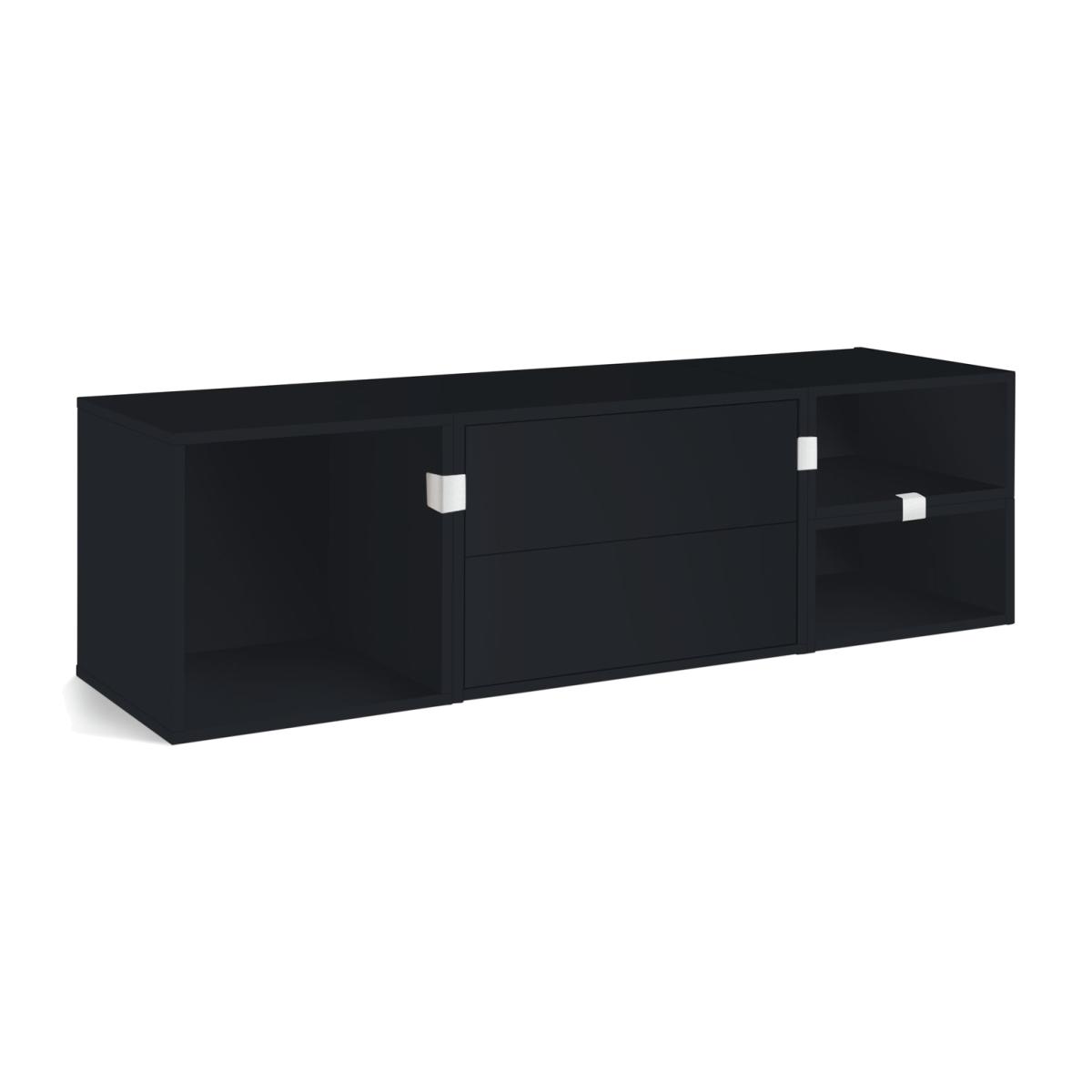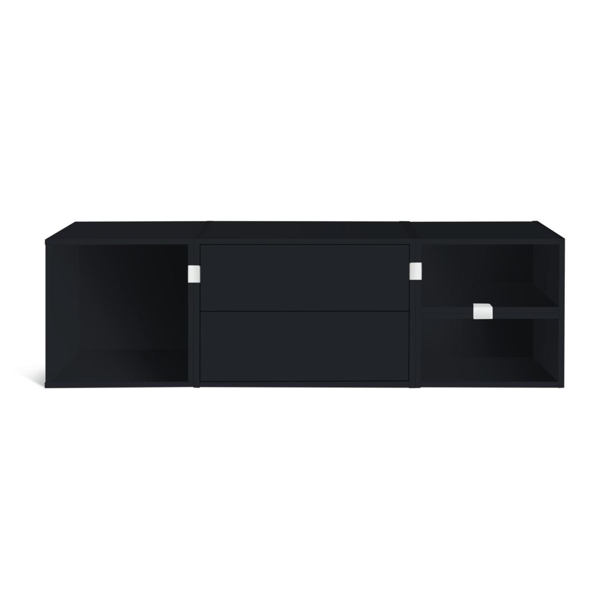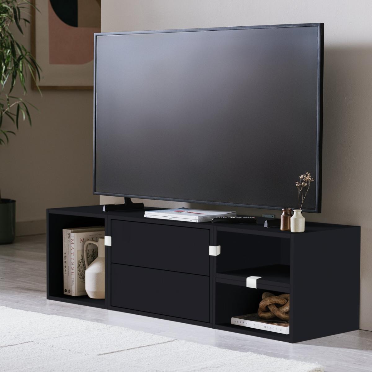 Create spaces that work for you with our modern modular TV unit. Designed to be personalised, you can configure the 4 modules, including shelves and 2 handleless soft close drawers, to suit your tech. A stark black backdrop completes the smooth minimalist look. Part of the Rubrics. Made from wood effect - black finish. Complete unit dimensions: H39.6, W138.6, D39.6cm. Weight 31.5kg. Package includes 4 modules with a total maximum load of75kg. Module details: 1 x (H39.7, W39.7, D39.7cm). 1 x (H39.7, W59.4, D39.7cm). 1 x (H39.7, W19.8, D39.7cm). 8 x metal fixing plates and fittings. 4 x wall fittings. Drawer module: 2 soft close drawers. Internal drawer dimensions H11.1, W51.1, D33.4cm. Package Dimensions: Package 1 dimensions: H7.6, W48.9, D42.2cm. Package 1 weight: 7.3kg. Package 2 dimensions: H12.7, W67.2, D42.2cm. Package 2 weight: 17.3kg. Package 3 dimensions: H7.6, W44.3, D42.2cm. Package 3 weight: 5.5kg. General Information: Packed flat - 2 people recommended. If the finished unit is over 60cm high it must be securely attached to the wall to prevent overturning. FSC certified meaning the materials used for this product are responsibly sourced. Manufacturer's 1 year guarantee.