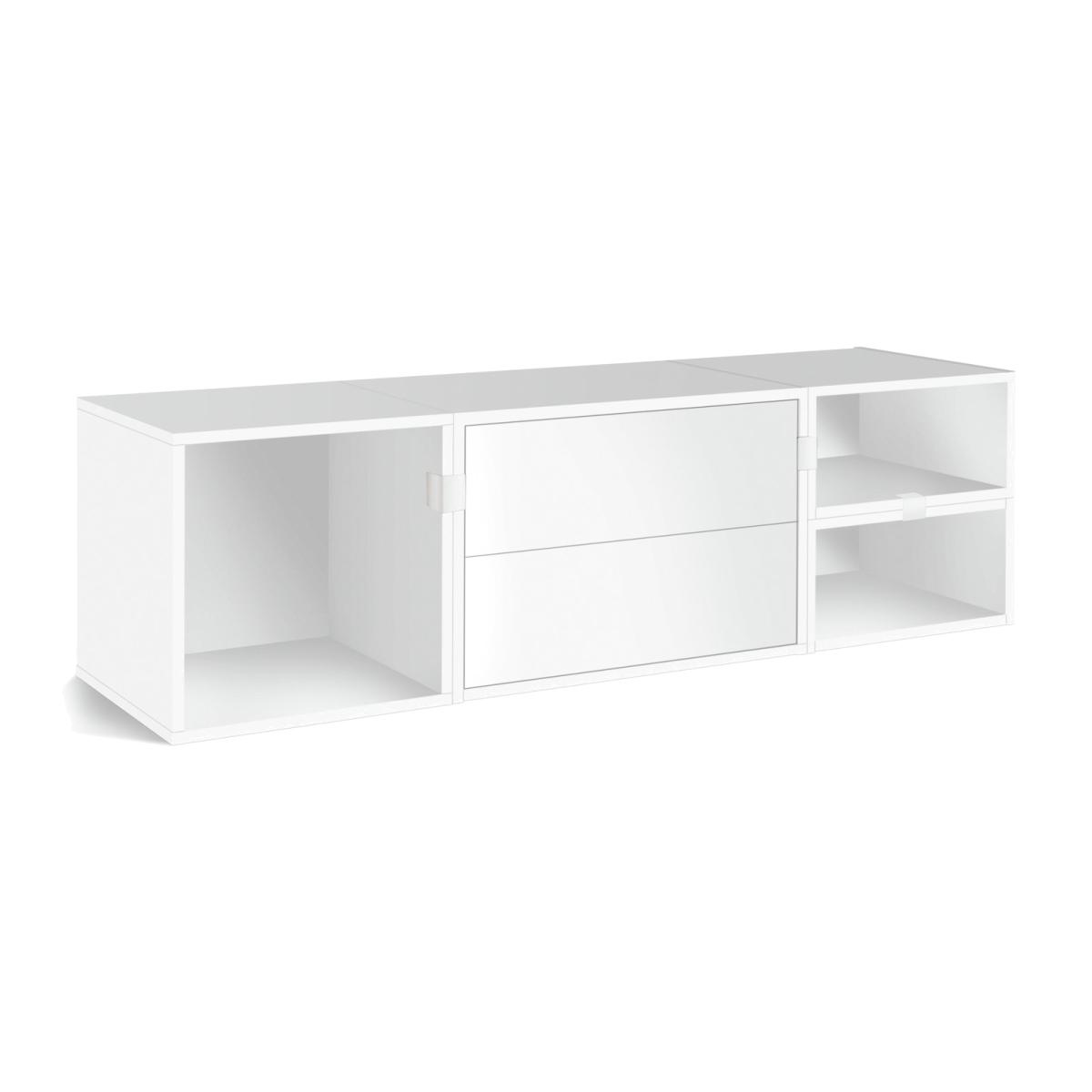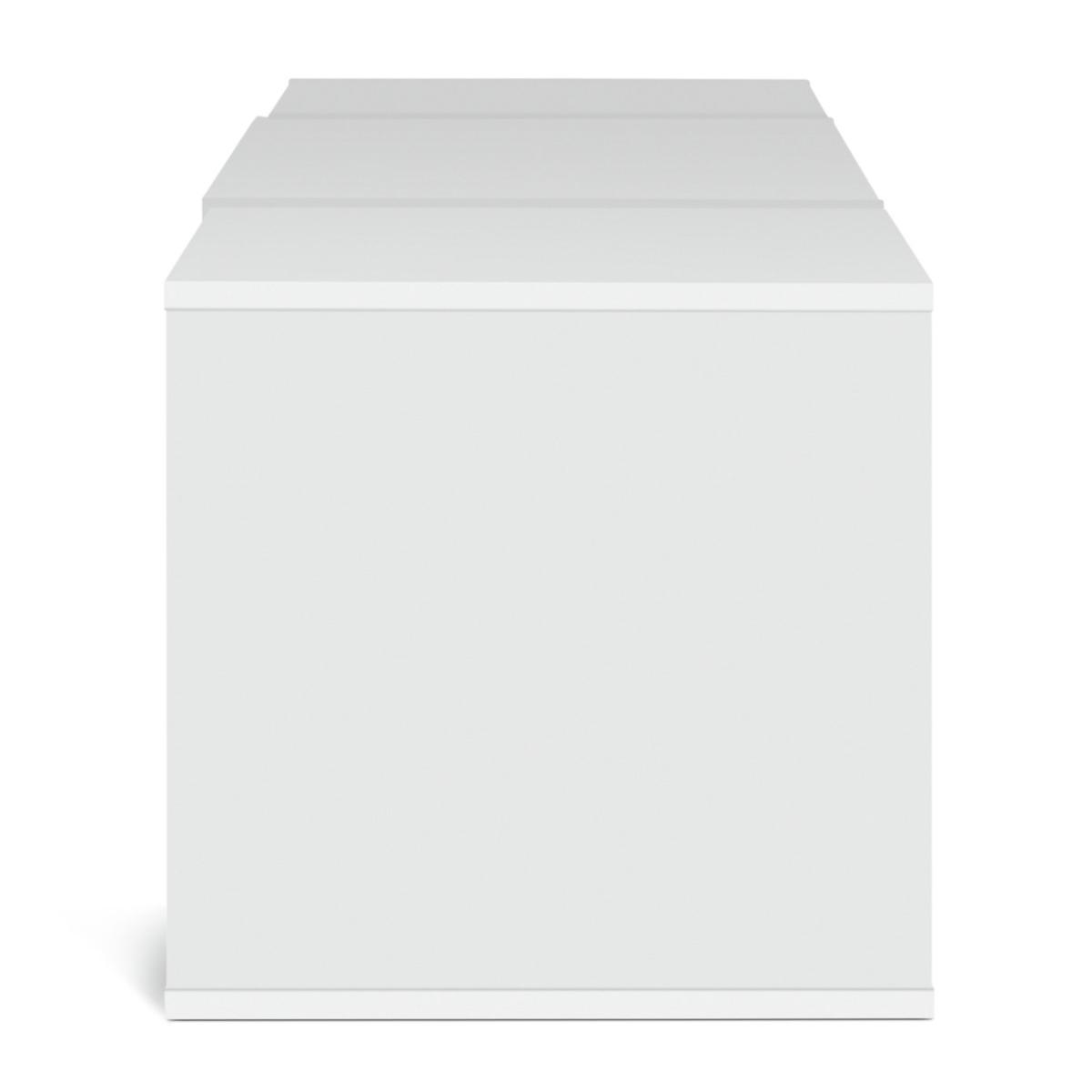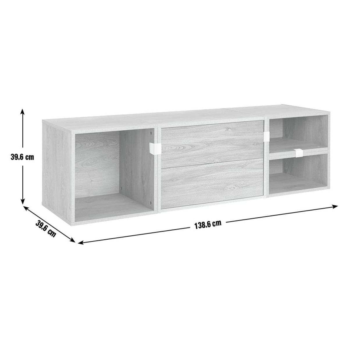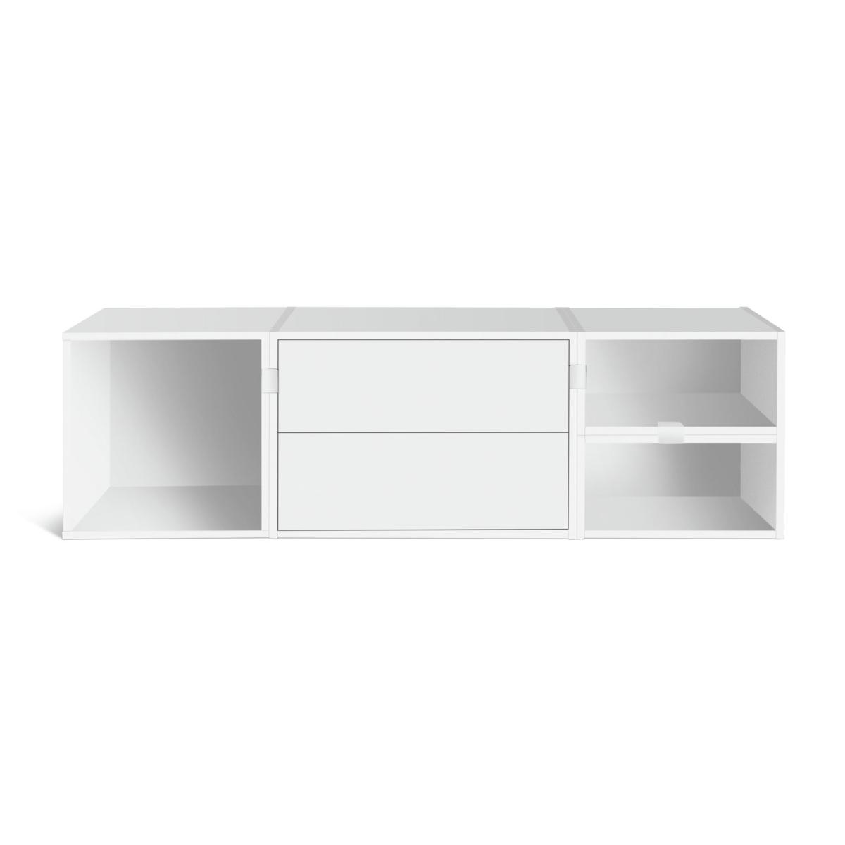 Create spaces that work for you with our modern modular TV unit. Designed to be personalised, you can configure the 4 modules, including shelves and 2 handleless soft close drawers, to suit your tech. A pure white backdrop completes the smooth minimalist look. Part of the Rubrics. Made from wood effect - white finish. Complete unit dimensions: H39.6, W138.6, D39.6cm. Weight 31.5kg. Package includes 4 modules with a total maximum load of75kg. Module details: 1 x (H39.7, W39.7, D39.7cm). 1 x (H39.7, W59.4, D39.7cm). 1 x (H39.7, W19.8, D39.7cm). 8 x metal fixing plates and fittings. 4 x wall fittings. Drawer module: 2 soft close drawers. Internal drawer dimensions H11.1, W51.1, D33.4cm. Package Dimensions: Package 1 dimensions: H7.6, W48.9, D42.2cm. Package 1 weight: 7.3kg. Package 2 dimensions: H12.7, W67.2, D42.2cm. Package 2 weight: 17.3kg. Package 3 dimensions: H7.6, W44.3, D42.2cm. Package 3 weight: 5.5kg. General Information: Packed flat - 2 people recommended. If the finished unit is over 60cm high it must be securely attached to the wall to prevent overturning. FSC certified meaning the materials used for this product are responsibly sourced. Manufacturer's 1 year guarantee.