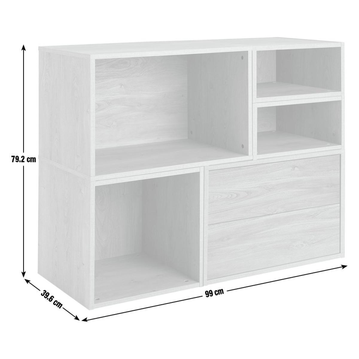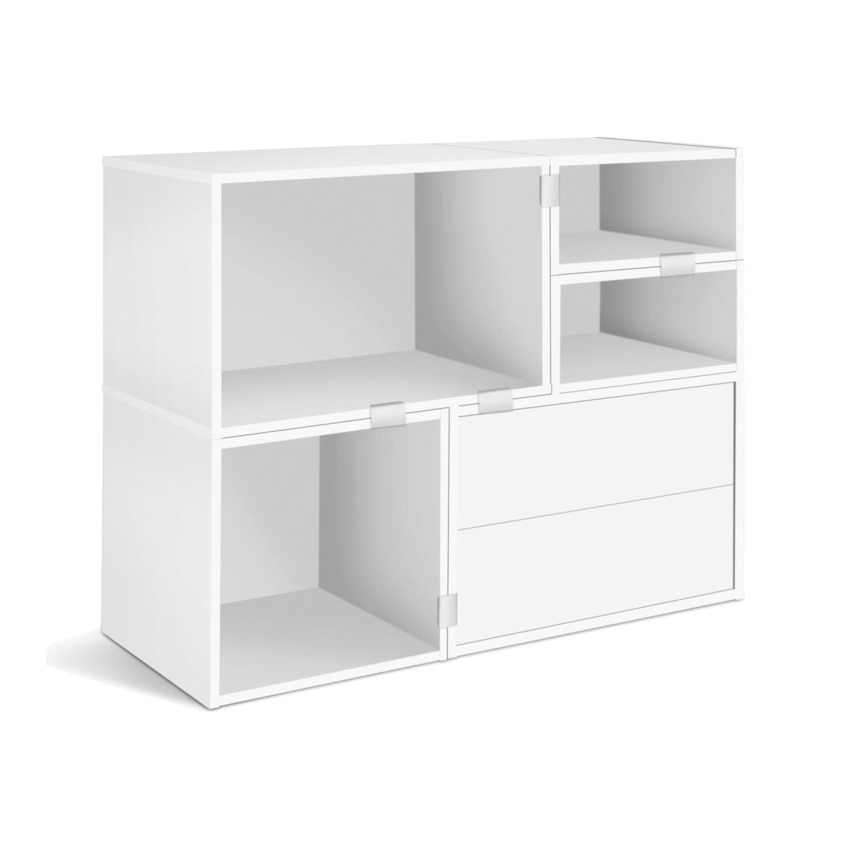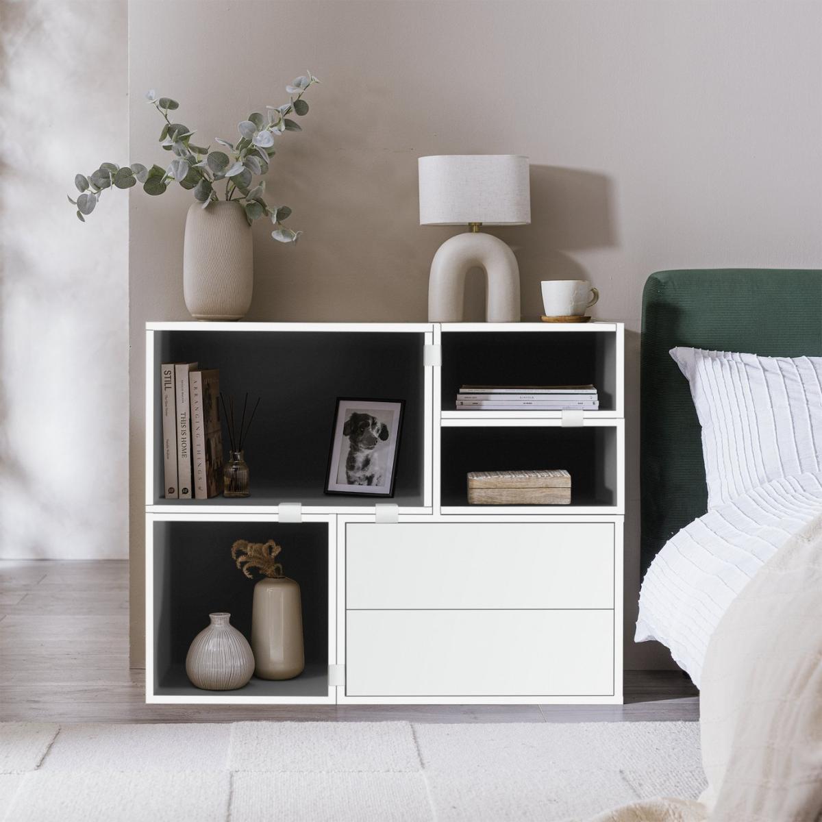 Create spaces that work for you with our wide modern modular bookcase. Designed to be personalised, you can configurate the various sized shelves into cubic areas to suit your display items. From photos to flowers, candles to collectables. All against a pure white backdrop. With 2 handleless soft close drawers, the smooth minimalist look is complete. Part of the Rubrics. Made from wood effect - white finish. Complete unit dimensions: H79.2, W99, D39.6cm. Weight 40kg. Package includes 5 modules with a total maximum load of75kg. Module details: 1 x (H39.7, W59.4, D39.7cm). 2 x (H39.7, W19.8, D39.7cm). 1 x (H39.7, W39.7, D39.7cm). 1 x (H39.7, W59.4, D39.7cm). 10 x metal fixing plates and fittings. 5 x wall fittings. Drawer module: 2 soft close drawers. Internal drawer dimensions H11.1, W51.1, D33.4cm. Package Dimensions: Package 1 dimensions: H7.6, W67.2, D42.2cm. Package 1 weight: 9.5kg. Package 2 dimensions: H7.6, W44.3, D42.2cm. Package 2 weight: 5.5kg. Package 3 dimensions: H7.6, W48.9, D42.2cm. Package 3 weight: 7.3kg. Package 4 dimensions: H7.6, W67.2, D42.2cm. Package 4 weight: 9.5kg. General Information: Packed flat - 2 people recommended. If the finished unit is over 60cm high it must be securely attached to the wall to prevent overturning. FSC certified meaning the materials used for this product are responsibly sourced. Manufacturer's 1 year guarantee.