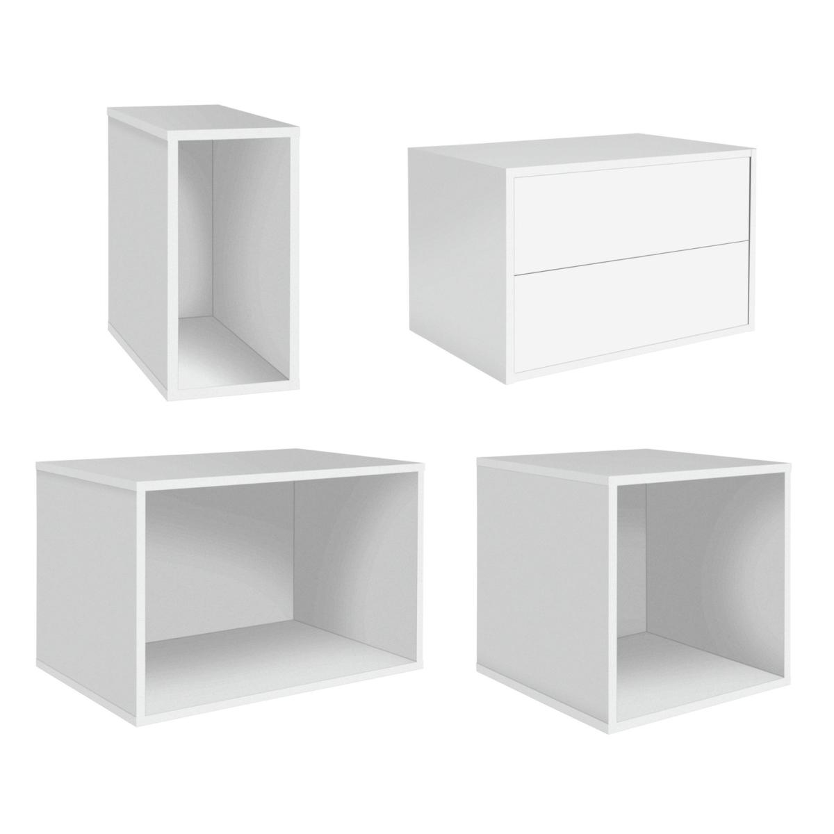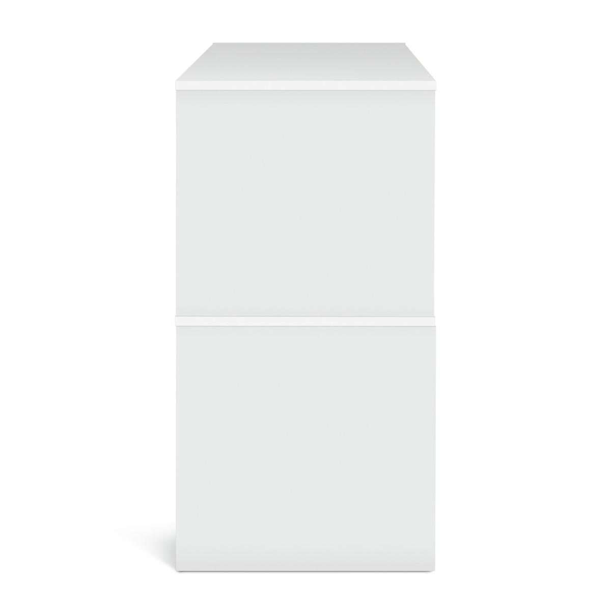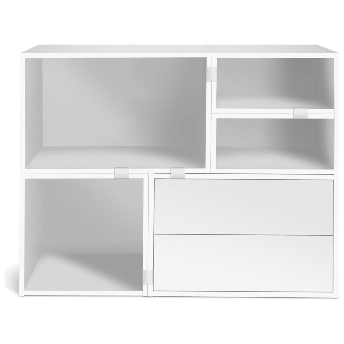 Create spaces that work for you with our wide modern modular bookcase. Designed to be personalised, you can configurate the various sized shelves into cubic areas to suit your display items. From photos to flowers, candles to collectables. All against a pure white backdrop. With 2 handleless soft close drawers, the smooth minimalist look is complete. Part of the Rubrics. Made from wood effect - white finish. Complete unit dimensions: H79.2, W99, D39.6cm. Weight 40kg. Package includes 5 modules with a total maximum load of75kg. Module details: 1 x (H39.7, W59.4, D39.7cm). 2 x (H39.7, W19.8, D39.7cm). 1 x (H39.7, W39.7, D39.7cm). 1 x (H39.7, W59.4, D39.7cm). 10 x metal fixing plates and fittings. 5 x wall fittings. Drawer module: 2 soft close drawers. Internal drawer dimensions H11.1, W51.1, D33.4cm. Package Dimensions: Package 1 dimensions: H7.6, W67.2, D42.2cm. Package 1 weight: 9.5kg. Package 2 dimensions: H7.6, W44.3, D42.2cm. Package 2 weight: 5.5kg. Package 3 dimensions: H7.6, W48.9, D42.2cm. Package 3 weight: 7.3kg. Package 4 dimensions: H7.6, W67.2, D42.2cm. Package 4 weight: 9.5kg. General Information: Packed flat - 2 people recommended. If the finished unit is over 60cm high it must be securely attached to the wall to prevent overturning. FSC certified meaning the materials used for this product are responsibly sourced. Manufacturer's 1 year guarantee.