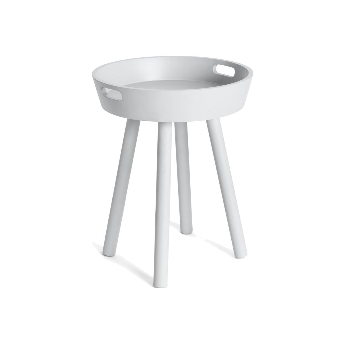 A side of style, please. Our neat Rue Side Table is all about the minimalistic aesthetic. Finished in a high gloss snowfall white lacquer it features a round tray style top and splayed legs. Cut-out handles makes this versatile little table easy to move. A handy bit of furniture to have by an armchair or even next to your bed. Very smart, very useful.