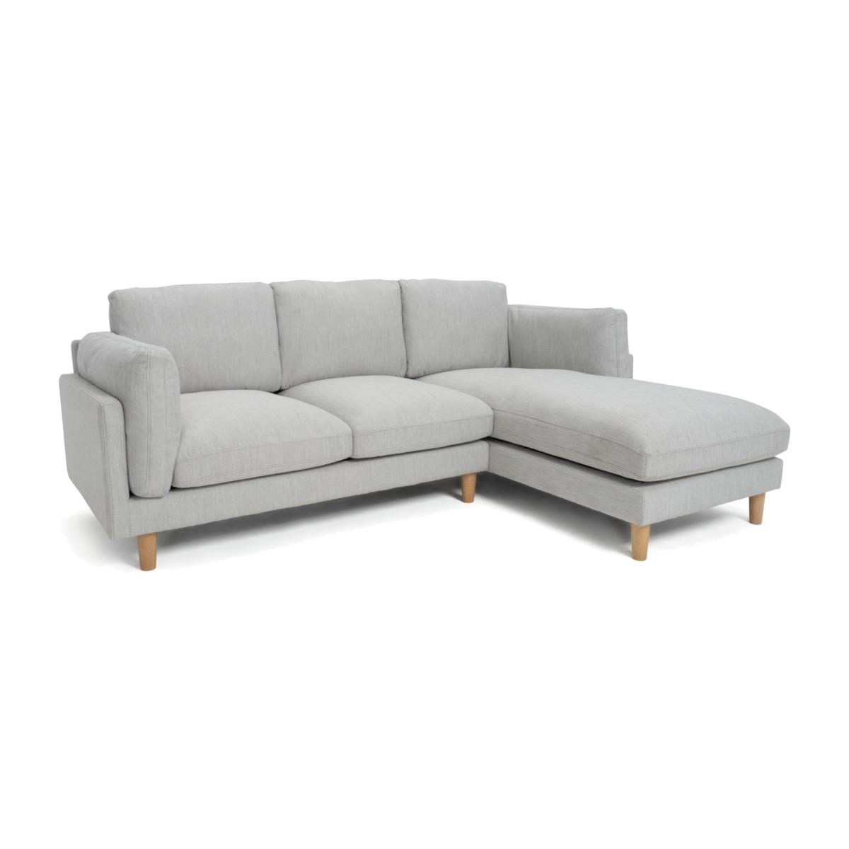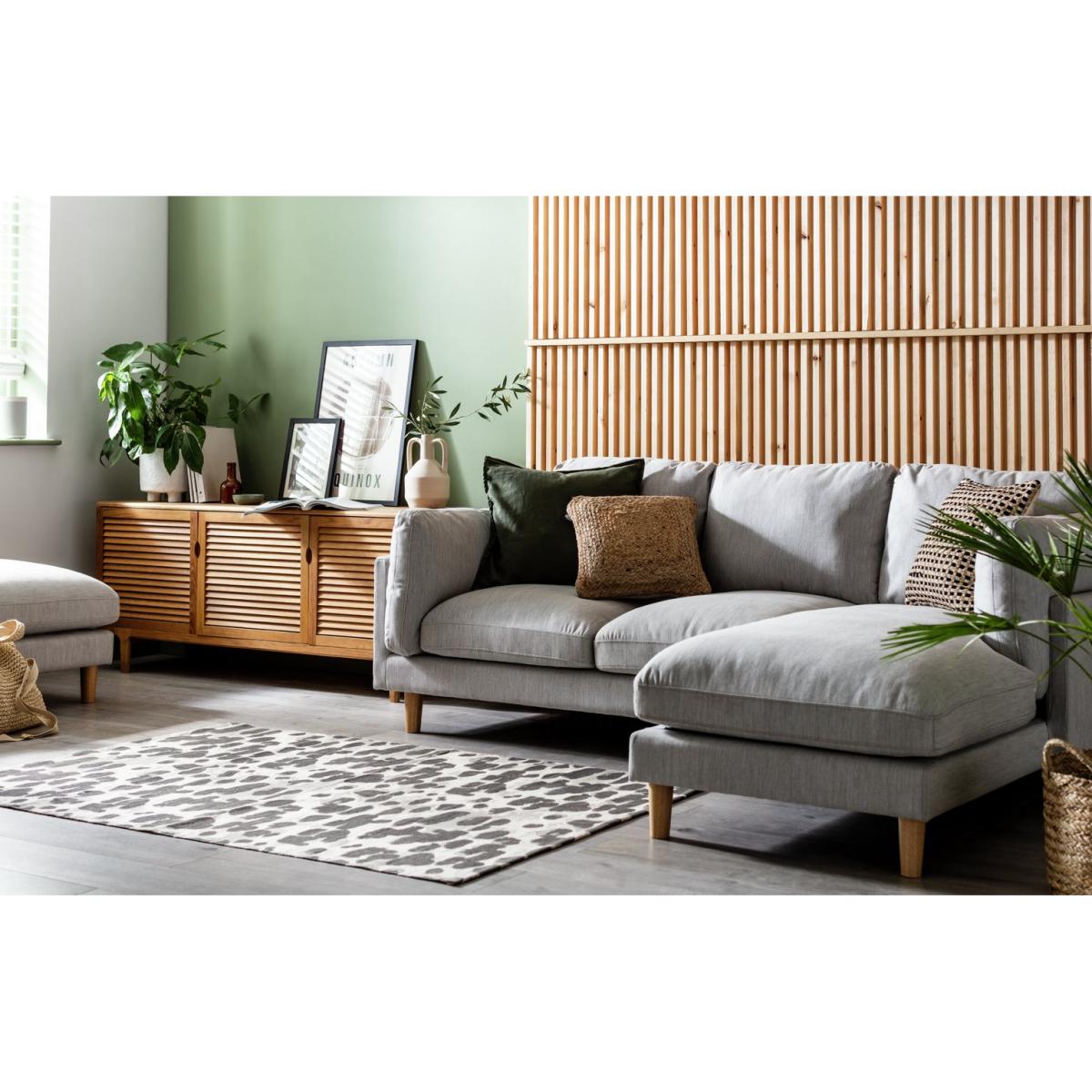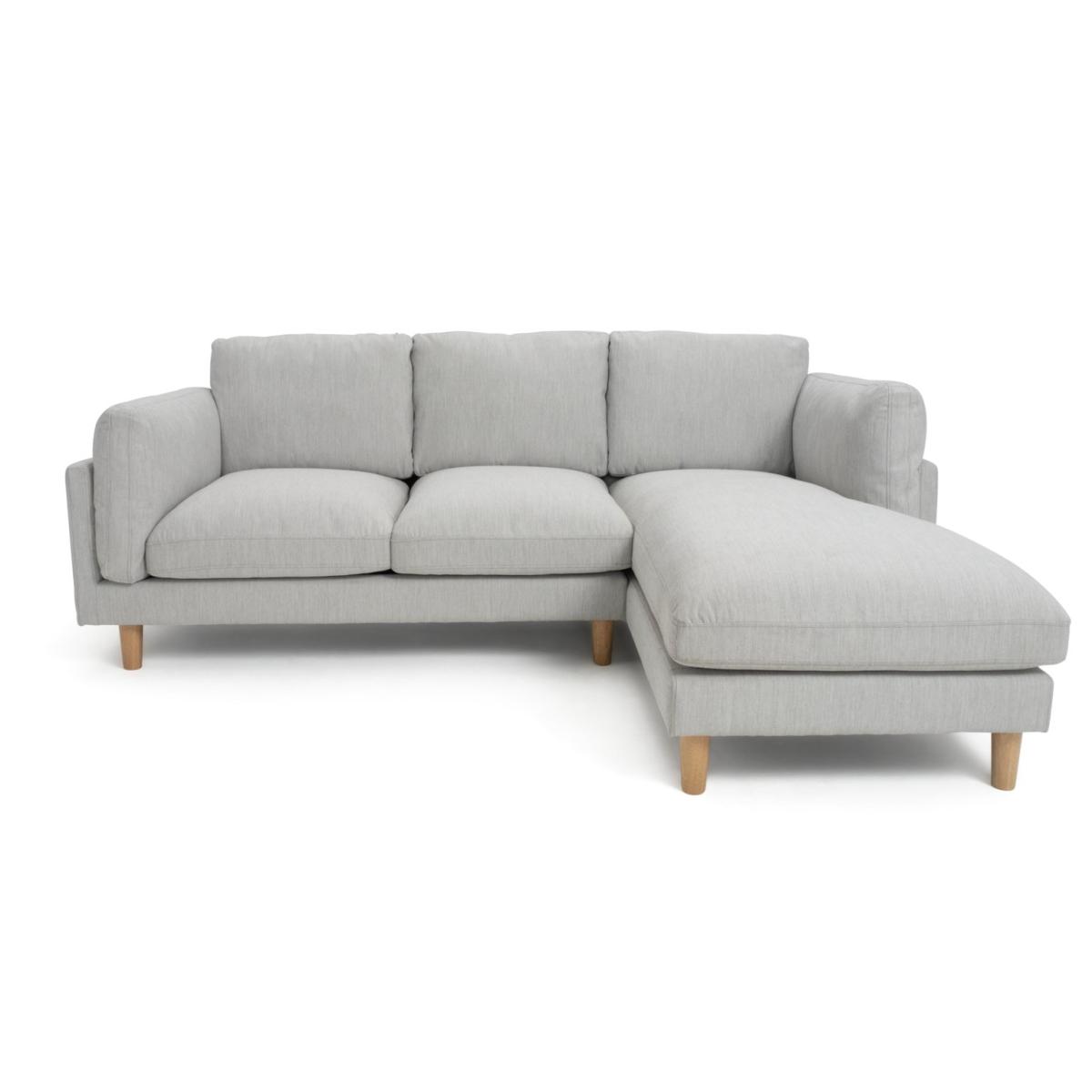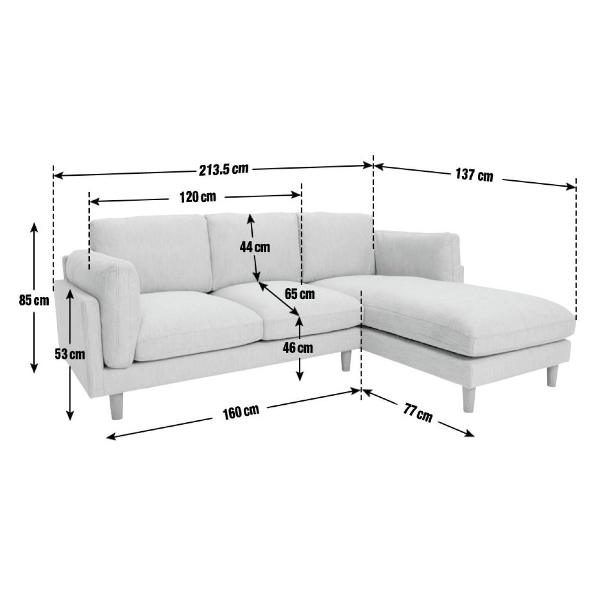 Plumptious perching. Some sofas are so relaxing they're very hard to leave. Like our Salome chaise right corner sofa. Upholstered in light grey herringbone fabric, the sumptuously sink-in seat and back cushions are softly inviting. And natural wooden legs to add to this 3-seater's contemporary good looks. Whether you're sitting or stretching out, this is one comfy corner chaise. Want to make your corner even cosier? We've lots of rugs and floor lamps that will be happy to oblige. Part of the Salome collection. Right hand corner. Material: Herringbone fabric - 100% polyester. Wooden feet. Removable seats with foam fibre wrap filling. Removable cushion(s) with foam fibre wrap filling. Free fabric swatch available on this line. Dimensions: Size H85, longer width 213.5, shorter width 120, D160cm. Floor to seat height: 46cm. Depth of seat: 65cm. Height of seat back: 44cm. Shorter seating area width between arms: 77cm. Longer seating area width between arms: 137cm. Height of arm rest: 53cm. Overall weight 49kg. Dust or wipe with a damp cloth only. Plump cushions regularly to maintain shape. Minimal assembly. Maximum individual user weight 200kg. Packaged dimensions: Package size H53.5, W87, D139cm. Second package size H53.5, W79, D160cm. General information: We are excited to be welcoming some of our favourite HOME products into the Habitat range. Your product may arrive in Habitat or HOME packaging. Manufacturer's 10 year frame guarantee. FSC certified meaning the materials used for this product are responsibly sourced.
