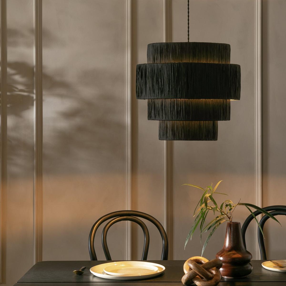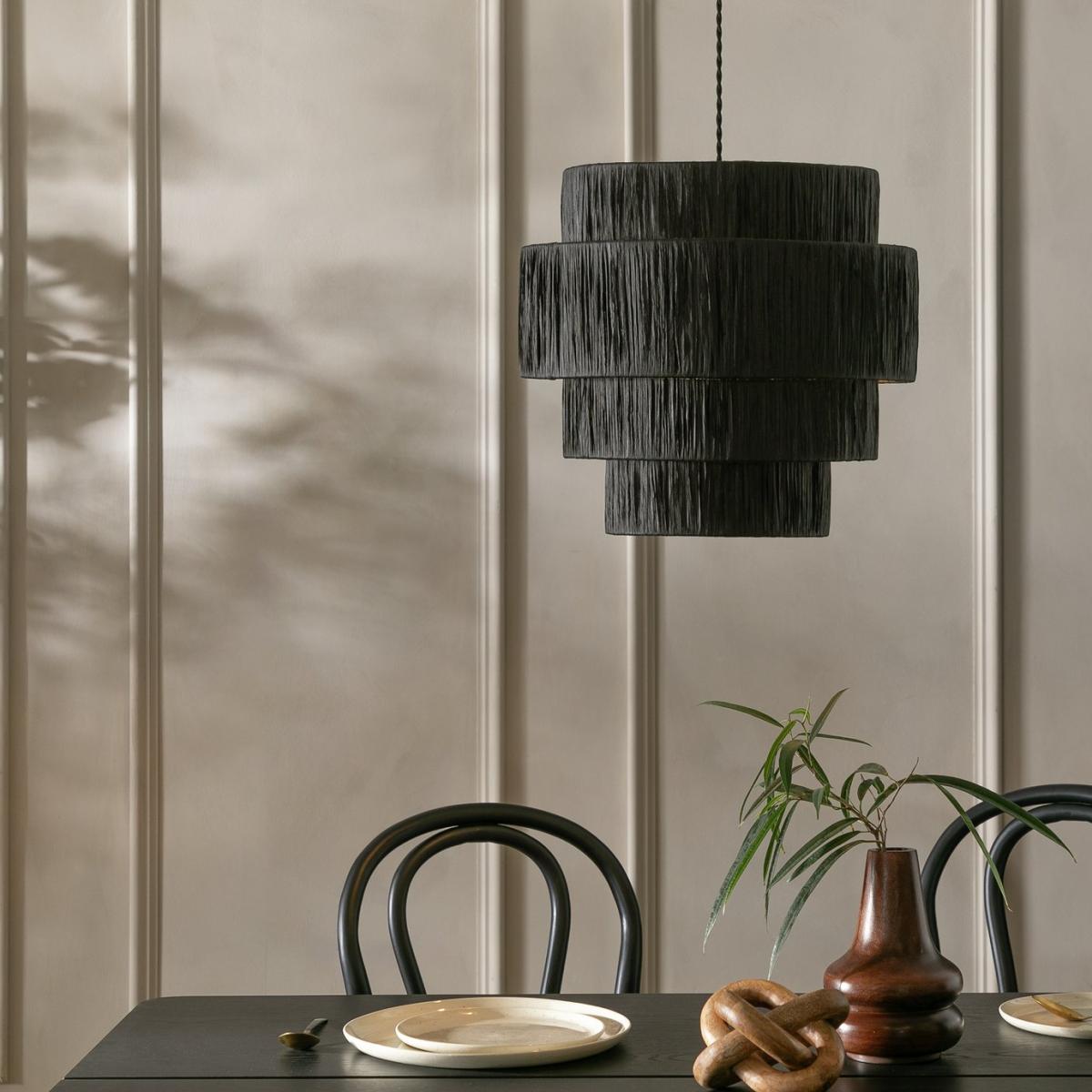 It's only natural to fall in love with our Salto 4 tier shade. Crafted by hand featuring black raffia paper wrapped around a metal frame. This multi-layered pendant shade will bring an organic texture to your space. An instant mood-setter. Size H36cm, Diameter 40cm. Recommended maximum bulb wattage 15 watts. Minimal assembly. Easy fit shade. Manufacturer's 1 year guarantee.