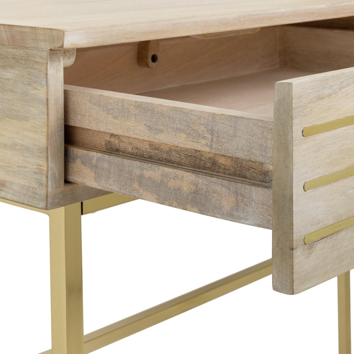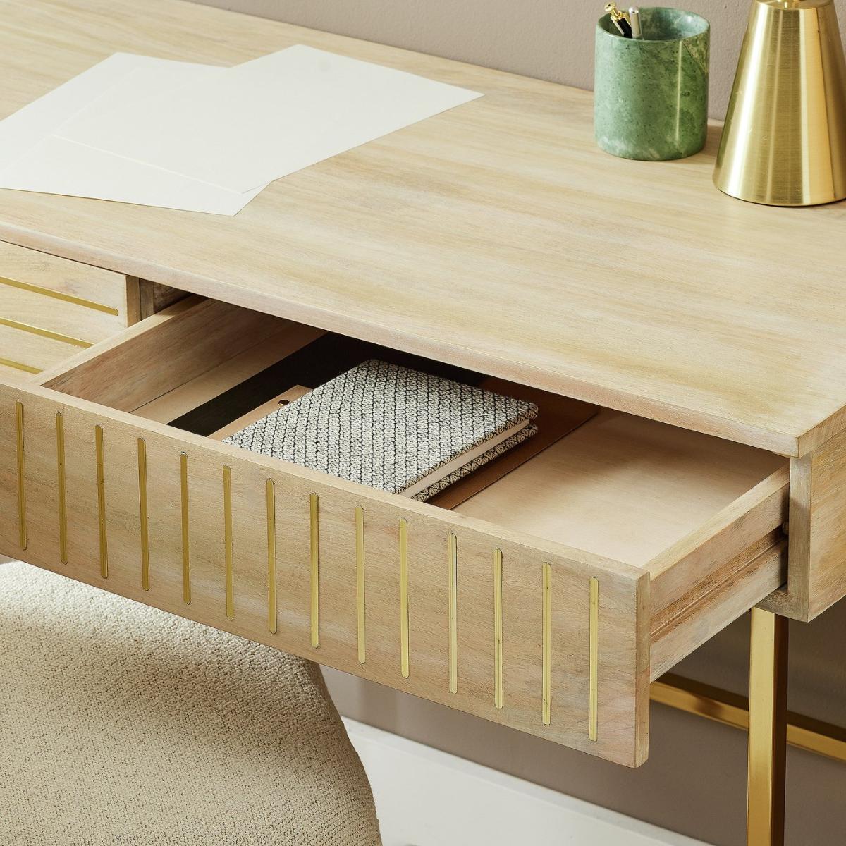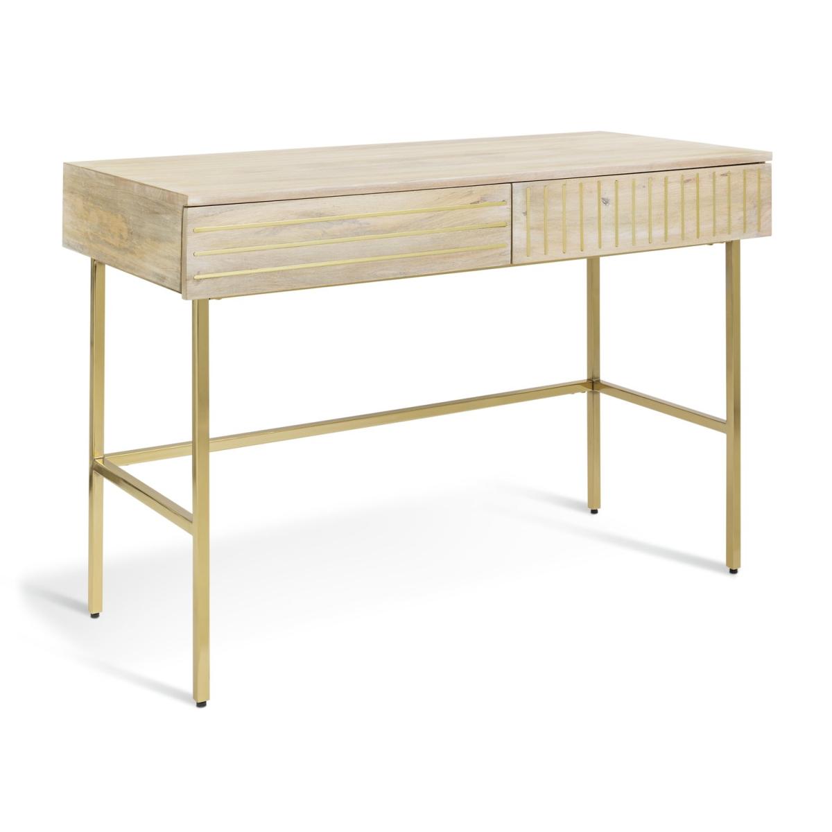 Who's for a practical desk with a gleaming luxe touch? Thought so. Samara has more than its fair share of glamour. Inlays of golden steel are artistically bonded into whitewashed mango wood. With plenty of space on top for a computer and 2 easy-glide drawers for stationery and essentials. Golden handles and legs complete the look. Part of the Samara collection. Made from solid wood and steel. 2 drawers with wooden runners. Easy cable access. Self-assembly - 1 person recommended. Wall fixing recommended. If this product is over 60cm high it must be securely attached to the wall to prevent overturning. General information: Manufacturer's 1 year guarantee. Dimensions: Size H76, W115, D50cm. Maximum load capacity of desk 15kg. Weight 22.35kg. Packaged dimensions: Package dimensions H58, W122, D35.5cm.